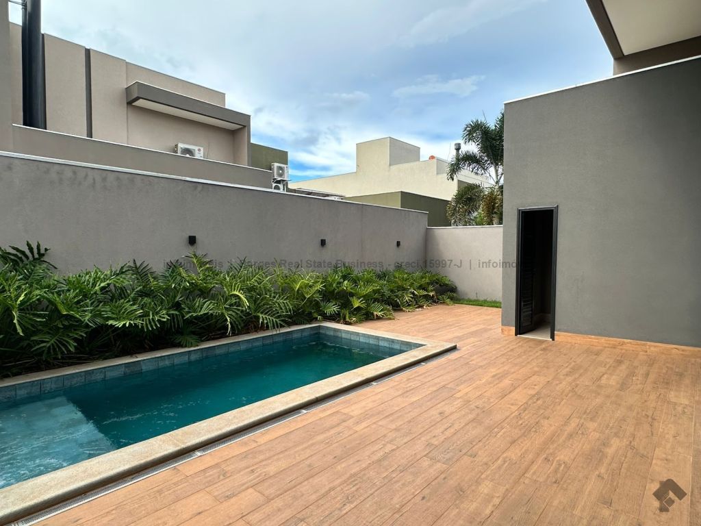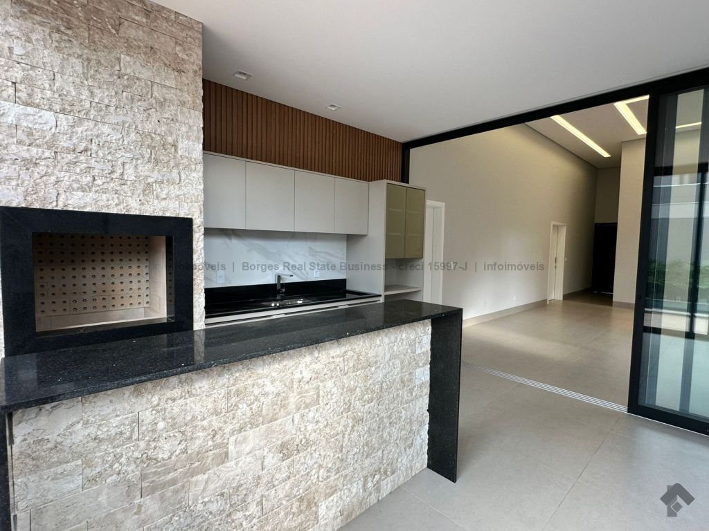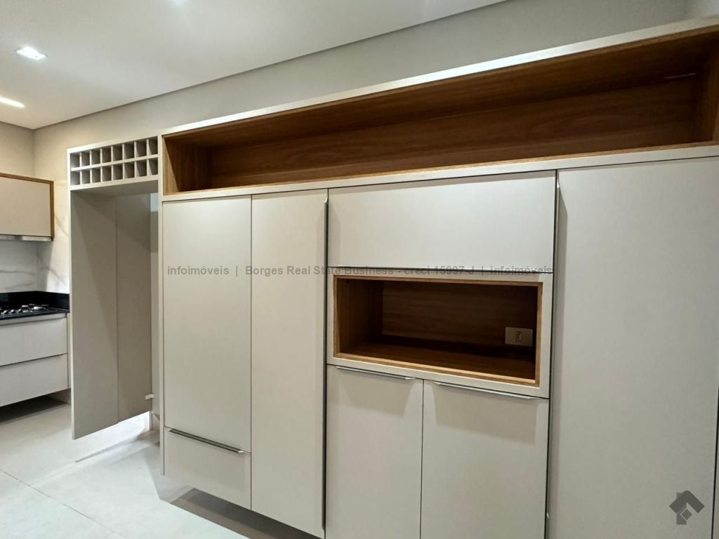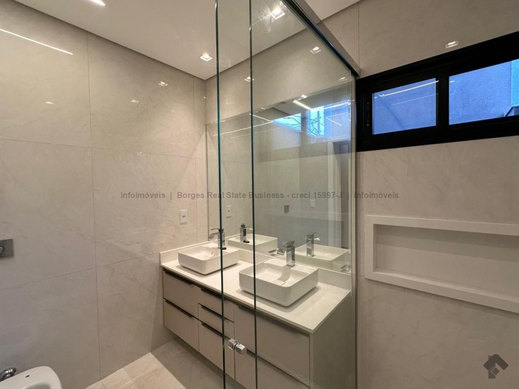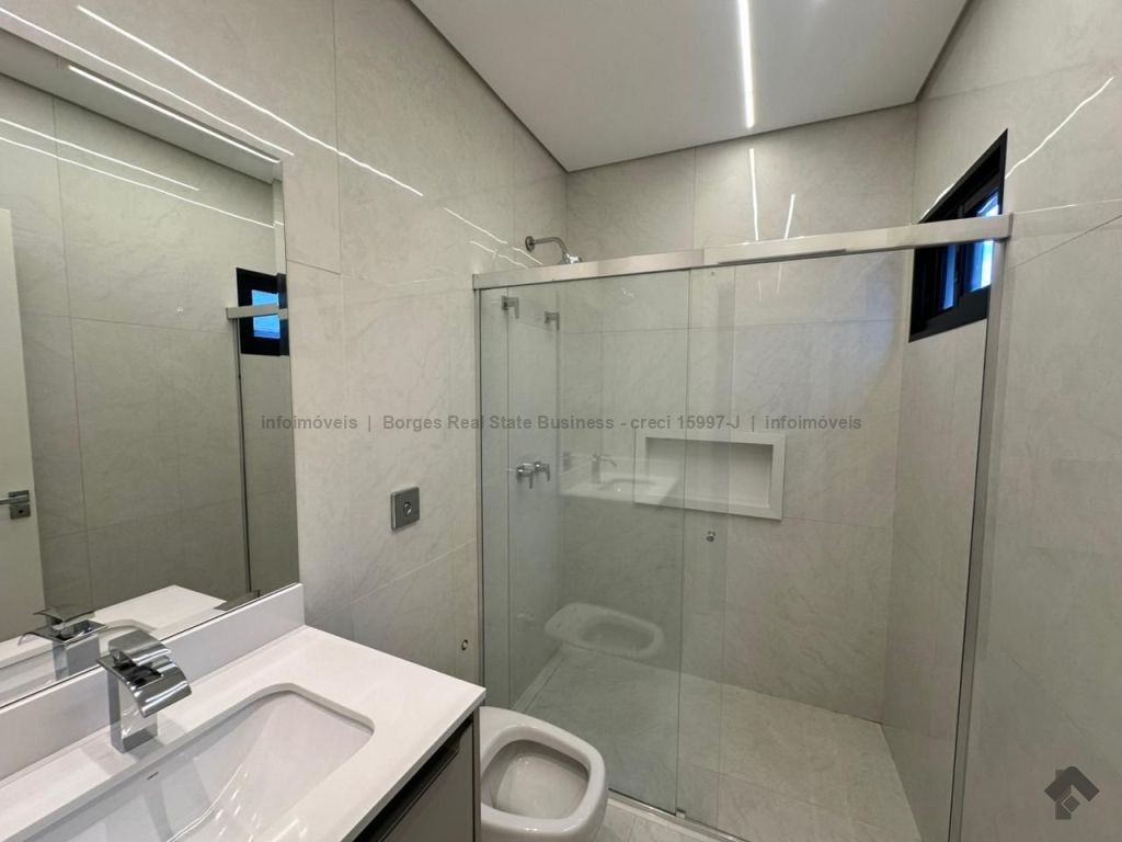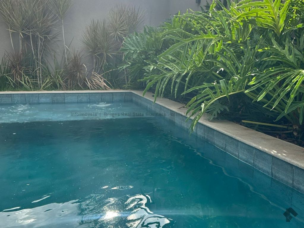 Sala para dois ambientes com pé direito duplo, cozinha com planejados, área gourmet fechada com churrasqueira e ilha, piscina aquecida com cascata e banheiro da piscina.