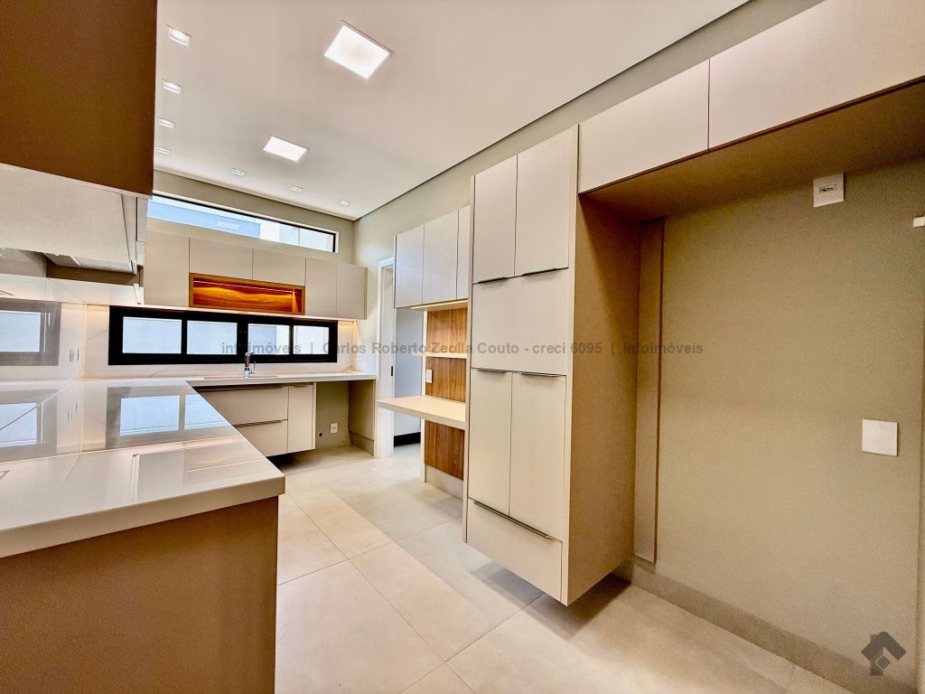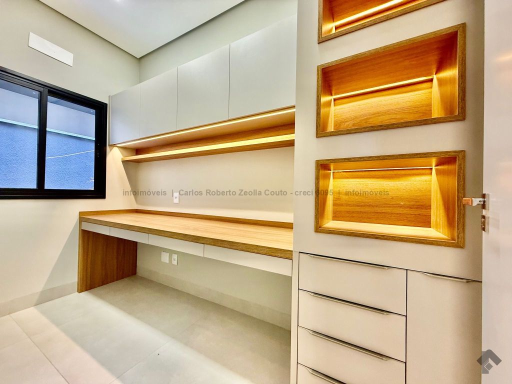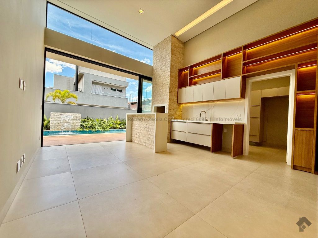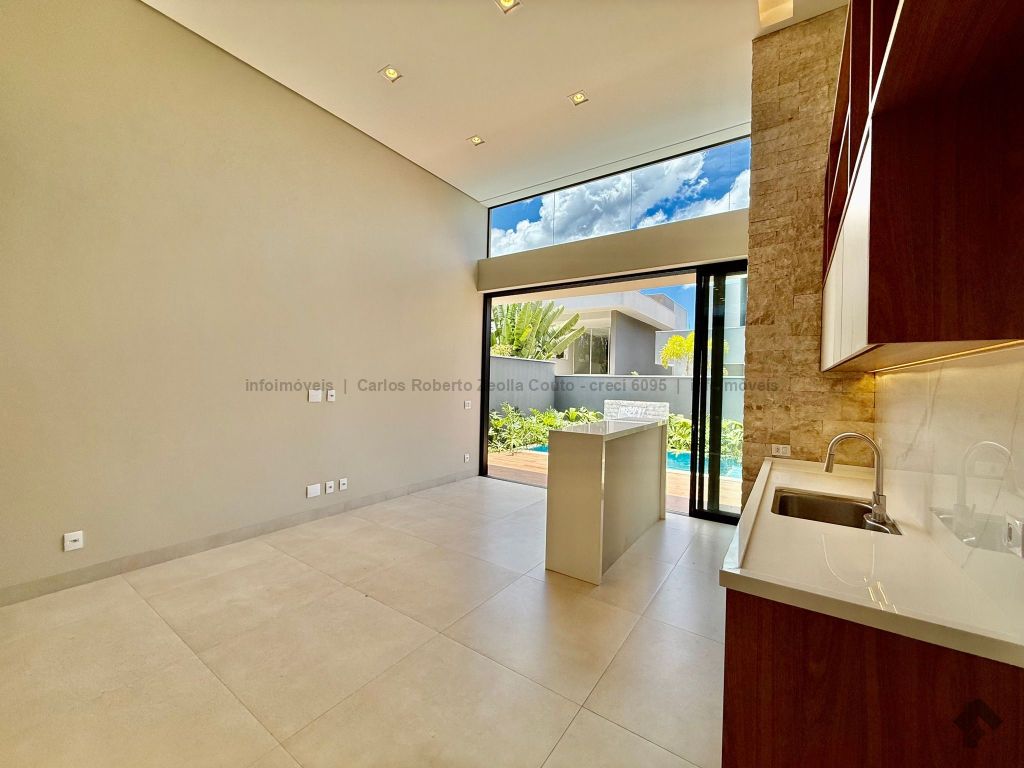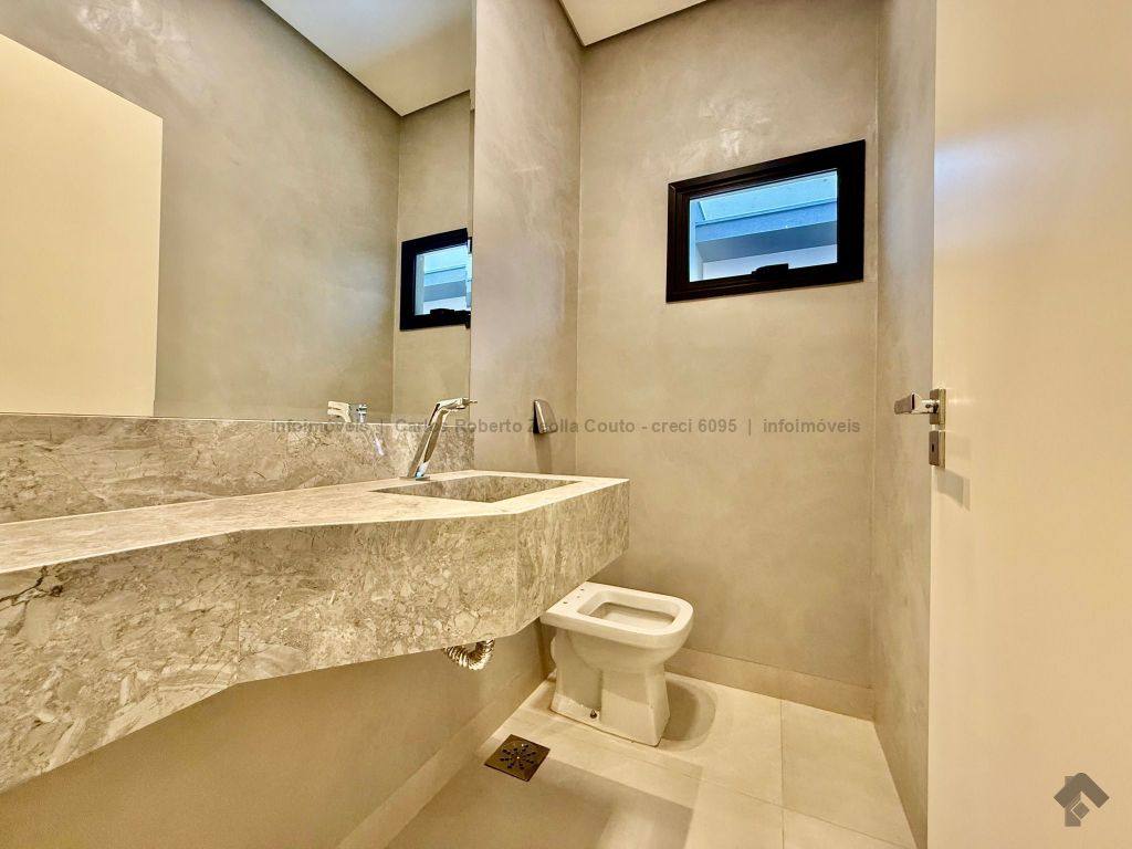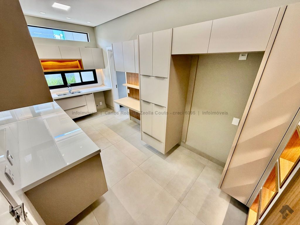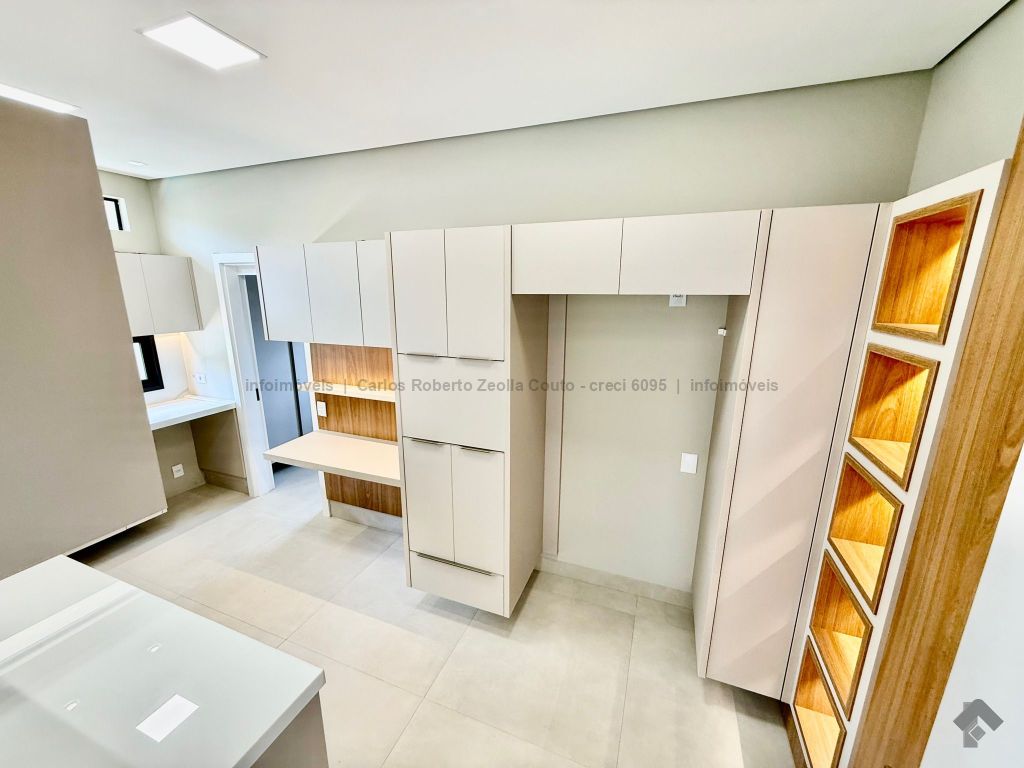 Lavabo, escritório com armários, sala para 02 ambientes com pé direito duplo amplo e com integração total com a área gourmet, esquadrias totalmente embutidas, cozinha individual com armários, gourmet amplo com armários, piscina com cascata e com preparação para aquecimento, WC/piscina, WC de serviço no corredor lateral, 03 suítes, sendo 01 master com closet, cuba dupla e chuveiro duplo.