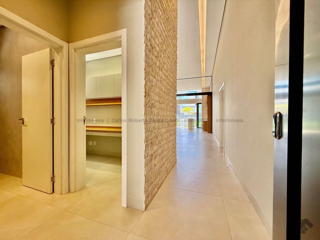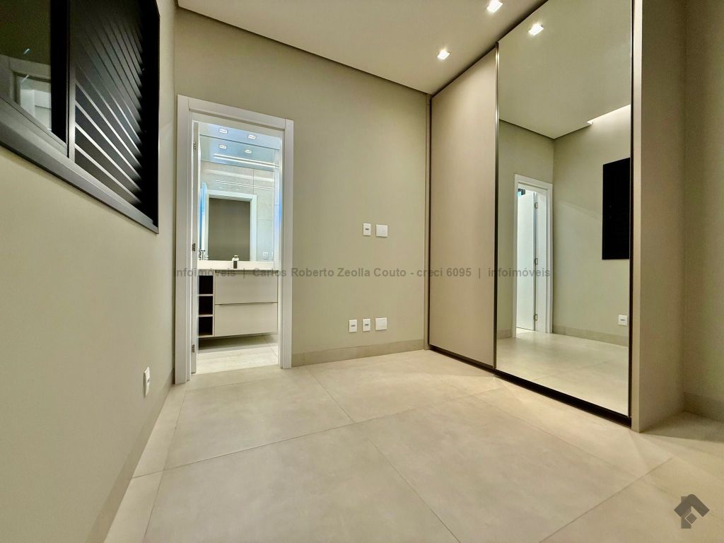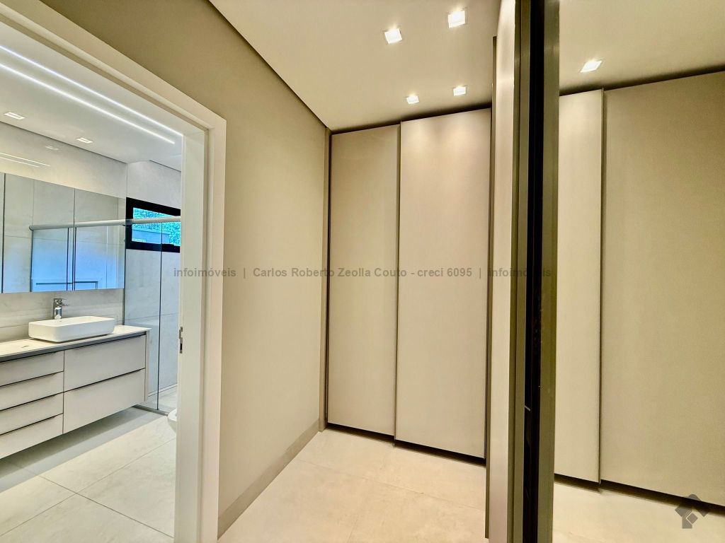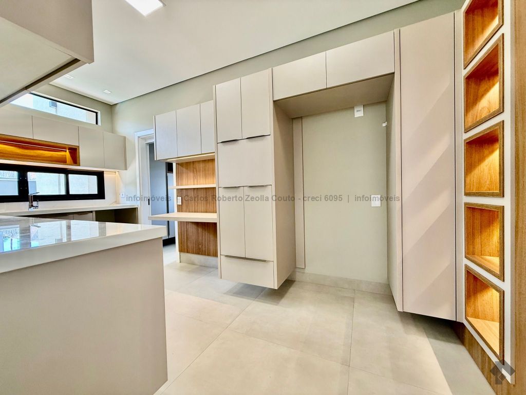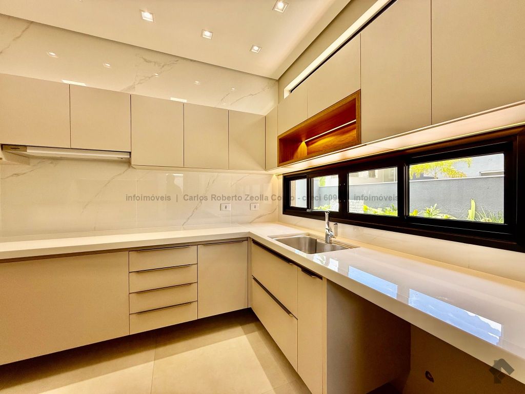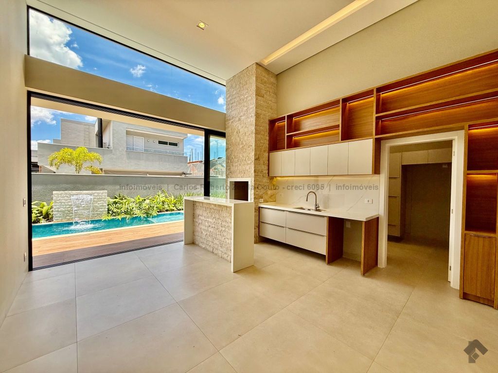 Lavabo, escritório com armários, sala para 02 ambientes com pé direito duplo amplo e com integração total com a área gourmet, esquadrias totalmente embutidas, cozinha individual com armários, gourmet amplo com armários, piscina com cascata e com preparação para aquecimento, WC/piscina, WC de serviço no corredor lateral, 03 suítes, sendo 01 master com closet, cuba dupla e chuveiro duplo.