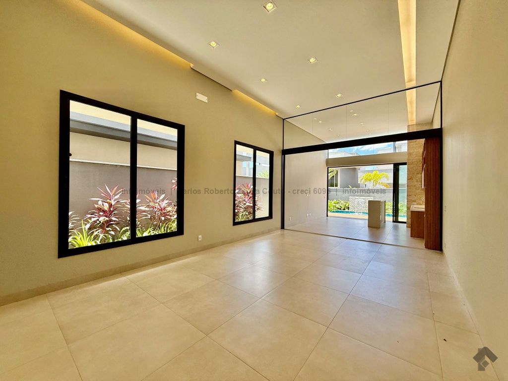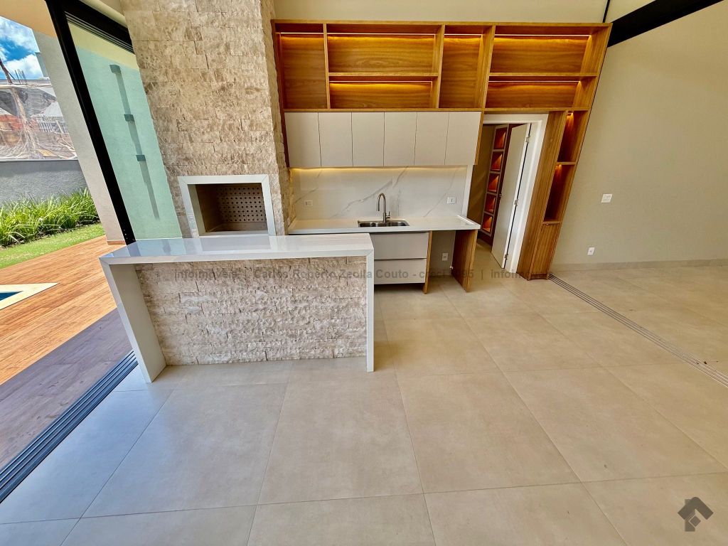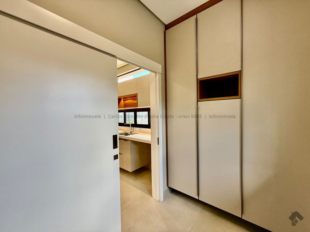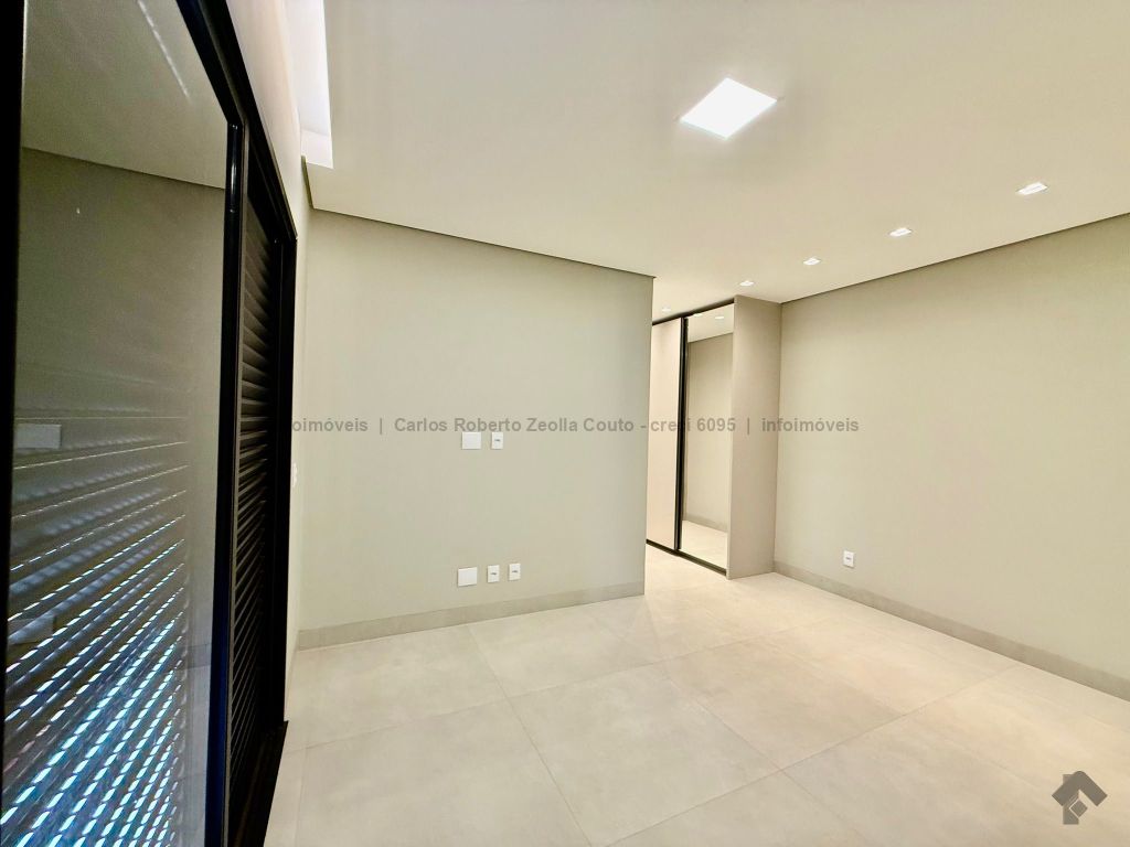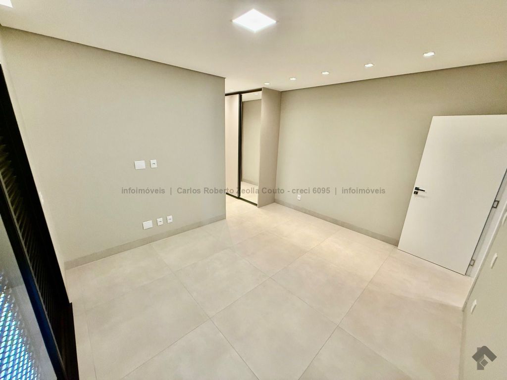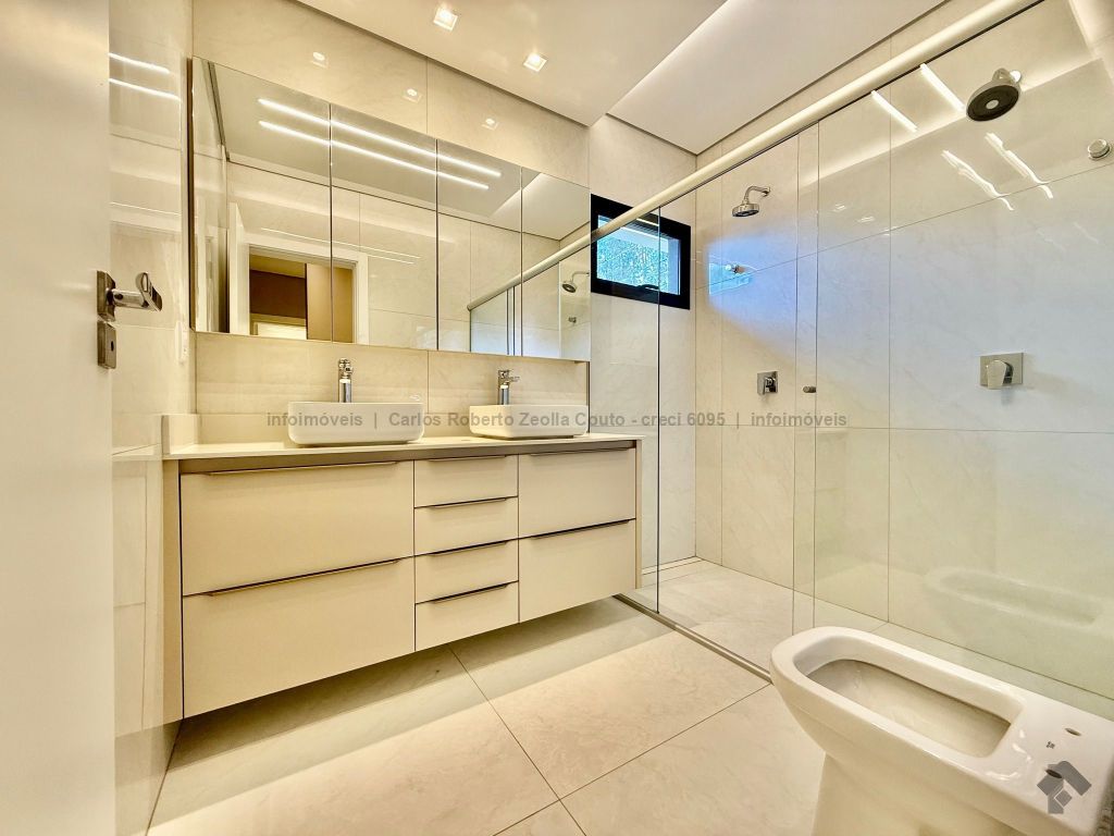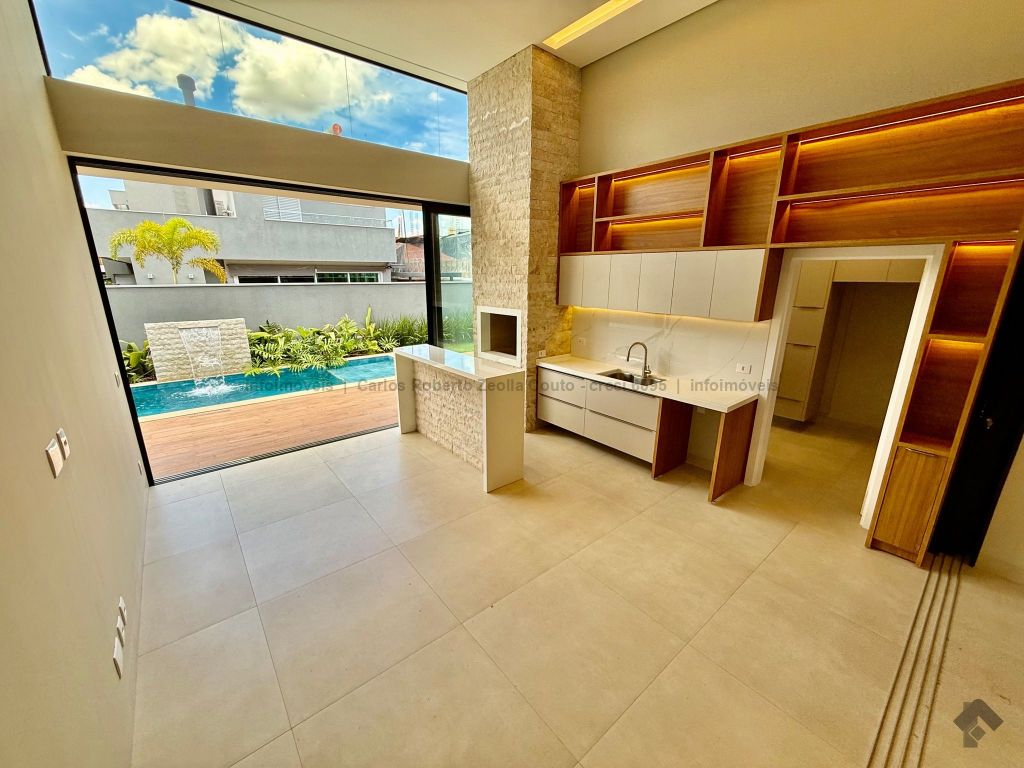 Lavabo, escritório com armários, sala para 02 ambientes com pé direito duplo amplo e com integração total com a área gourmet, esquadrias totalmente embutidas, cozinha individual com armários, gourmet amplo com armários, piscina com cascata e com preparação para aquecimento, WC/piscina, WC de serviço no corredor lateral, 03 suítes, sendo 01 master com closet, cuba dupla e chuveiro duplo.