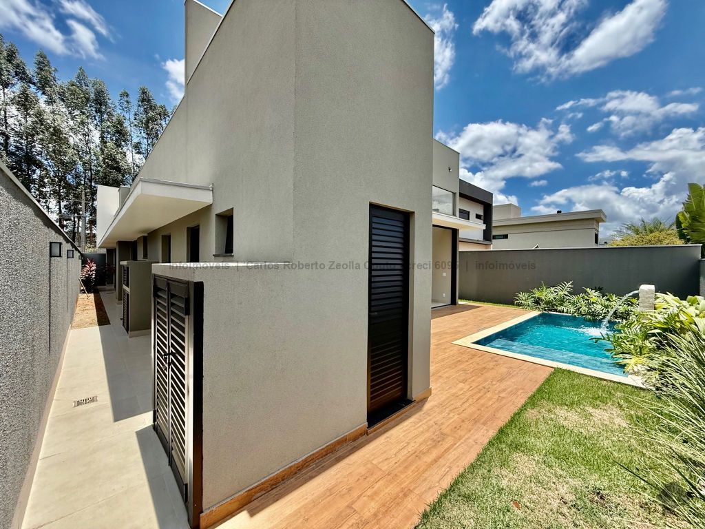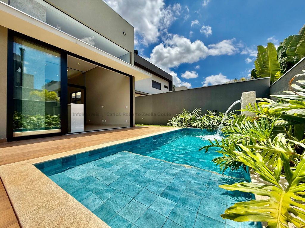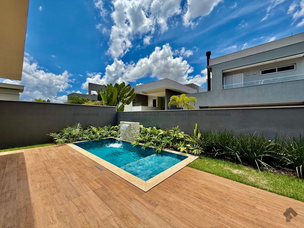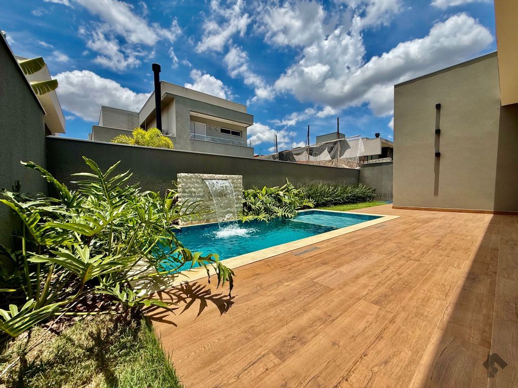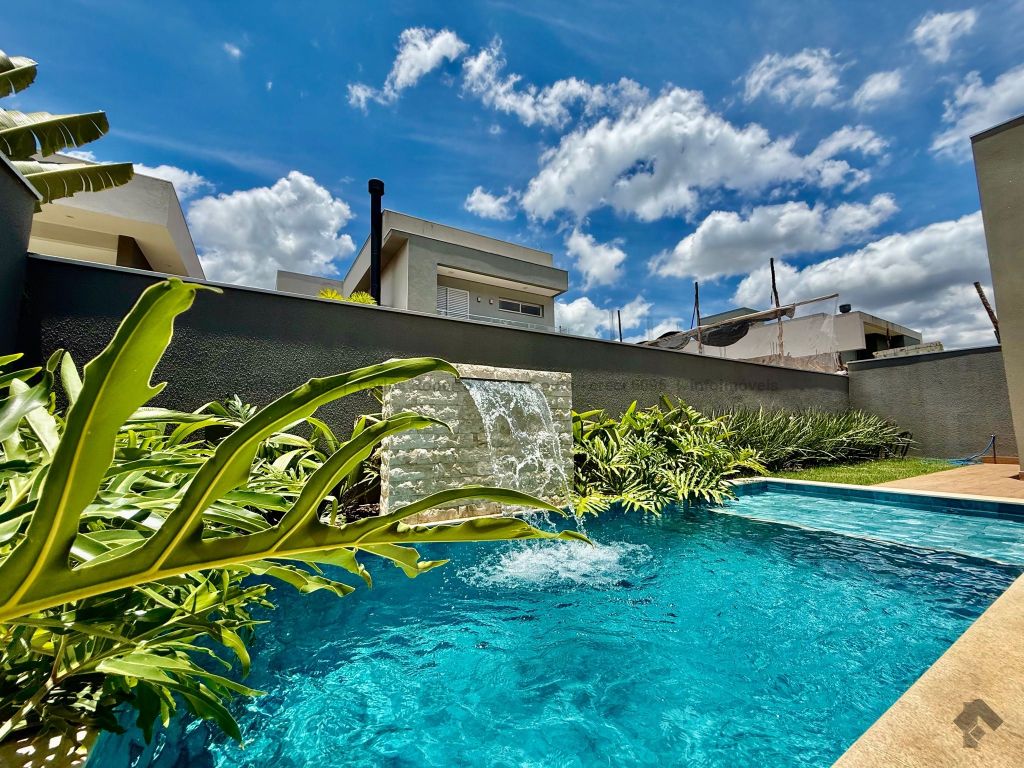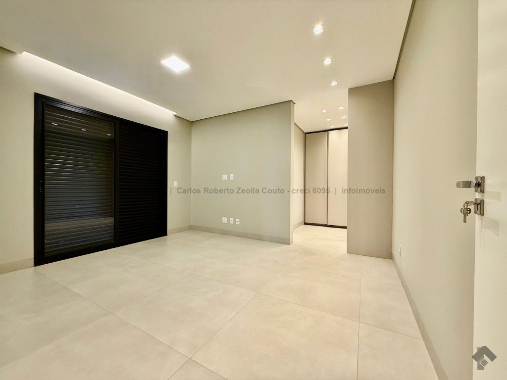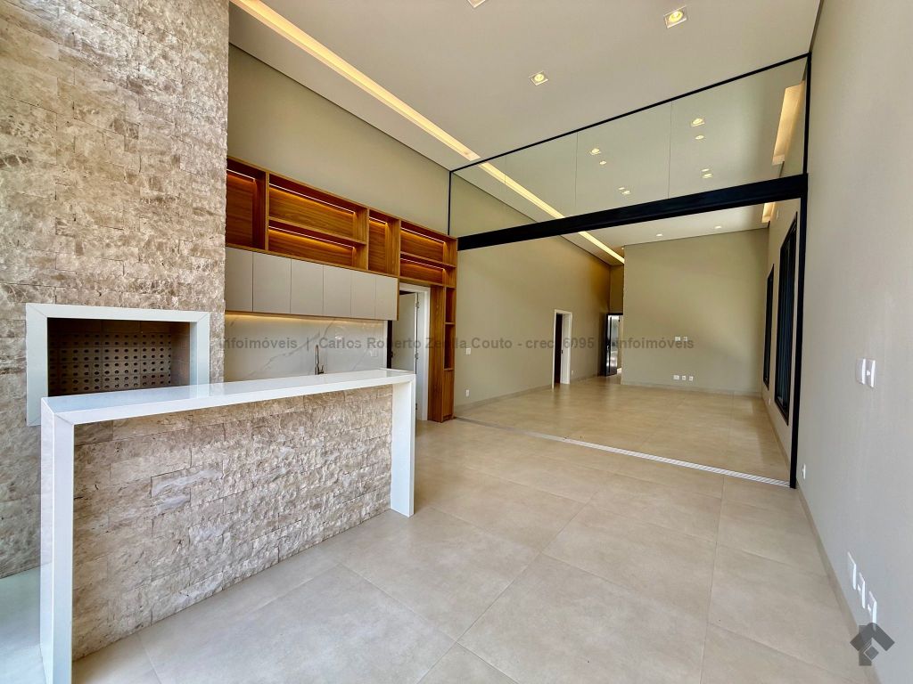 Lavabo, escritório com armários, sala para 02 ambientes com pé direito duplo amplo e com integração total com a área gourmet, esquadrias totalmente embutidas, cozinha individual com armários, gourmet amplo com armários, piscina com cascata e com preparação para aquecimento, WC/piscina, WC de serviço no corredor lateral, 03 suítes, sendo 01 master com closet, cuba dupla e chuveiro duplo.