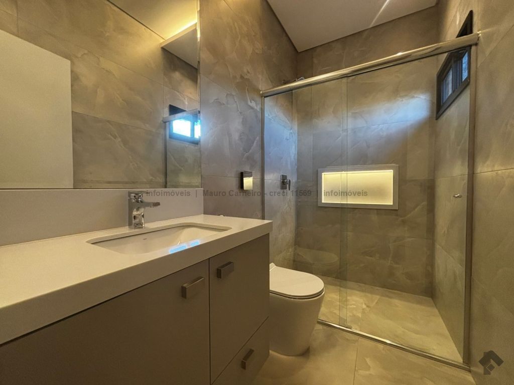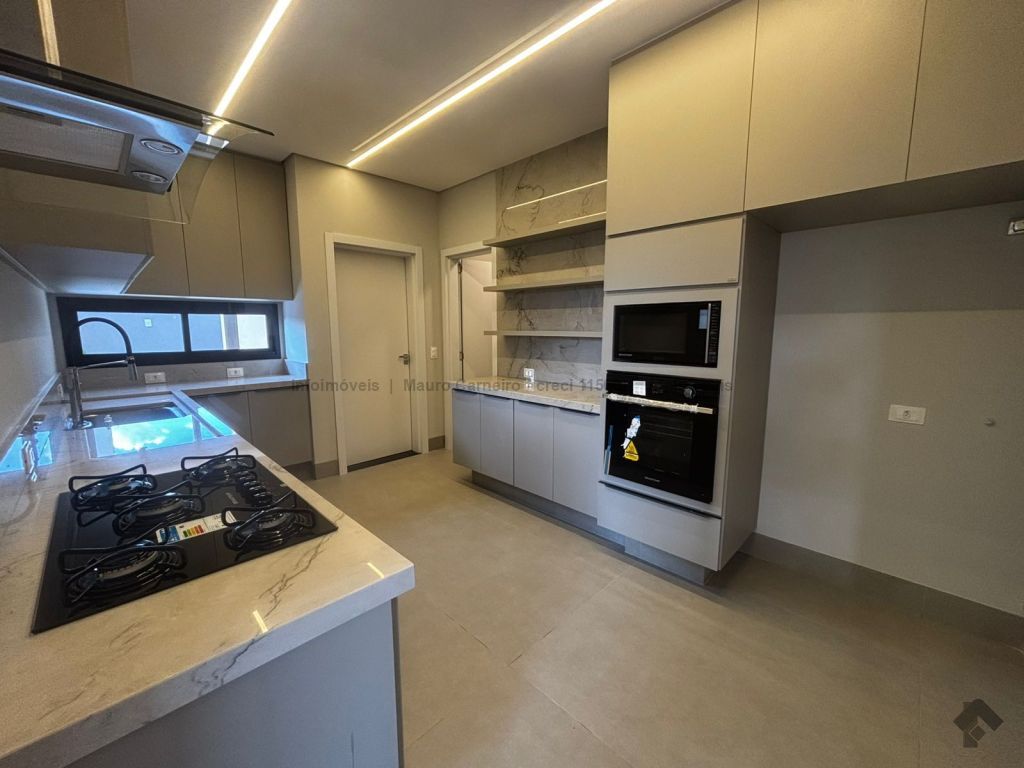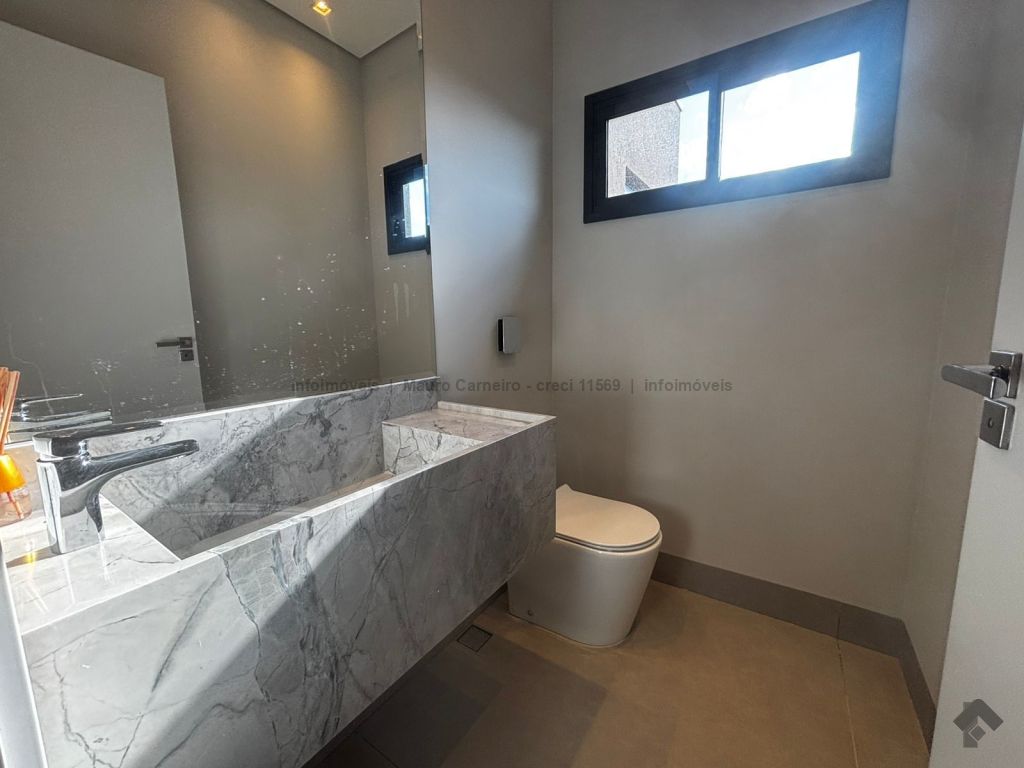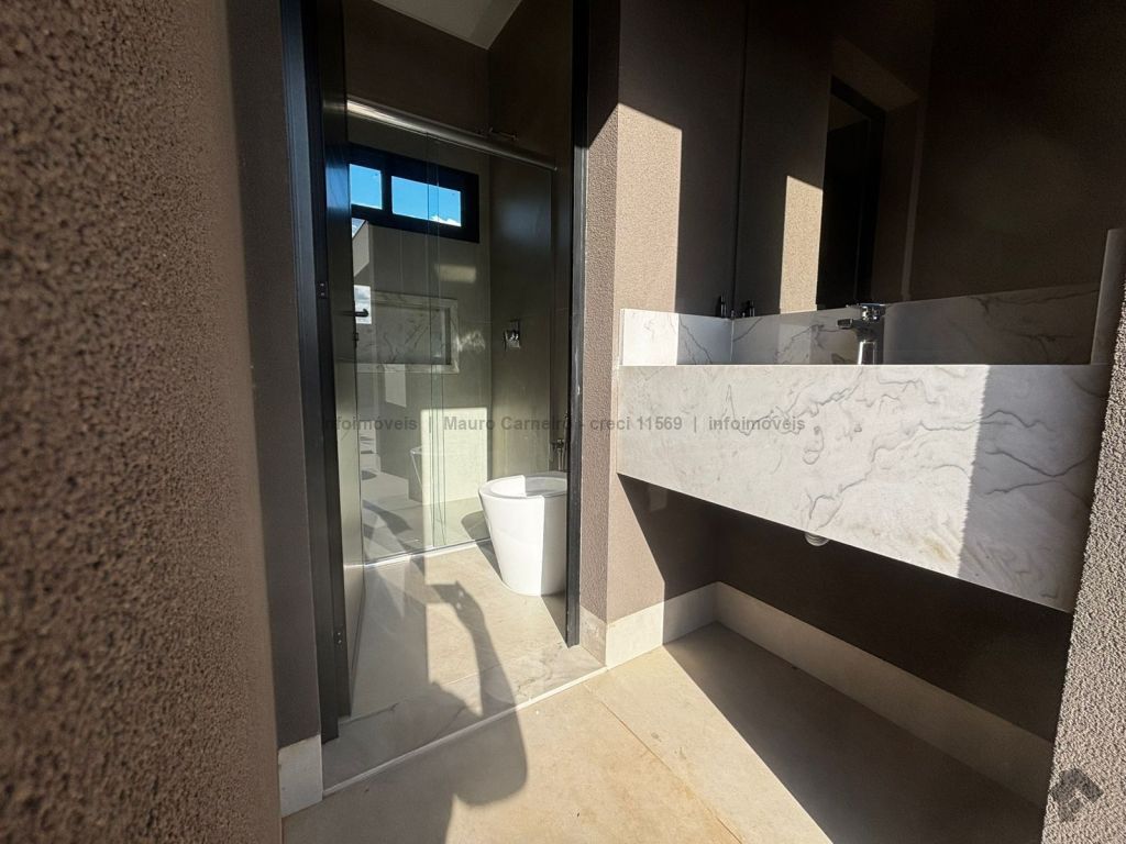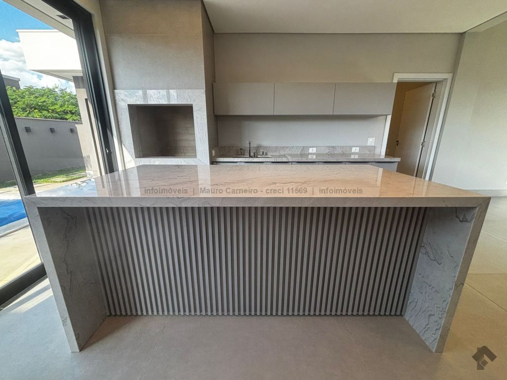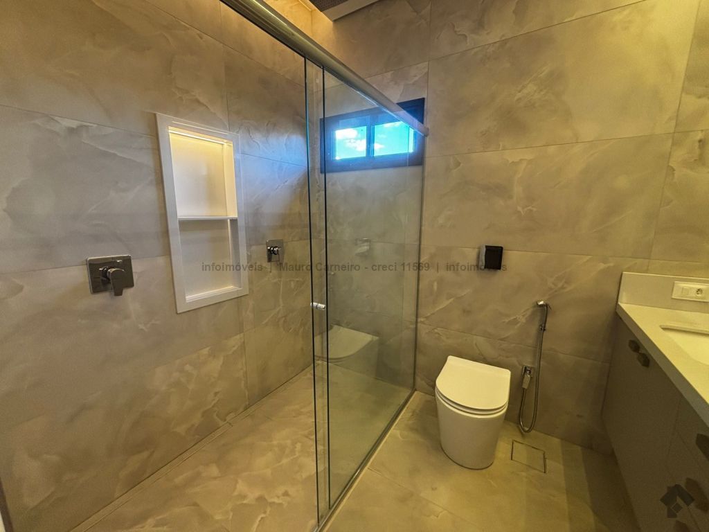Com fachada moderna e um projeto arquitetônico que privilegia a iluminação natural, com uma sala ampla para dois ambientes, com pé-direito duplo, lavabo e escritório, e cozinha individualizada equipada, com bancada em quartzo Mont Blanc, móveis planejados e eletrodomésticos embutidos, incluindo coifa, cooktop, forno, micro-ondas e lava-louças, despensa e lavanderia funcional. O espaço gourmet é completo em armários e com cervejeira. A piscina aquecida, com hidromassagem, iluminação em LED e revestimento em pedra natural Aquamarine. Na área íntima, são três suítes, todas com ar-condicionado, armários planejados e persianas automatizadas blackout.