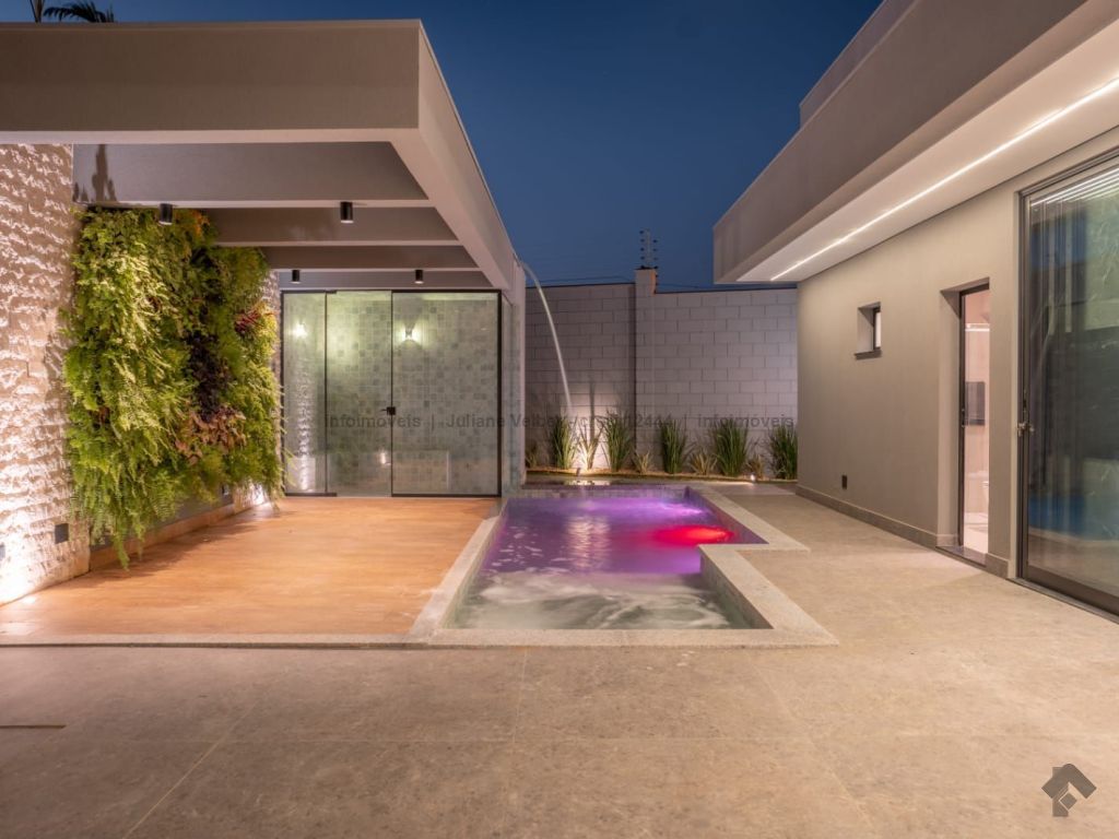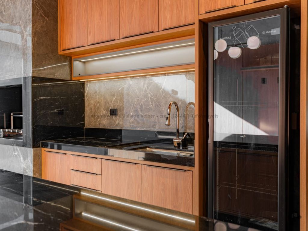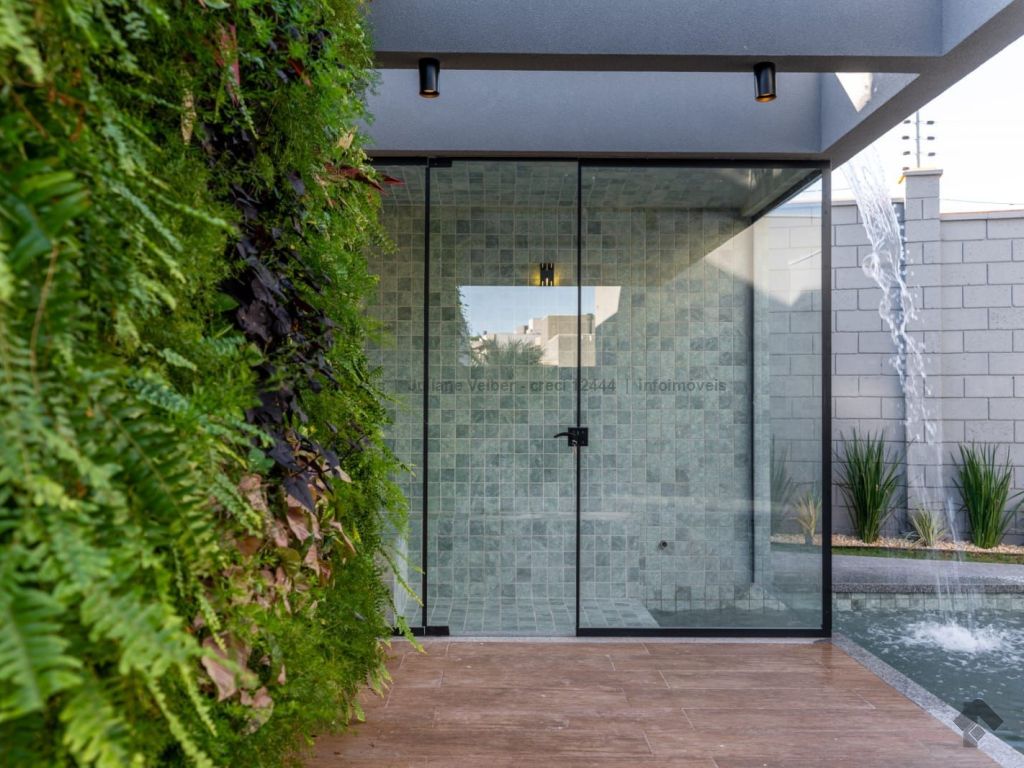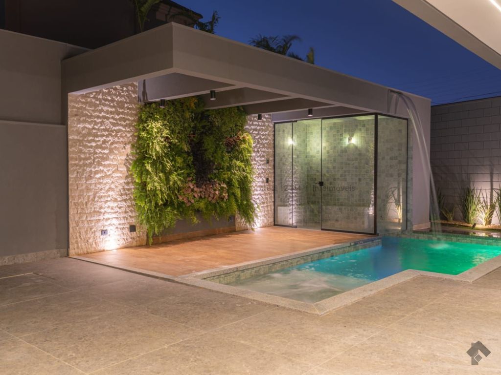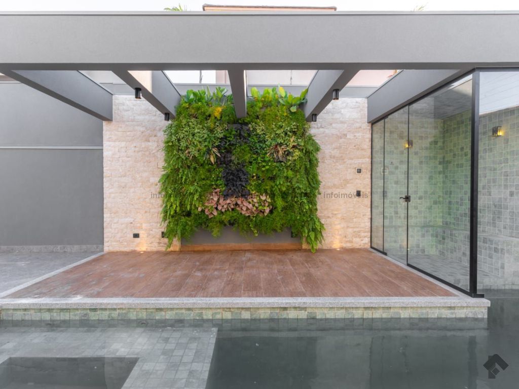 04 quartos, sendo 01 suíte master com varanda, camarim e banheiro com banheira e cuba dupla, espaço para roupeiro no corredor da área íntima, sauna, piscina aquecida com hidromassagem e iluminação em LED, gourmet completo com churrasqueira com giragrill e cervejeira, cozinha independente e com eletrodomésticos, despensa, lavabo, banheiro externo, 02 depósitos, garagem para 04 carros, sendo 02 cobertos, energia fotovoltaica de 1.000 kWh, móveis planejados, lavanderia com área de varal privativo, paisagismo completo, jardim vertical com irrigação automatizada.