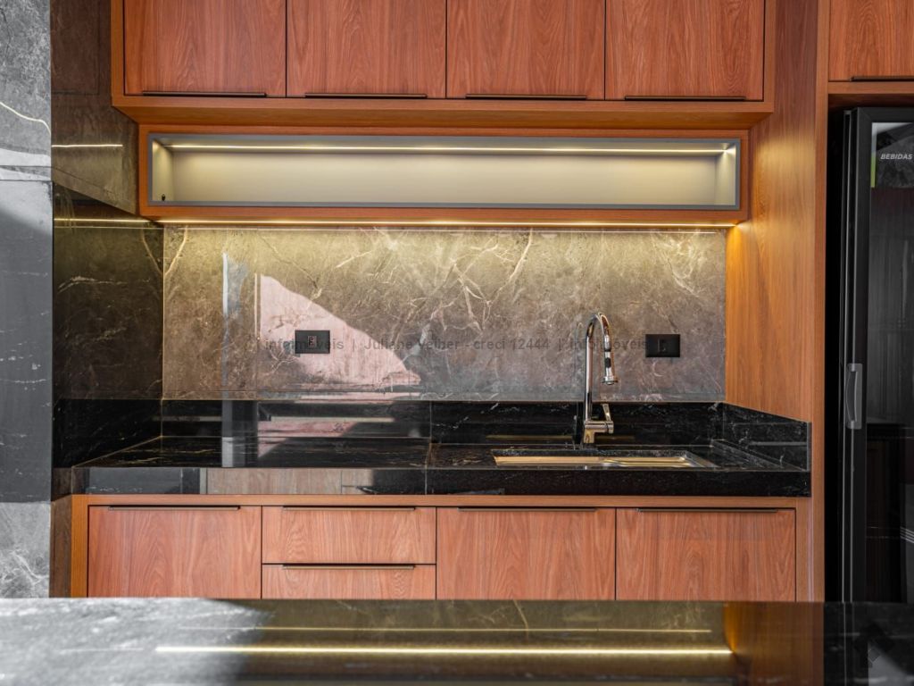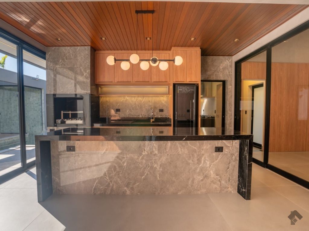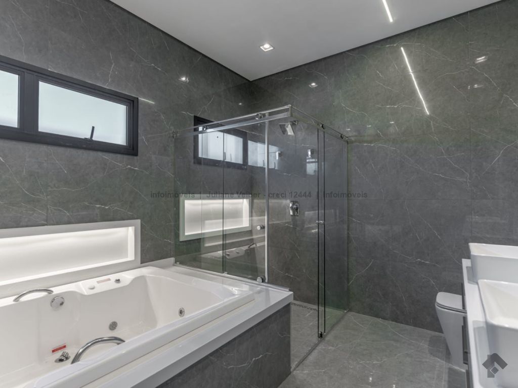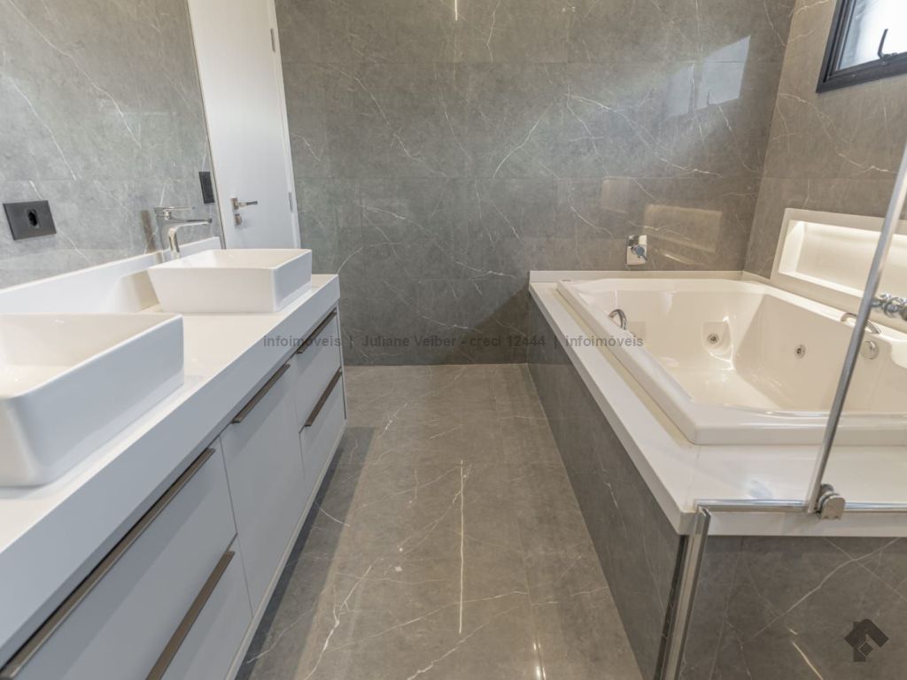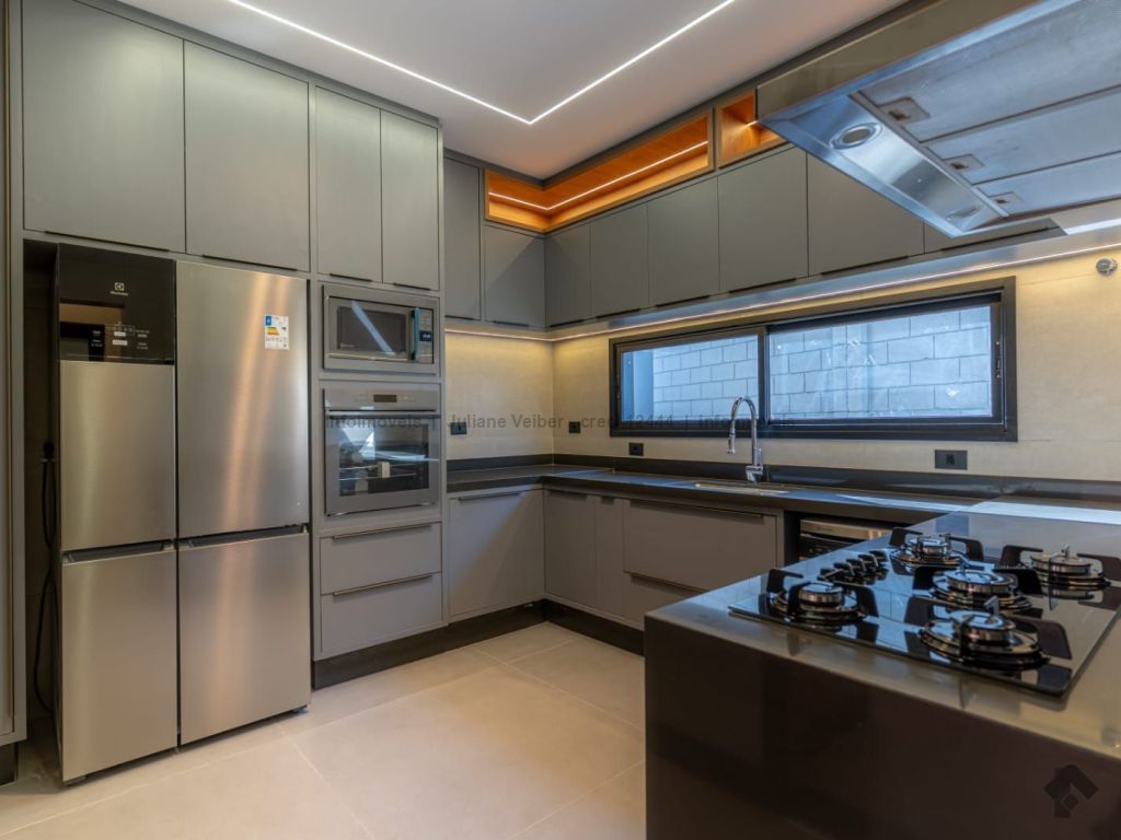 04 quartos, sendo 01 suíte master com varanda, camarim e banheiro com banheira e cuba dupla, espaço para roupeiro no corredor da área íntima, sauna, piscina aquecida com hidromassagem e iluminação em LED, gourmet completo com churrasqueira com giragrill e cervejeira, cozinha independente e com eletrodomésticos, despensa, lavabo, banheiro externo, 02 depósitos, garagem para 04 carros, sendo 02 cobertos, energia fotovoltaica de 1.000 kWh, móveis planejados, lavanderia com área de varal privativo, paisagismo completo, jardim vertical com irrigação automatizada.