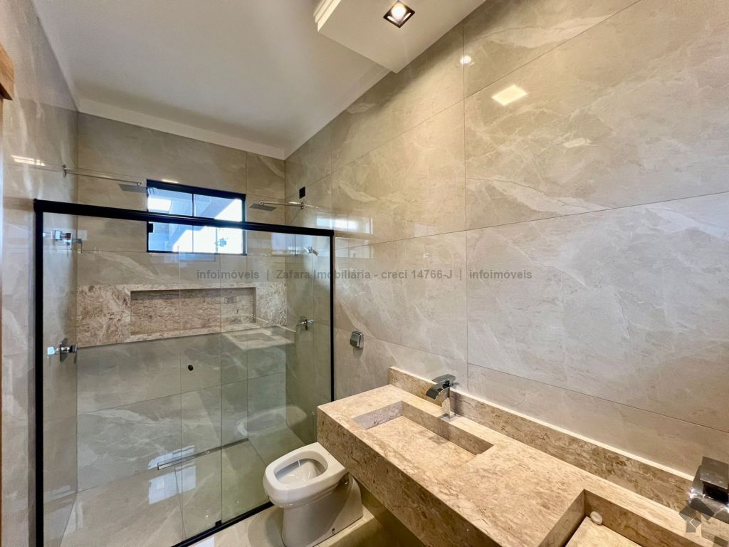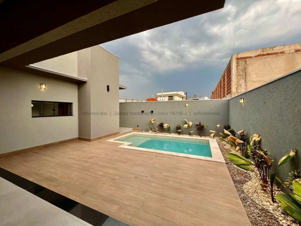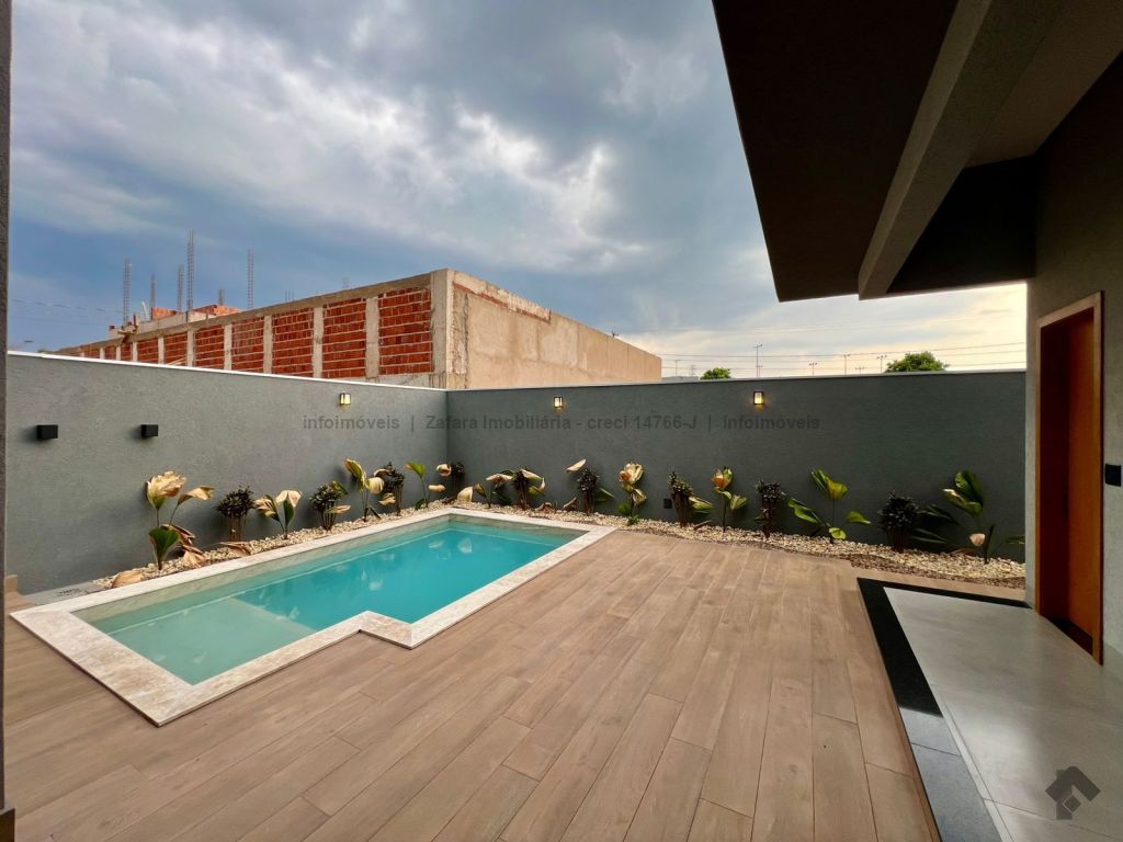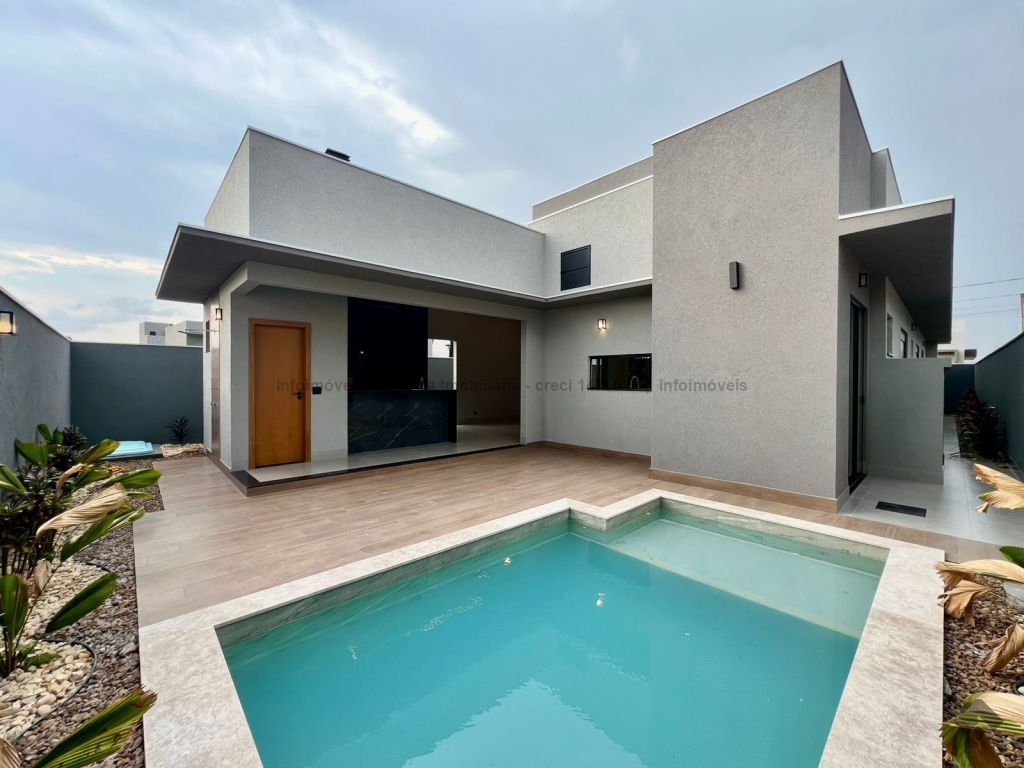 Viva no Condomínio Shalom. Projeto contemporâneo com pé-direito duplo, 3 suítes (master com closet), escritório, cozinha independente e gourmet integrado. Piscina revestida em porcelanato com aquecimento. Terreno de 370 m², 185 m² construídos.