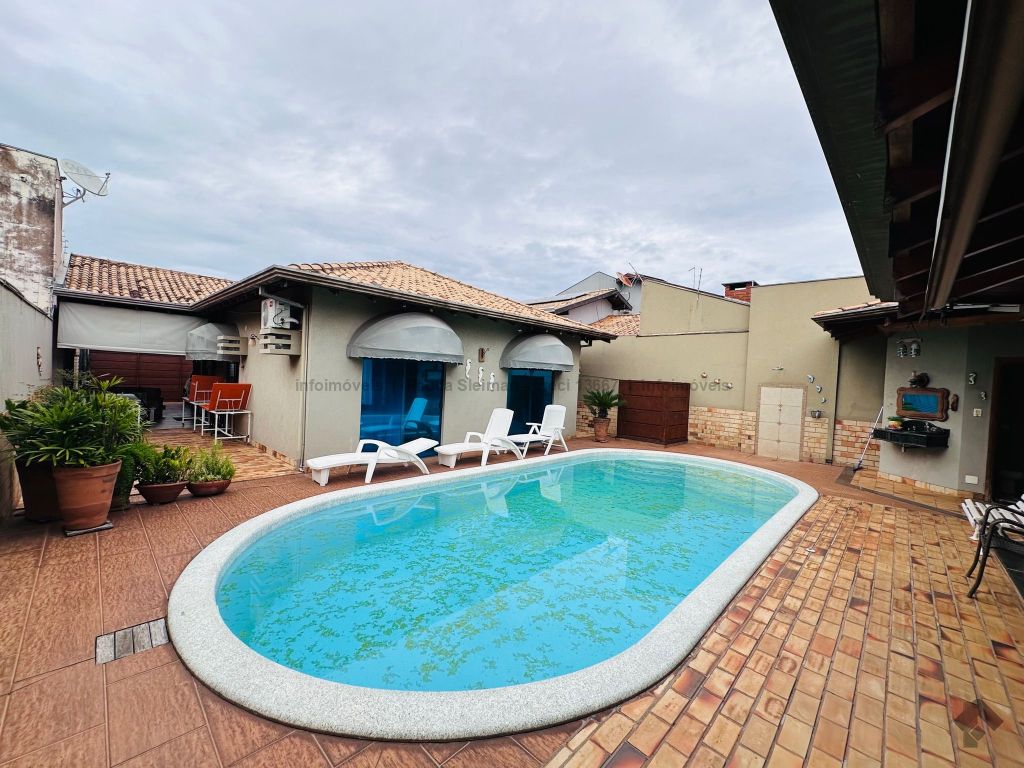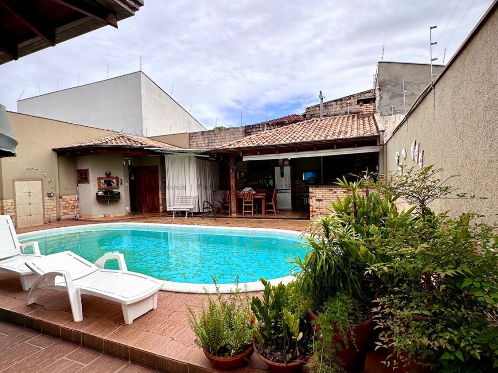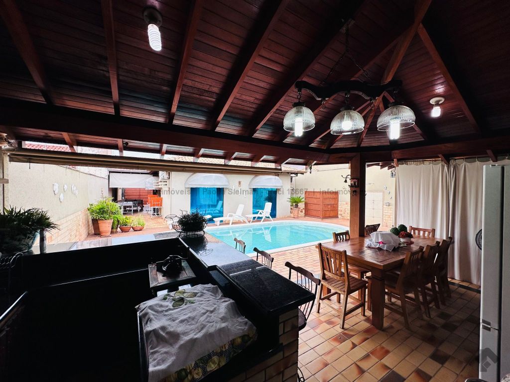 2 salas amplas (estar e jantar), cozinha espaçosa, 3 quartos, sendo 1 suíte com vista e saída para a piscina, 1 banheiro social, lavanderia, interfone. Área externa: espaço gourmet com churrasqueira, piscina, banheiro externo, despensa. Diferenciais: poço artesiano, portão elétrico, 4 vagas de garagem.