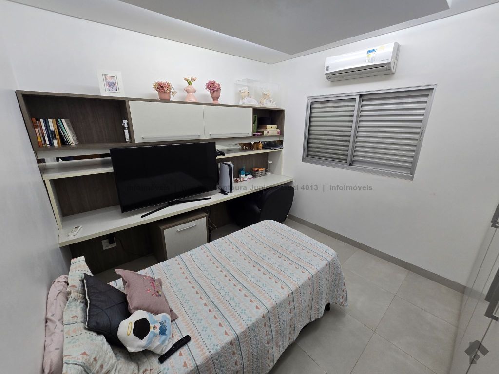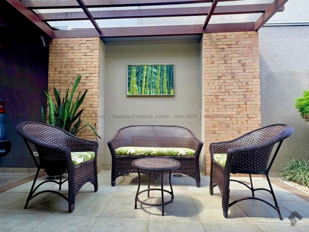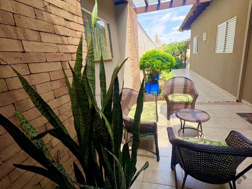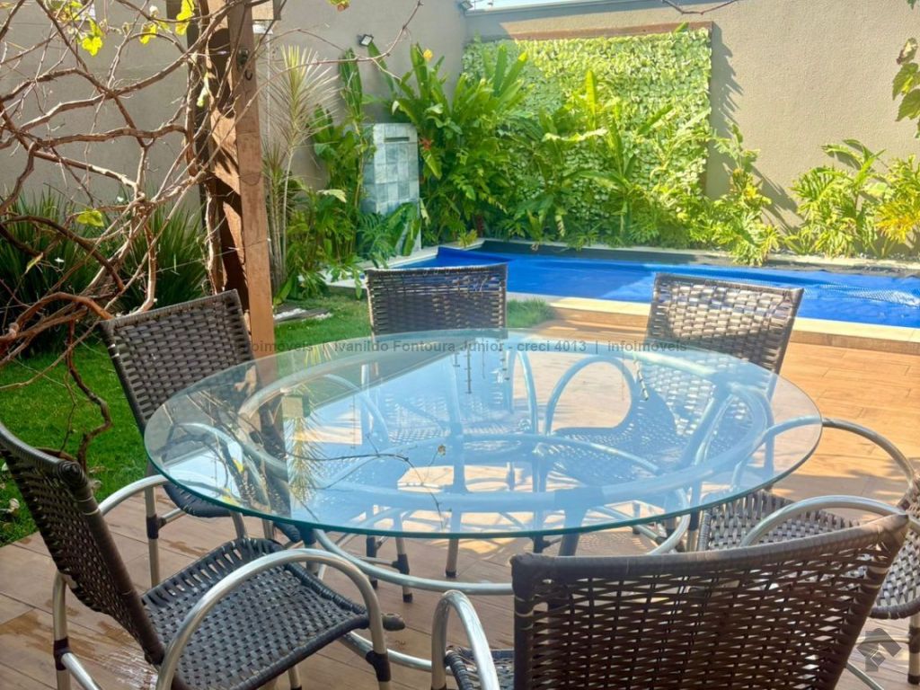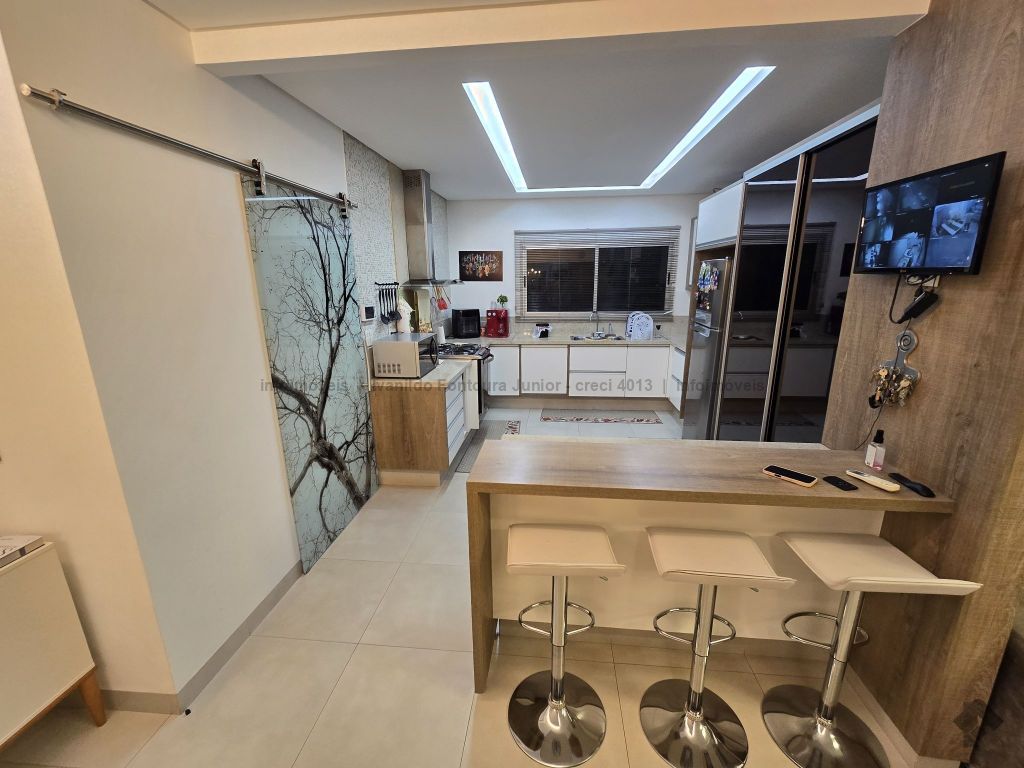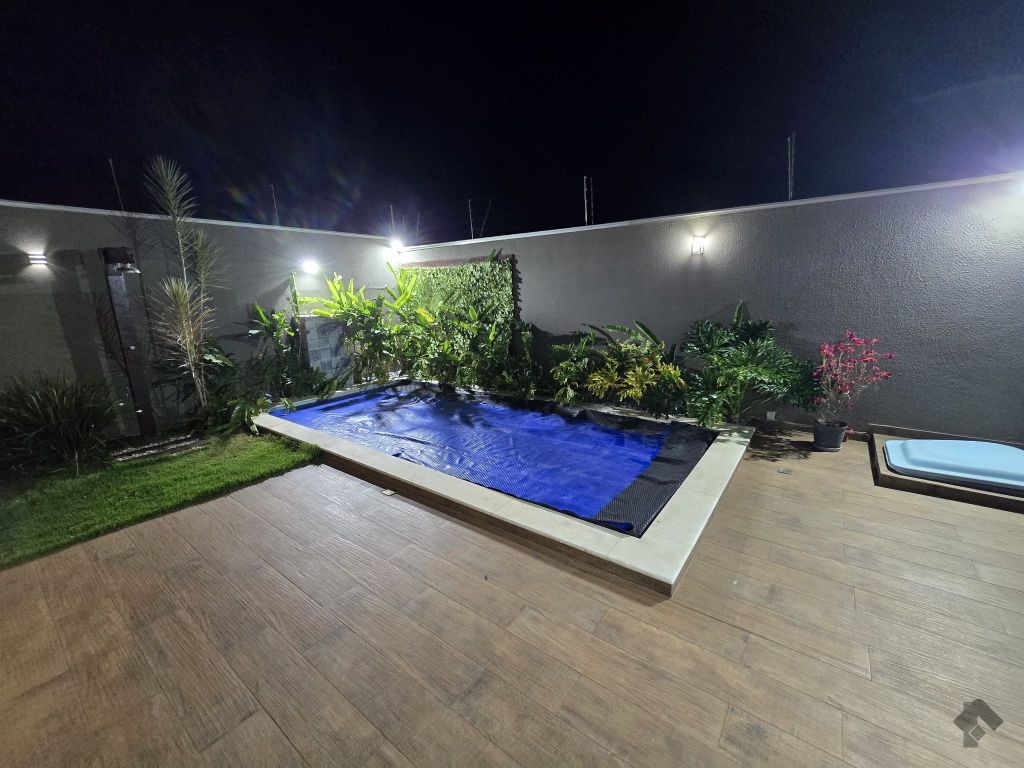 Casa térrea contendo uma suíte com armários, dois quartos com armários, banheiro social, sala de estar, sala de jantar, cozinha planejada, área de serviço com armários, varanda com churrasqueira, piscina aquecida, despensa, lavabo, poço, energia fotovoltaica, cerca elétrica e garagem para dois carros coberta.