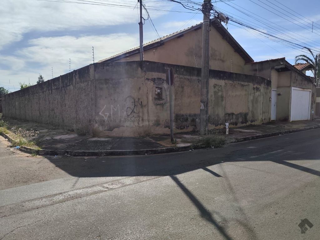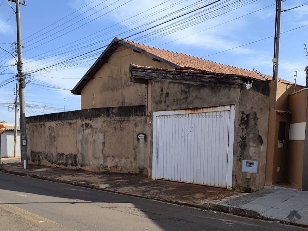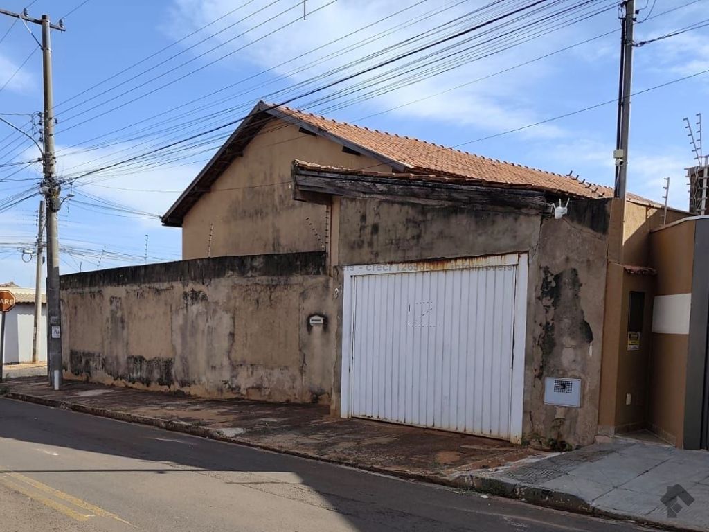 Casa em lote de esquina com frente para três ruas, imóvel composto por casa de alvenaria em laje com pé direito alto, uma suíte, dois quartos, sala, cozinha, banheiro, área de serviço, varanda, garagem coberta e espaço de terreno.
