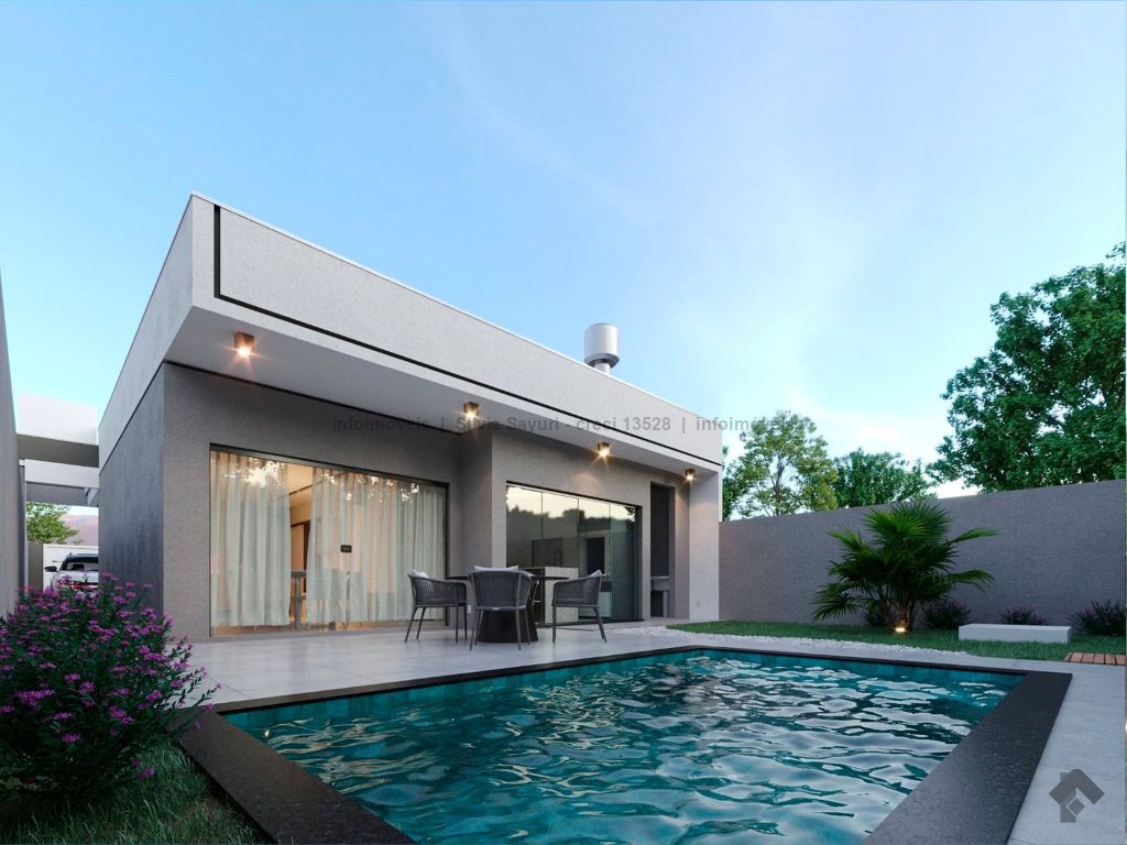 3 quartos sendo 01 suíte, sala/cozinha, 1 WC social, área total 250 m², área aproximada construída 107,93 m², piscina em vinil, área gourmet, sala de estar ampla, dormitórios amplos, lavanderia coberta separada, forro de gesso acartonado, projeto luminotécnico rico em detalhes, acabamentos de alto padrão.