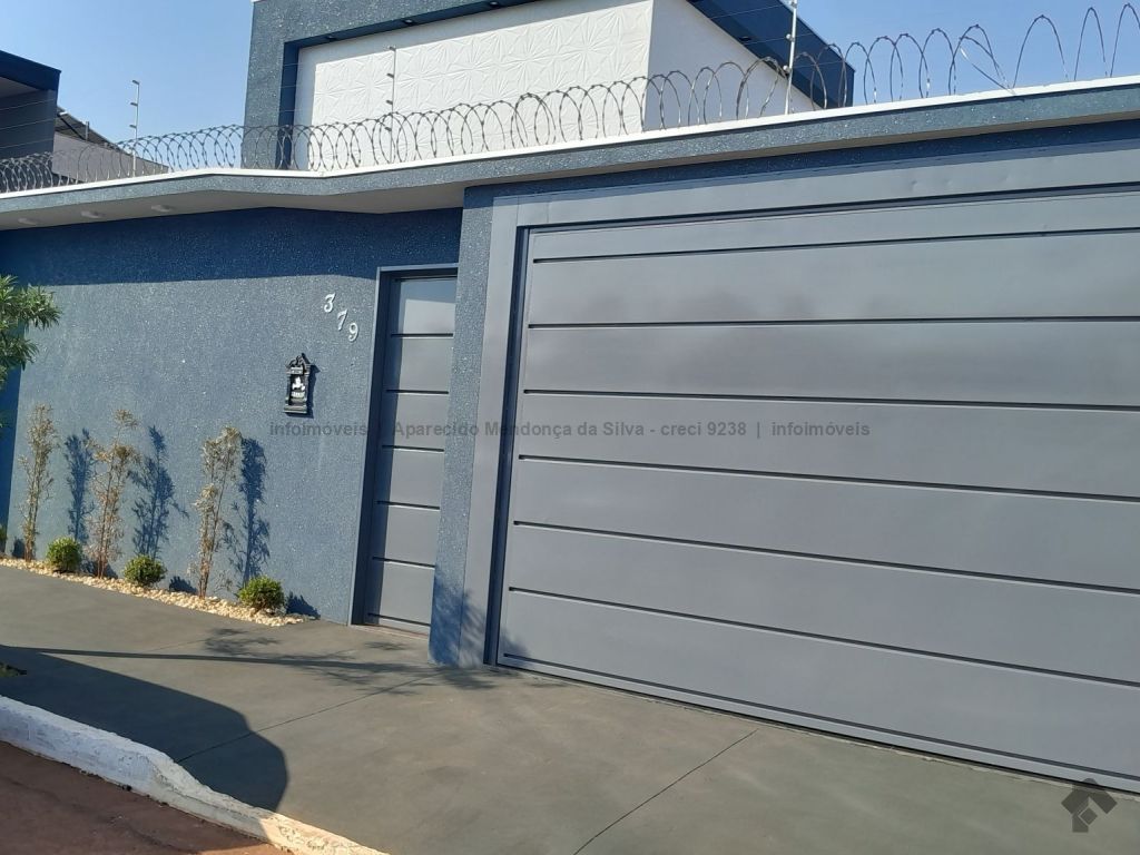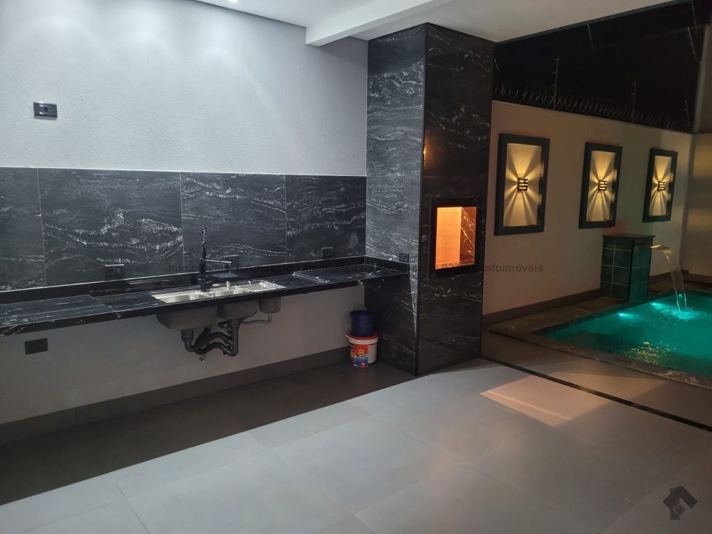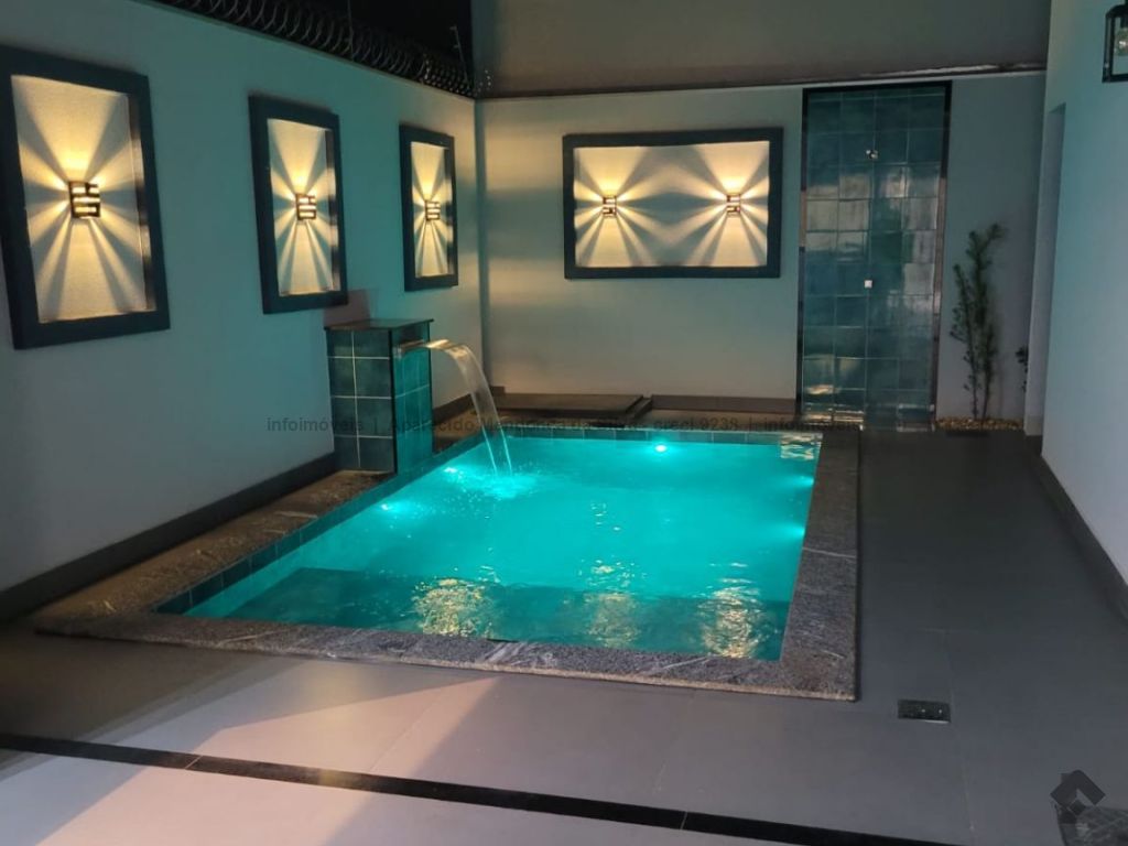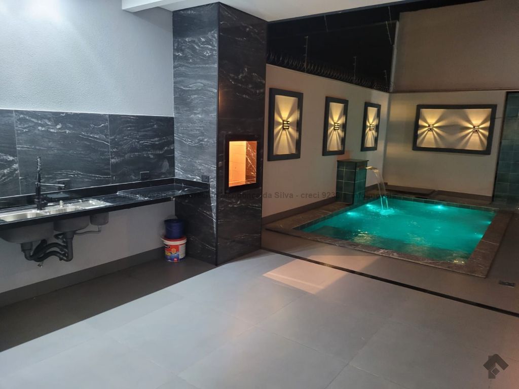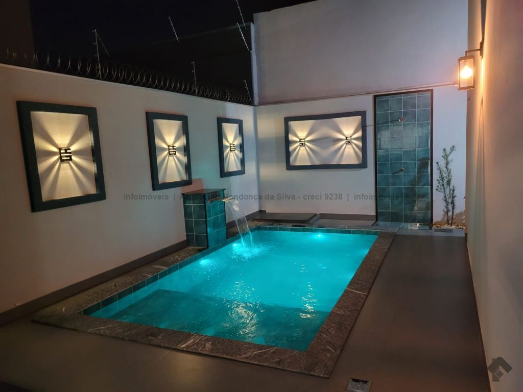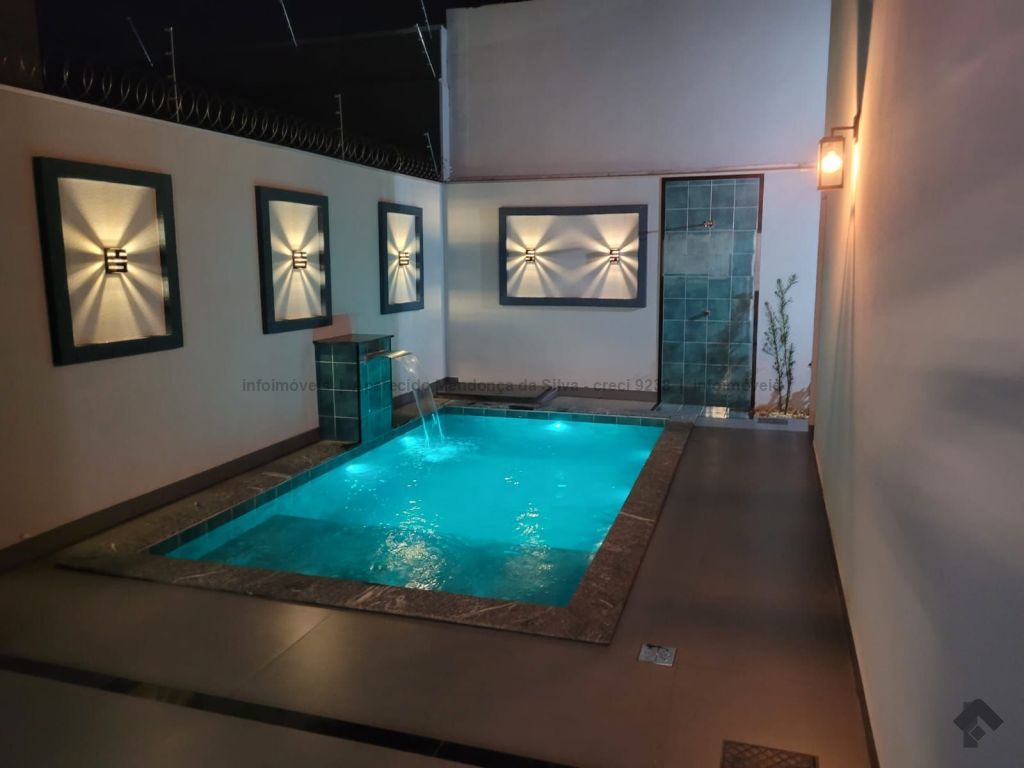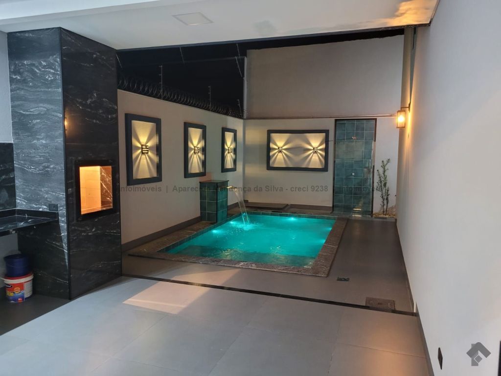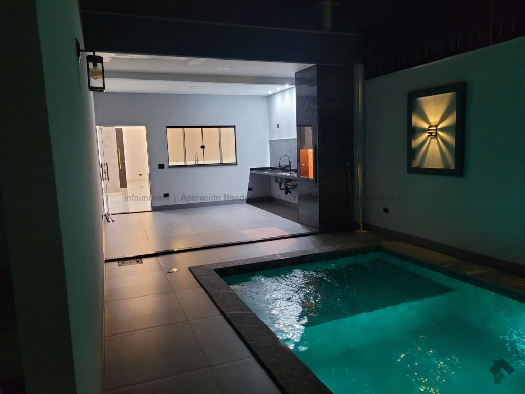 Casa com três quartos, sendo um suíte, sala ampla com pé direito alto, escritório, cozinha, banheiro social, piscina, quintal, portão eletrônico, acabamento todo em porcelanato.