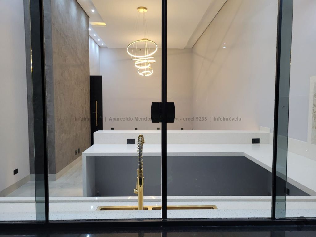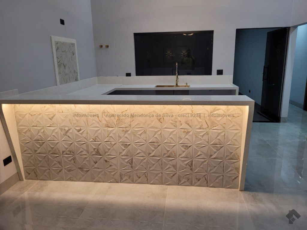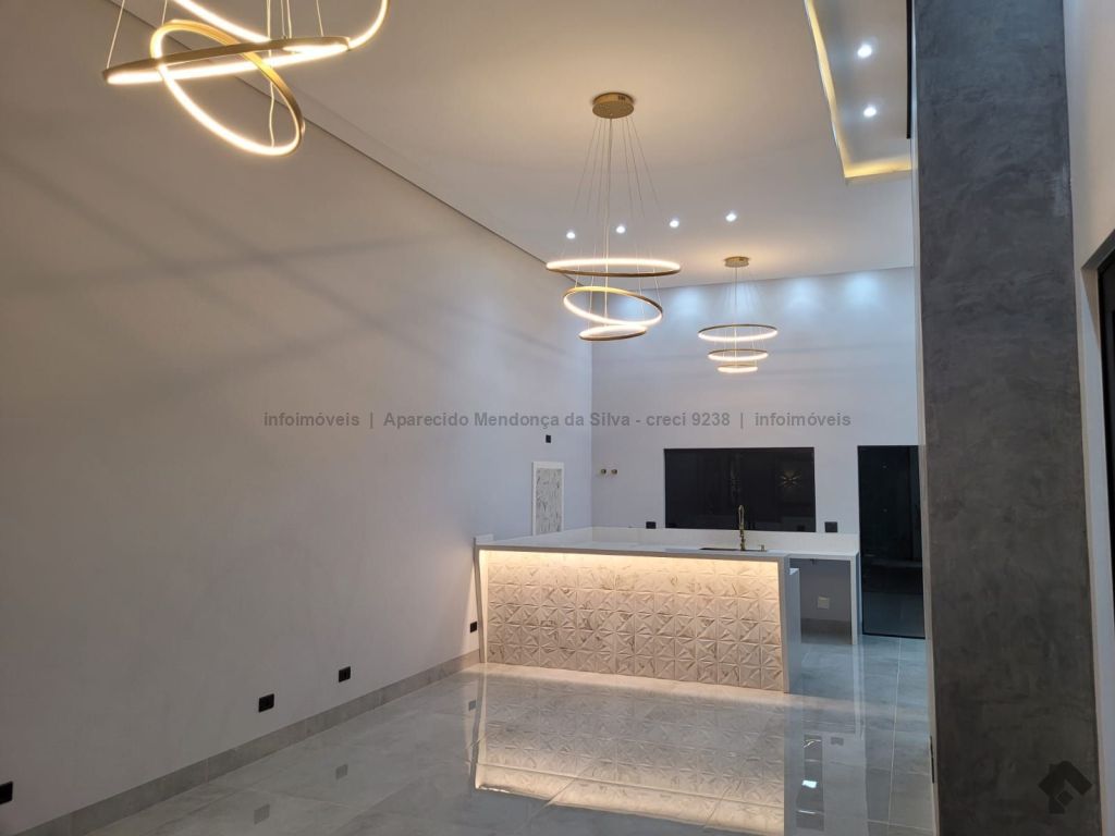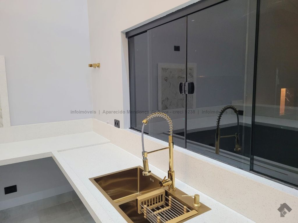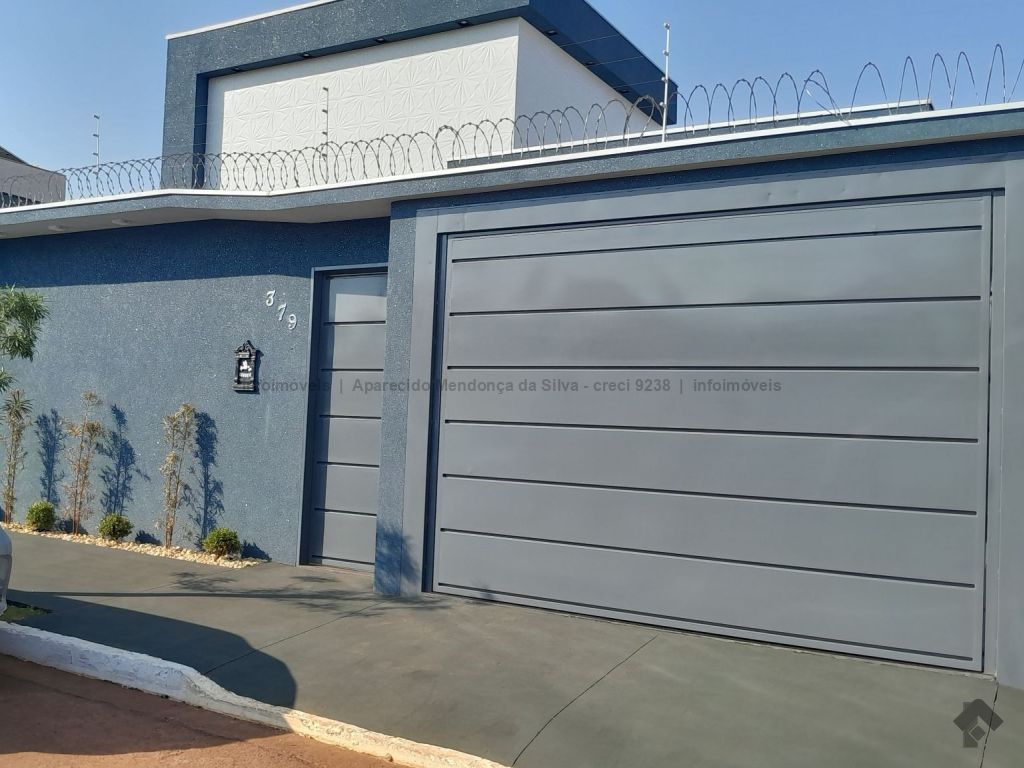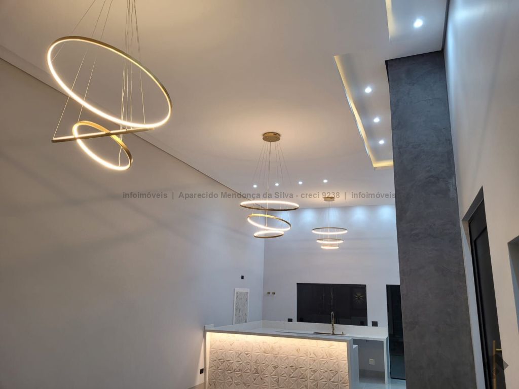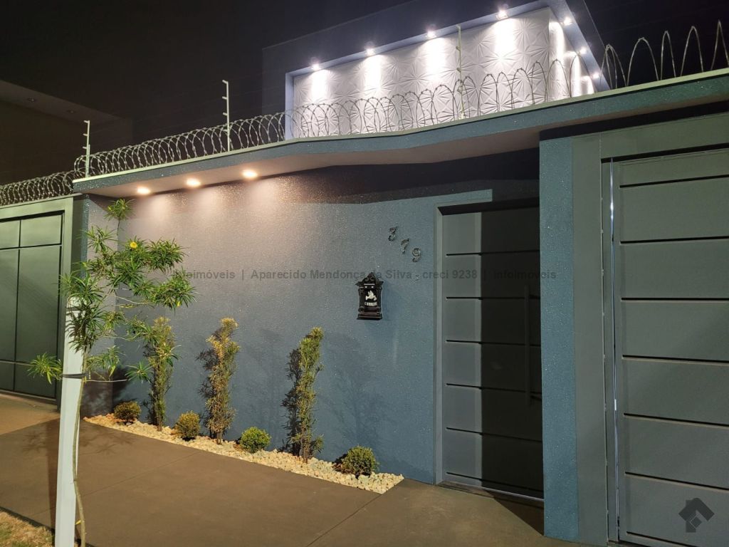 Casa com três quartos, sendo um suíte, sala ampla com pé direito alto, escritório, cozinha, banheiro social, piscina, quintal, portão eletrônico, acabamento todo em porcelanato.