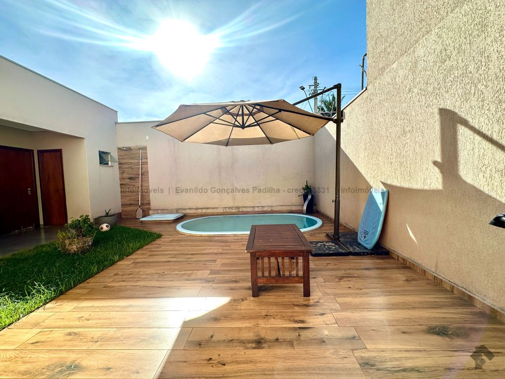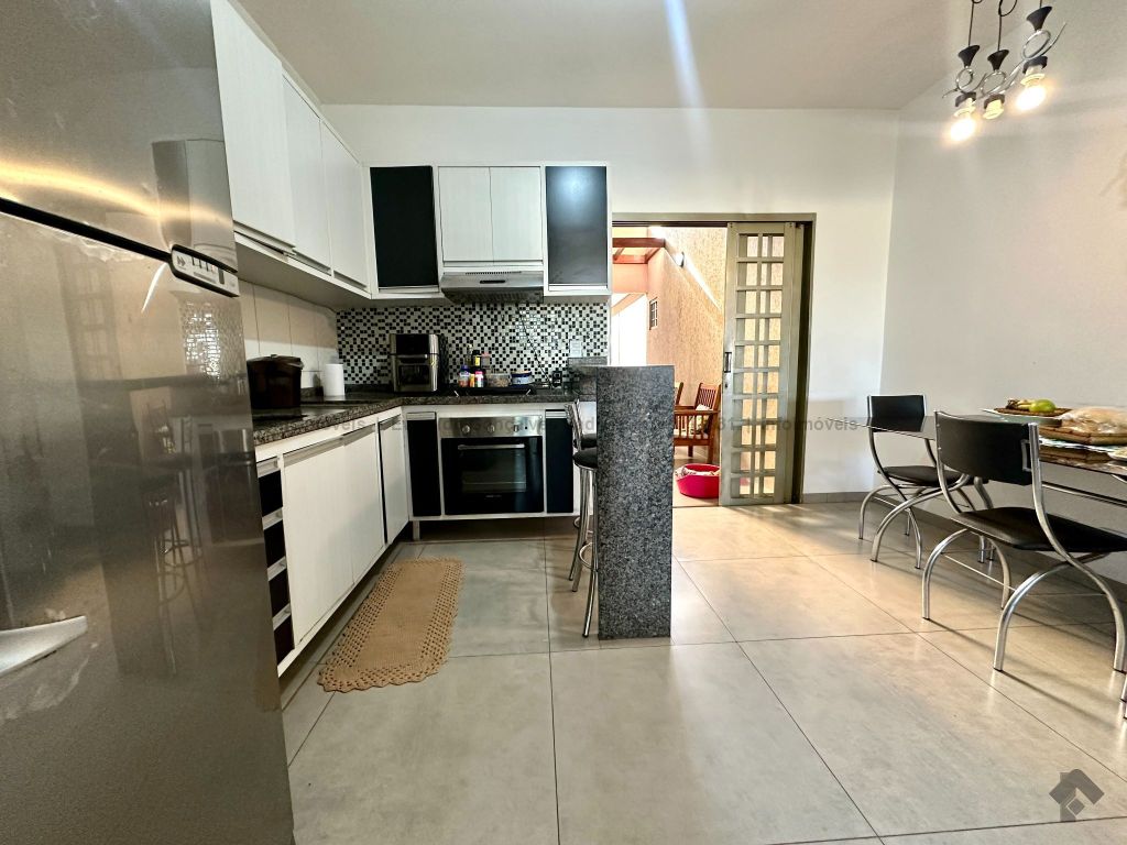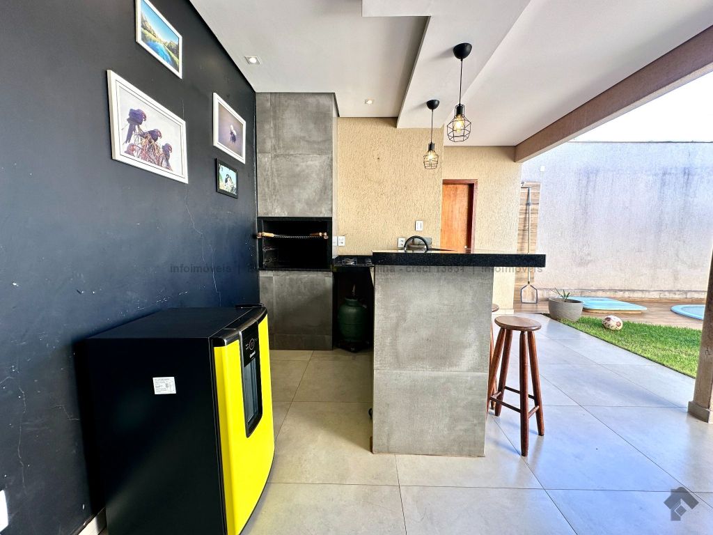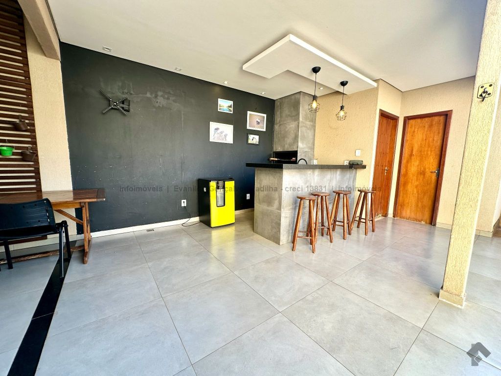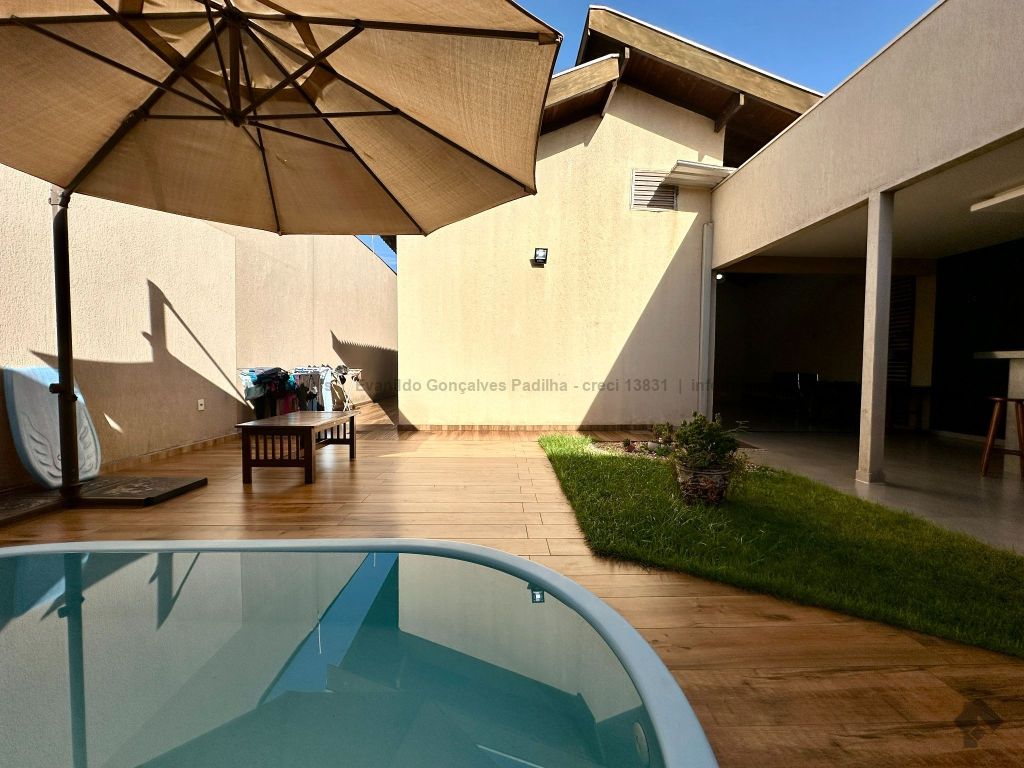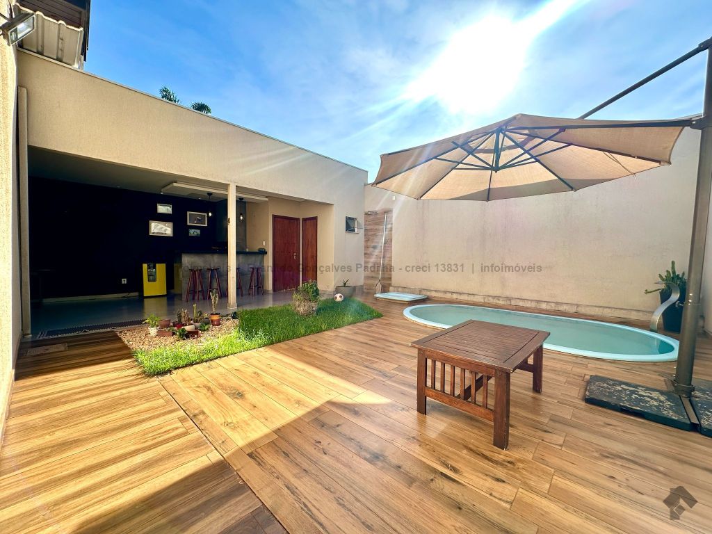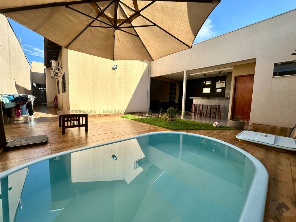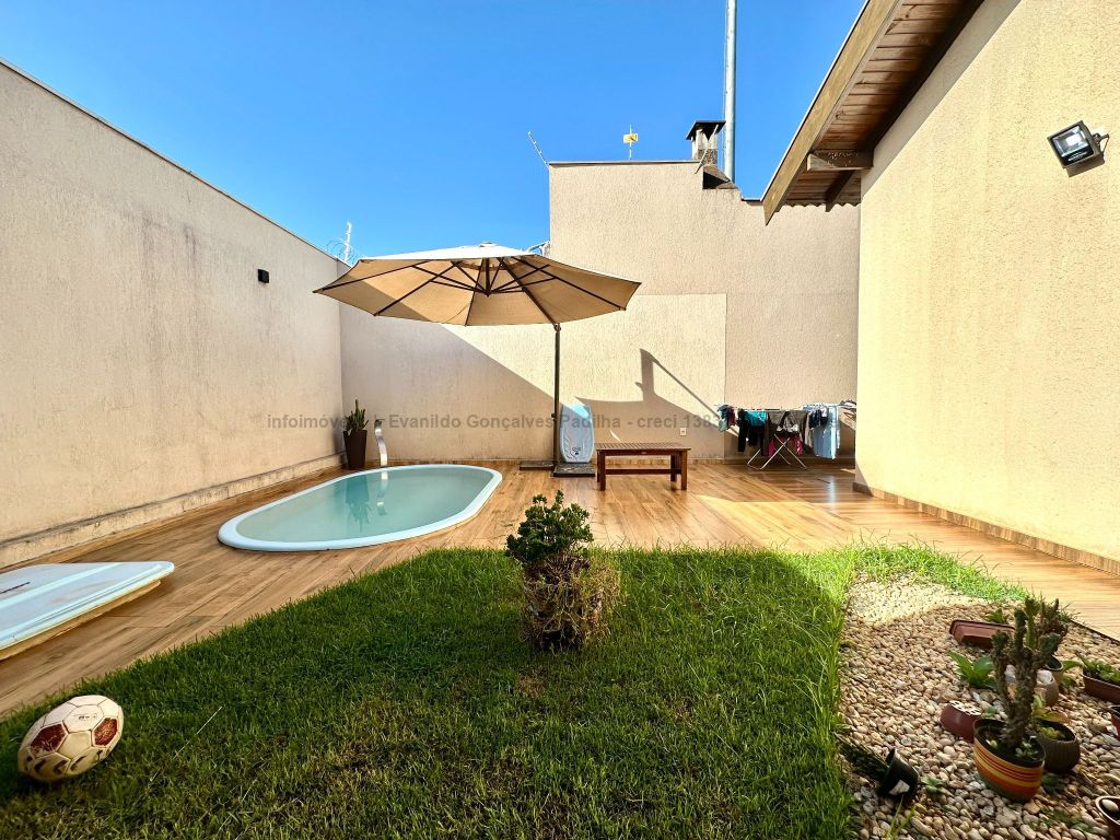 Com 250m² de área total e 188m² de área construída, três quartos sendo uma suíte com closet, WC social, sala de TV com painel embutido, sala de jantar, cozinha estilo americana e com armários planejados, lavanderia ampla e toda planejada, área de lazer bem ampla, churrasqueira toda revestida, pia e bancada em mármore e um lavabo, despensa, corredor lateral, piscina e boa sobra de quintal nos fundos.