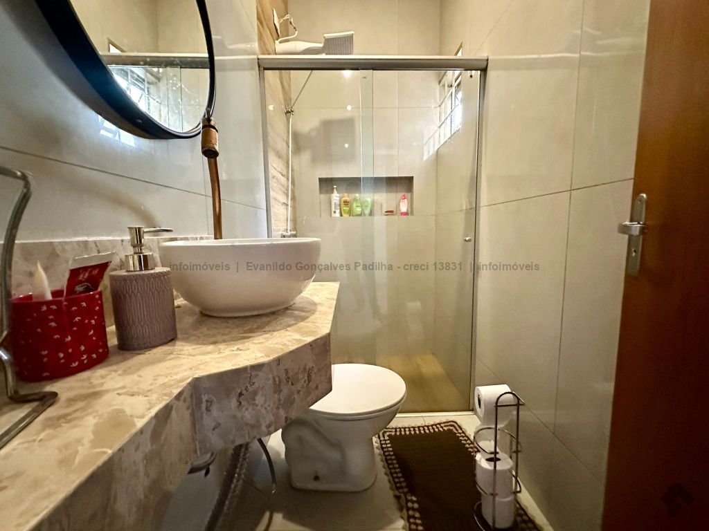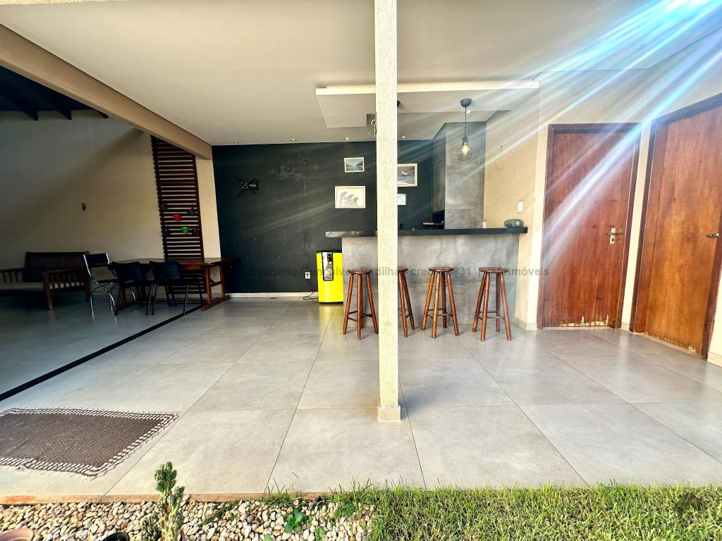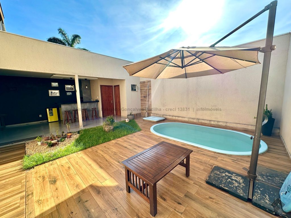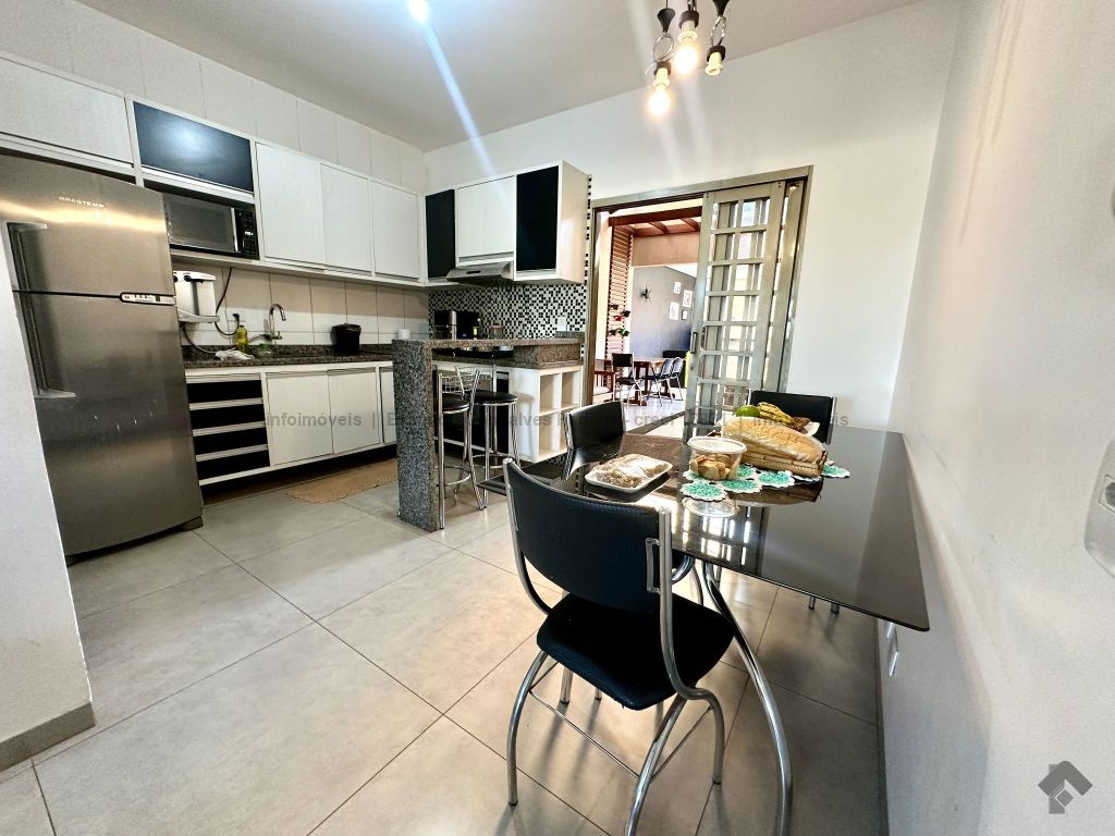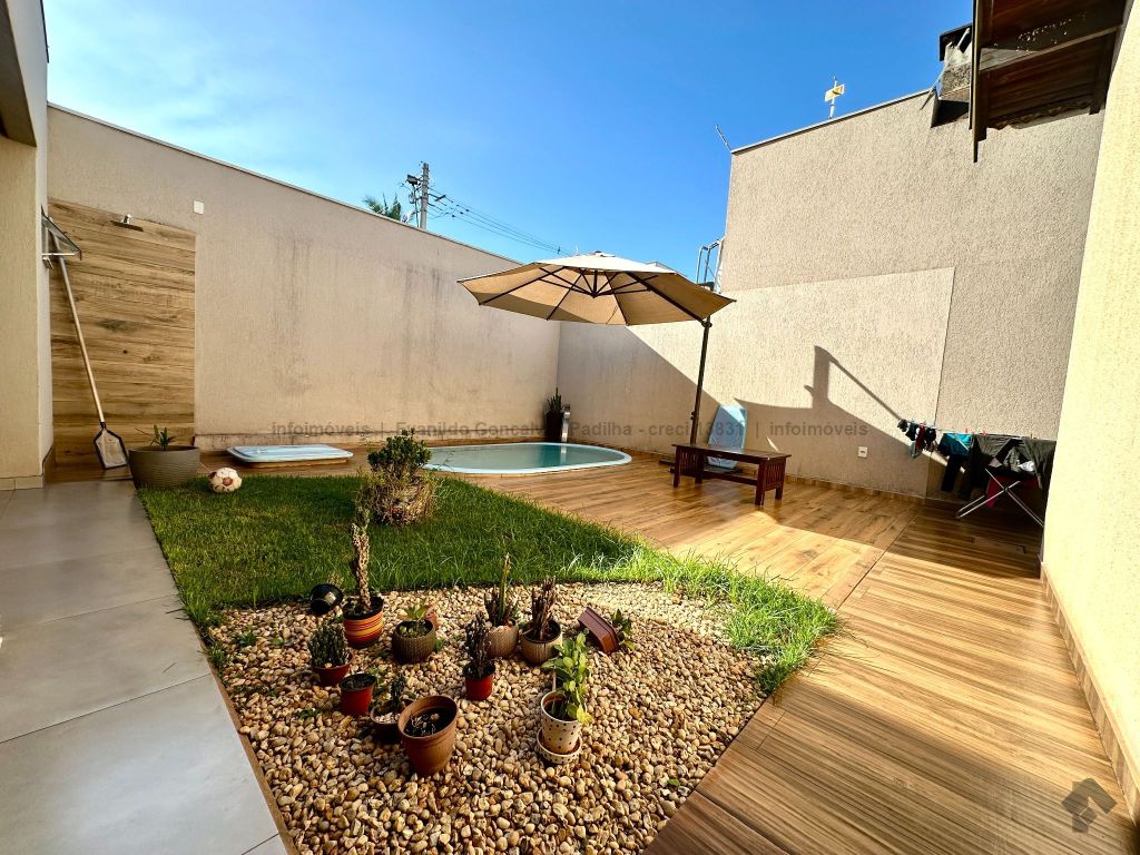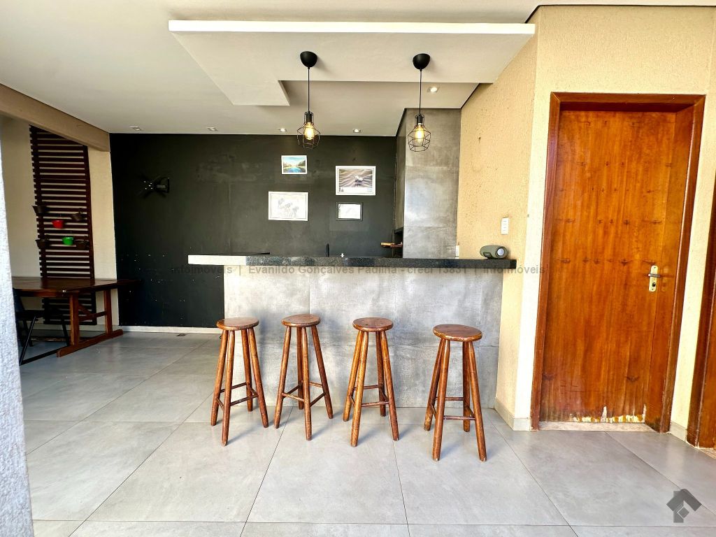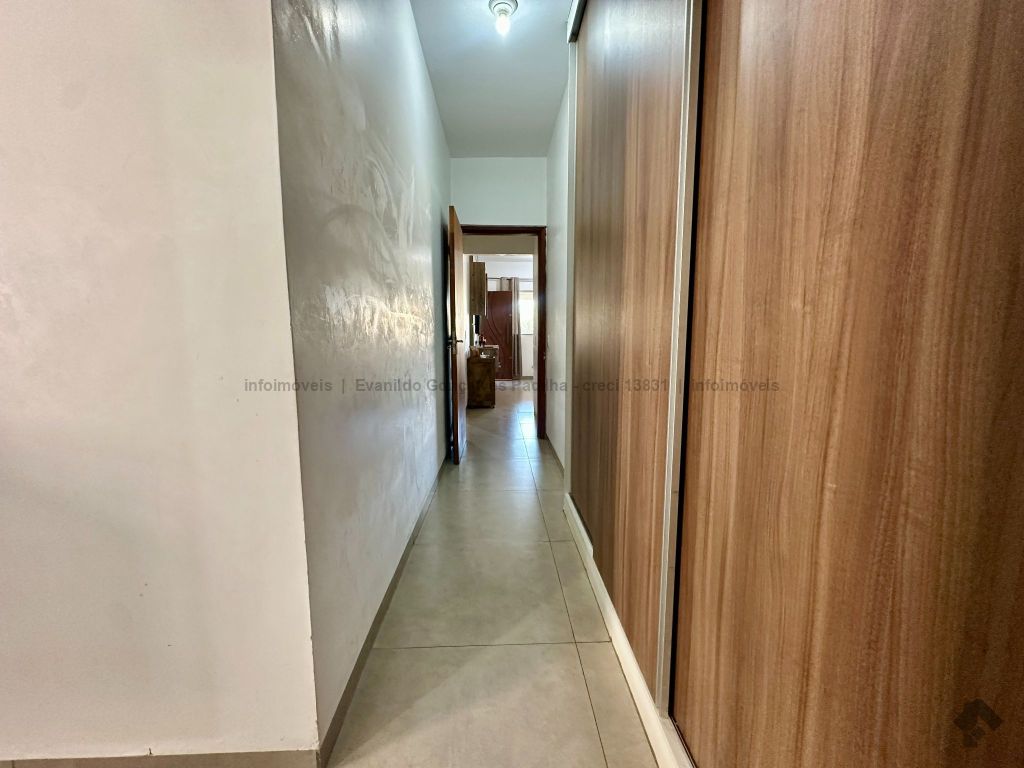 Com 250m² de área total e 188m² de área construída, três quartos sendo uma suíte com closet, WC social, sala de TV com painel embutido, sala de jantar, cozinha estilo americana e com armários planejados, lavanderia ampla e toda planejada, área de lazer bem ampla, churrasqueira toda revestida, pia e bancada em mármore e um lavabo, despensa, corredor lateral, piscina e boa sobra de quintal nos fundos.