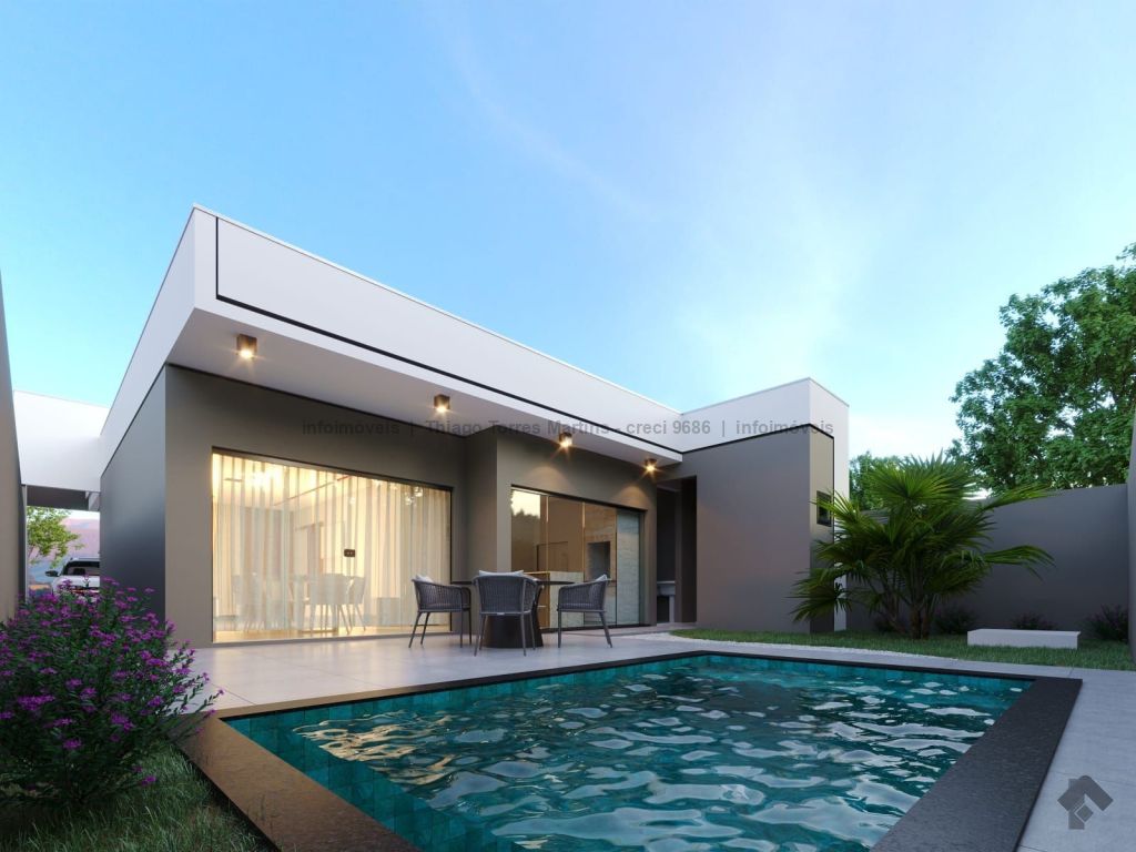 Jardim das Nações, próximo à UFMS. 03 quartos (sendo 01 suíte) + sala/cozinha + 01 banheiro social. Área total: 250 m². Área aproximada construída: 107,93 m². Piscina em vinil. Área gourmet. Sala de estar ampla. Dormitórios amplos. Lavanderia coberta separada. Acabamentos de alto padrão. Forro de gesso acartonado. Projeto luminotécnico rico em detalhes.