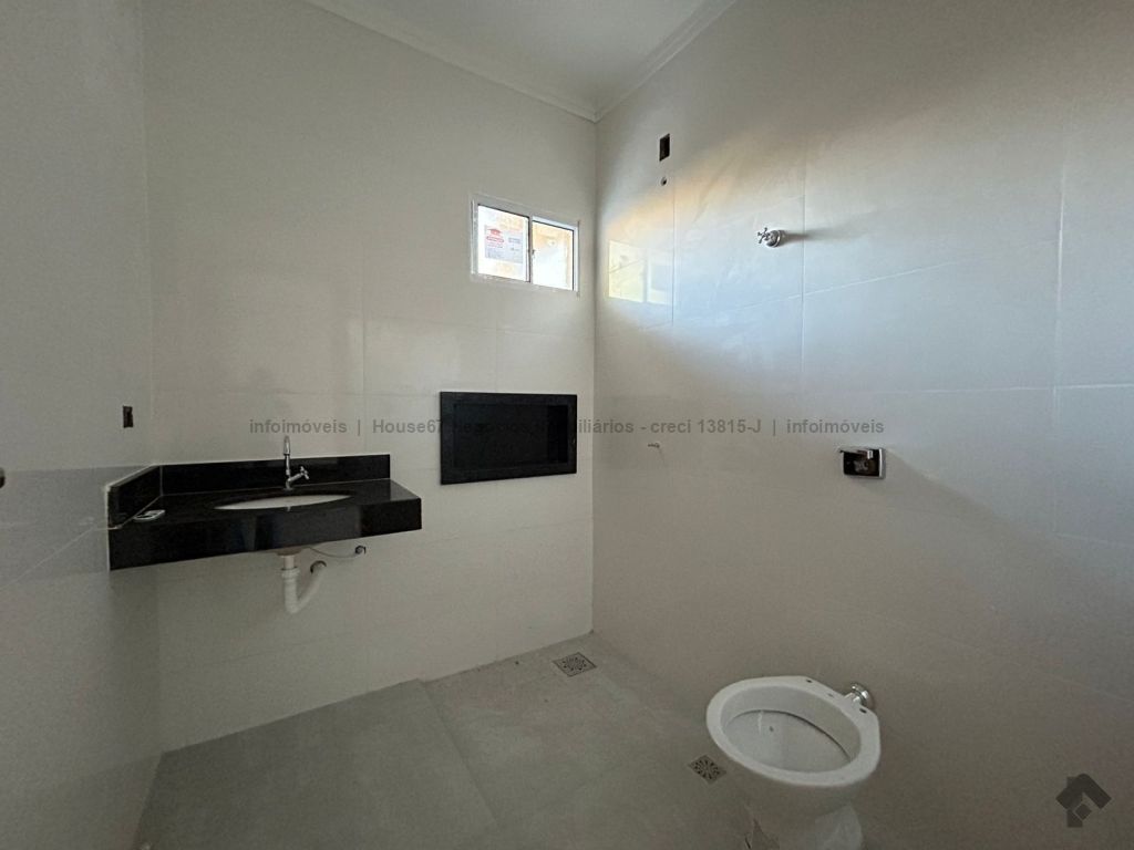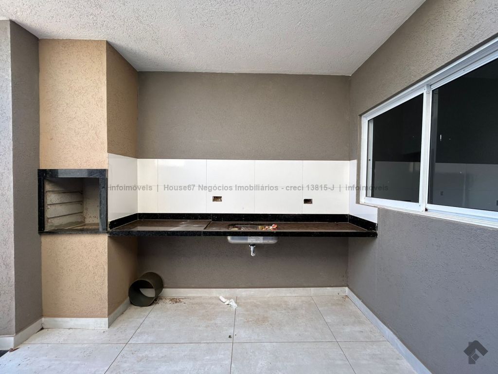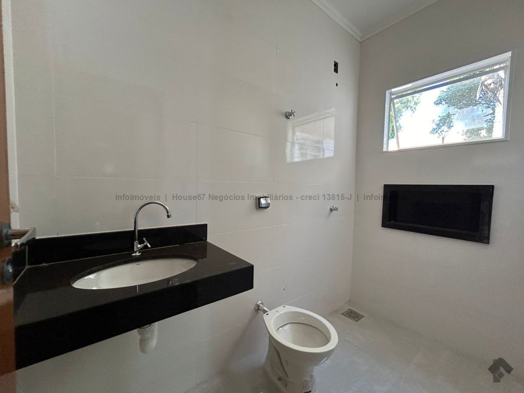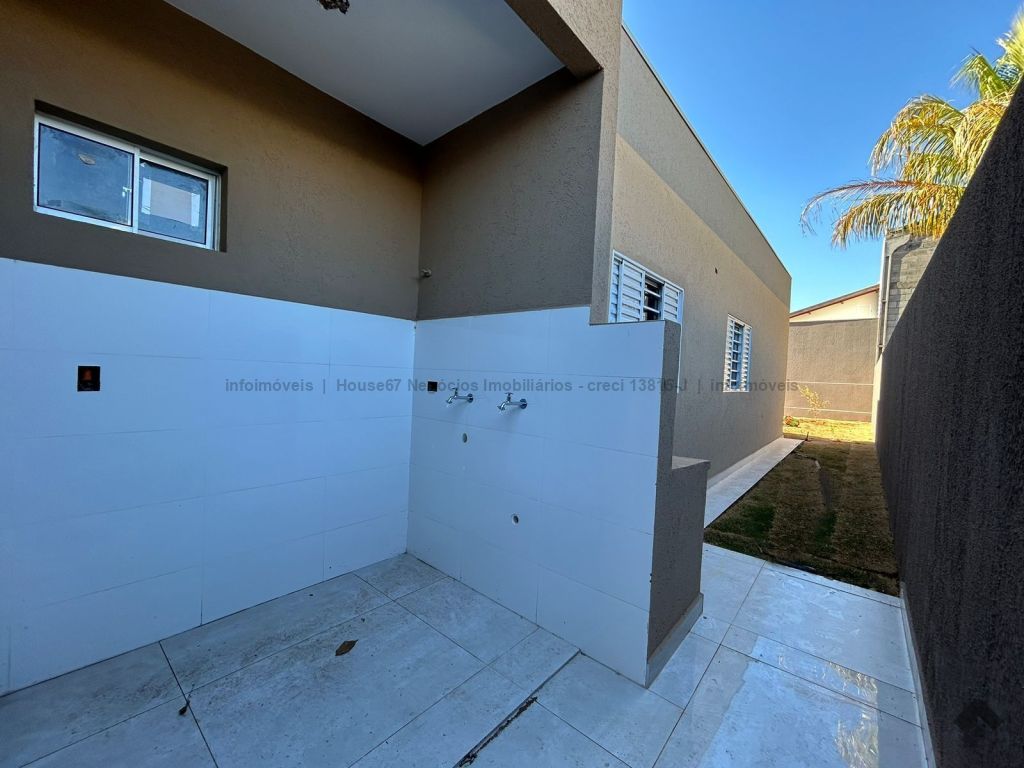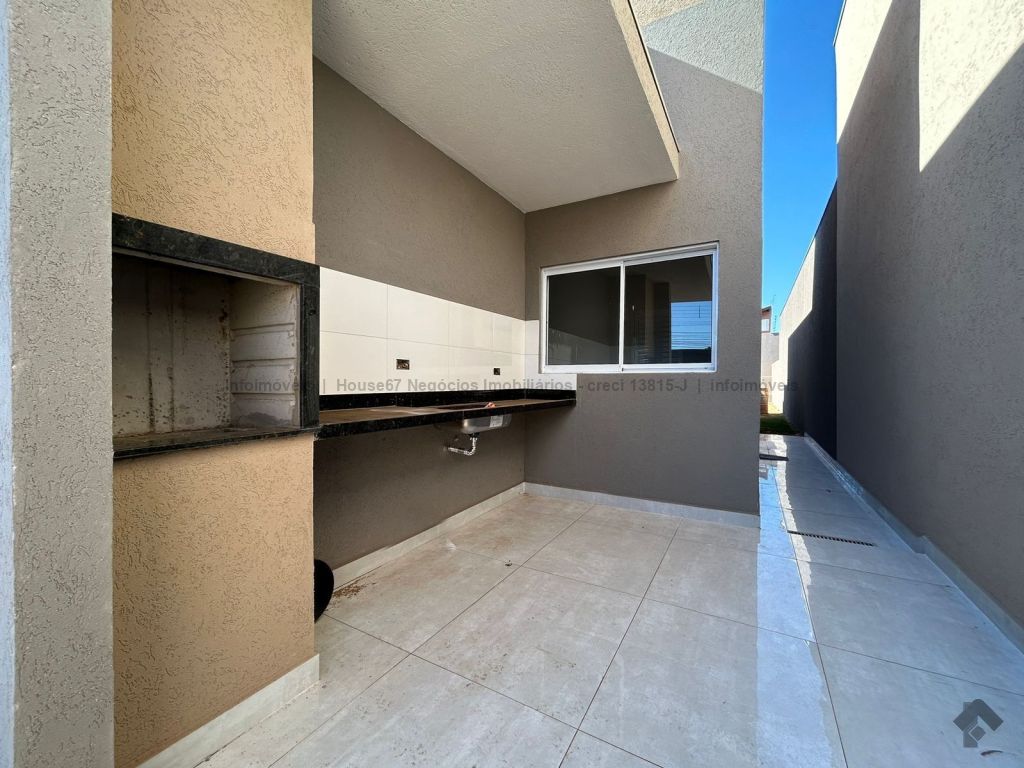 Casa com suíte e dois quartos, sala de estar e jantar, gourmet, churrasqueira, pia e bancadas em granito, banheiros com pia e nicho em granito, cozinha americana com pia em granito, área de serviço, vagas de garagem, iluminação em LED e quintal.