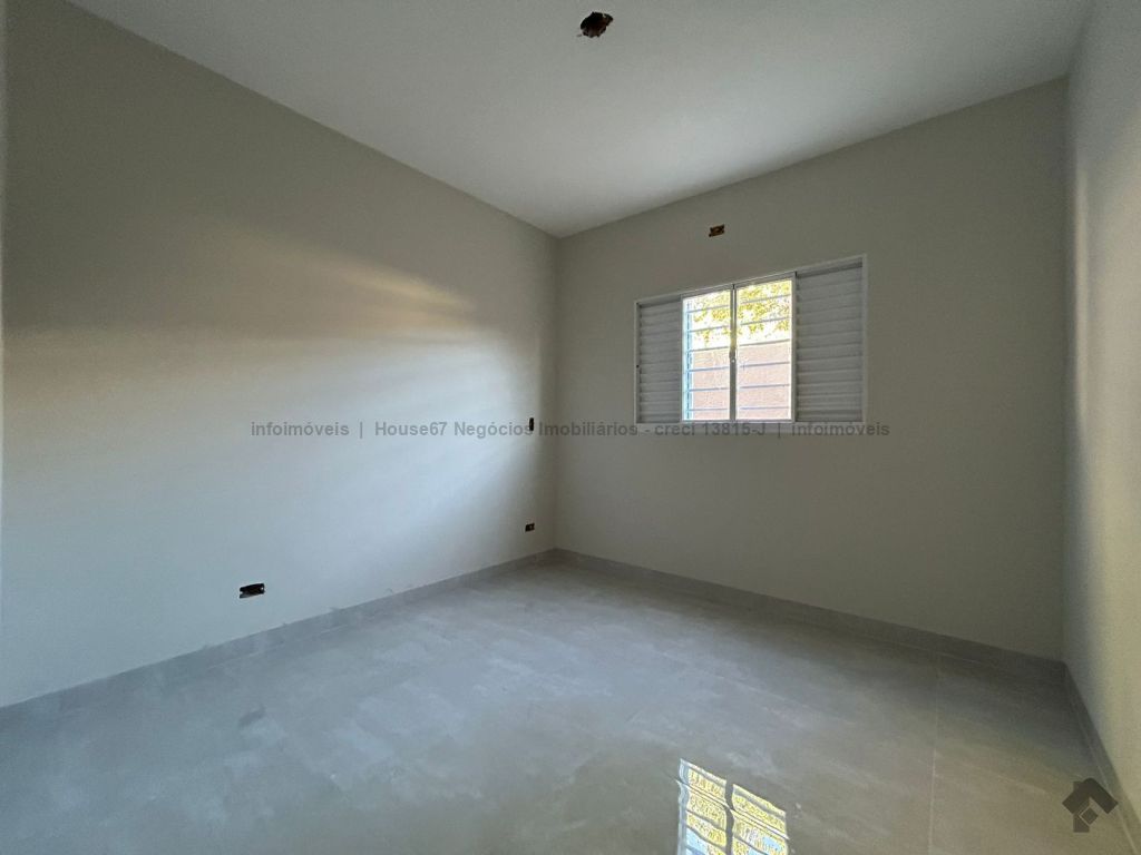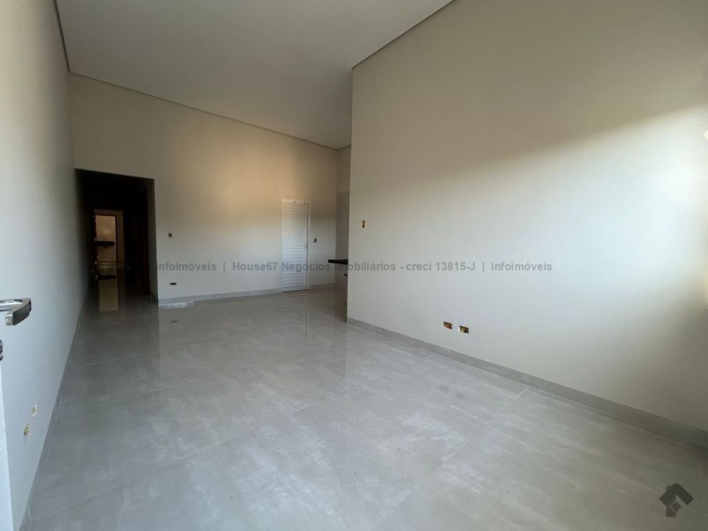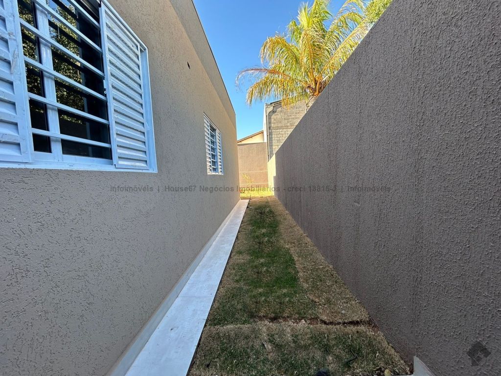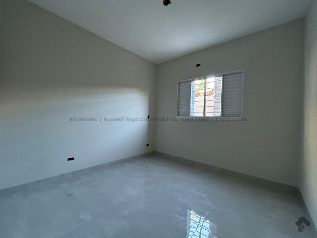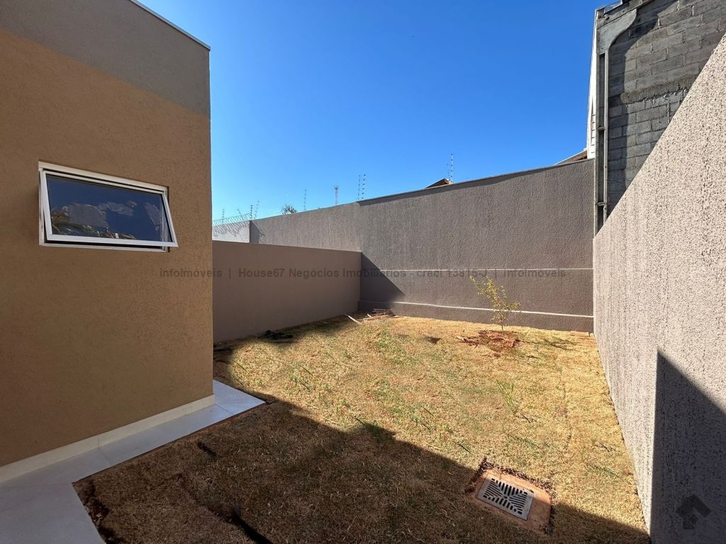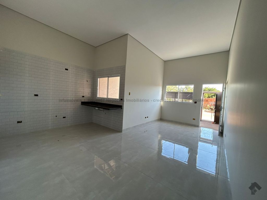 Casa com suíte e dois quartos, sala de estar e jantar, gourmet, churrasqueira, pia e bancadas em granito, banheiros com pia e nicho em granito, cozinha americana com pia em granito, área de serviço, vagas de garagem, iluminação em LED e quintal.