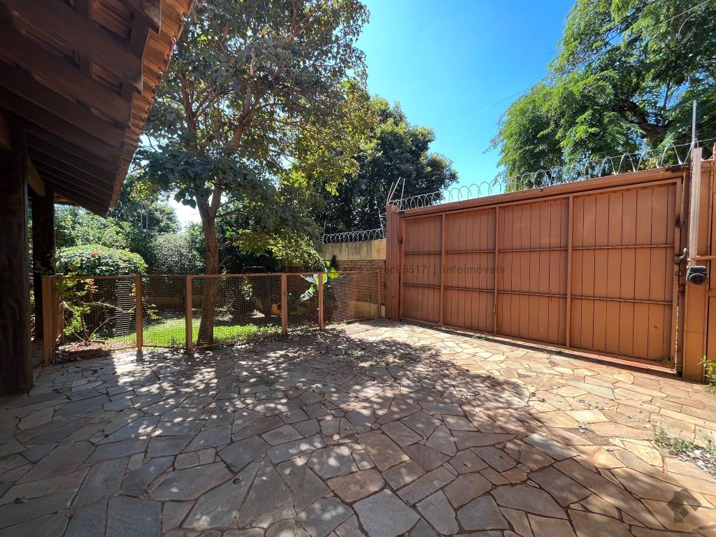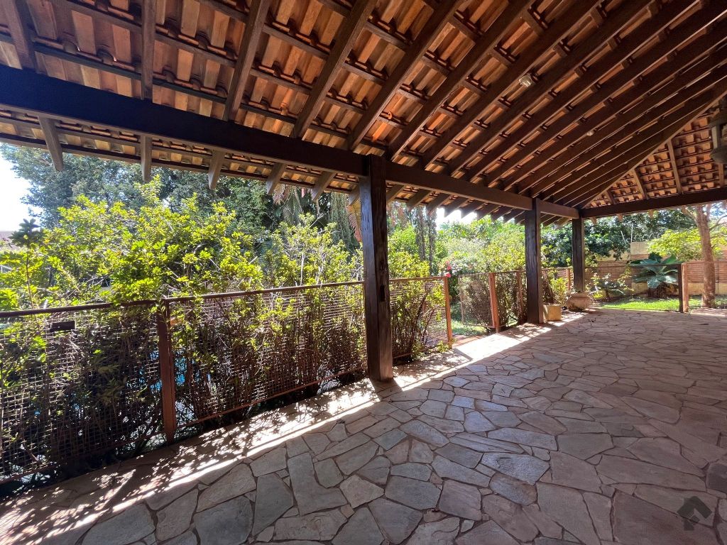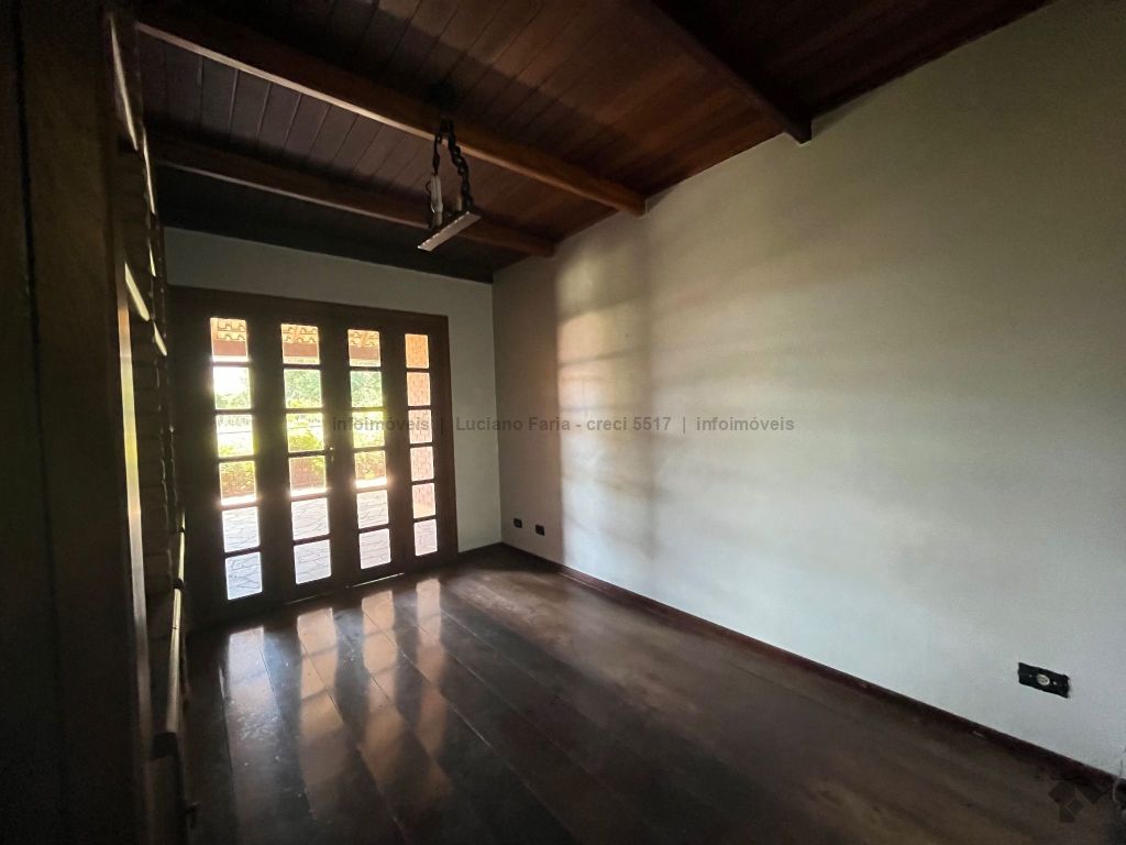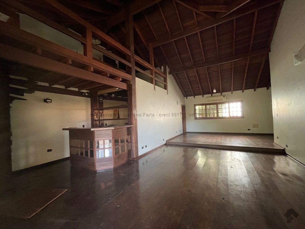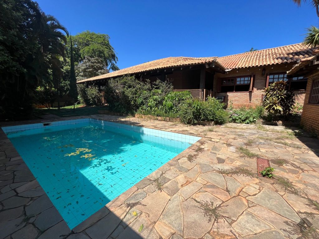 Salão com pé direito alto, forro trabalhado em madeira de lei, mezanino, lavabo, escritório com acesso para área externa, banheiro social, 2 quartos reversíveis para salas e suíte master, cozinha planejada com despensa e quarto com banheiro para funcionários. Imóvel com recuo e ampla sobra de terreno frontal para futura construção, 24 metros de testada frontal. Varanda e 4 vagas de garagem. Piscina e churrasqueira coberta. Amplo espaço para estacionamento, esquina.