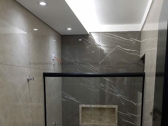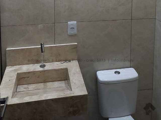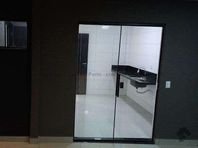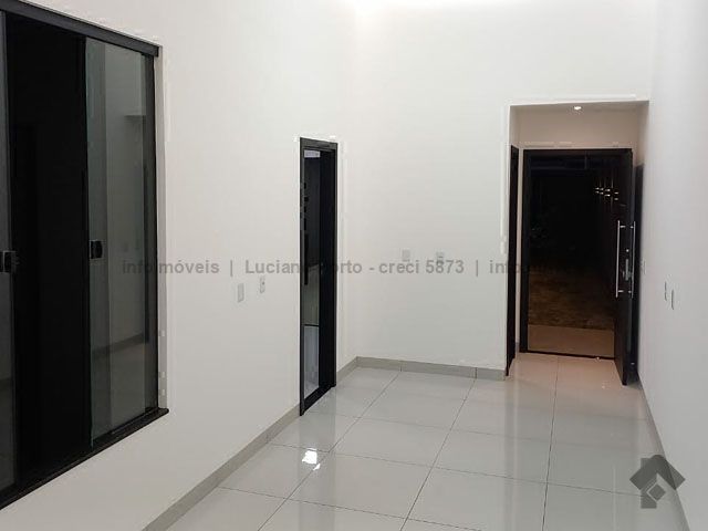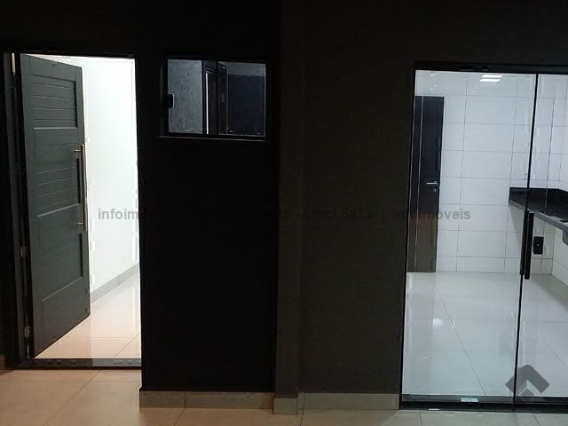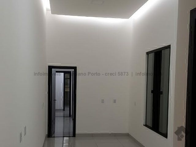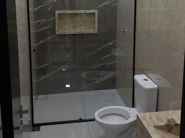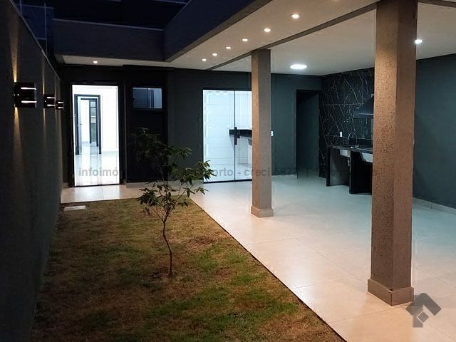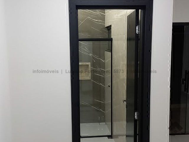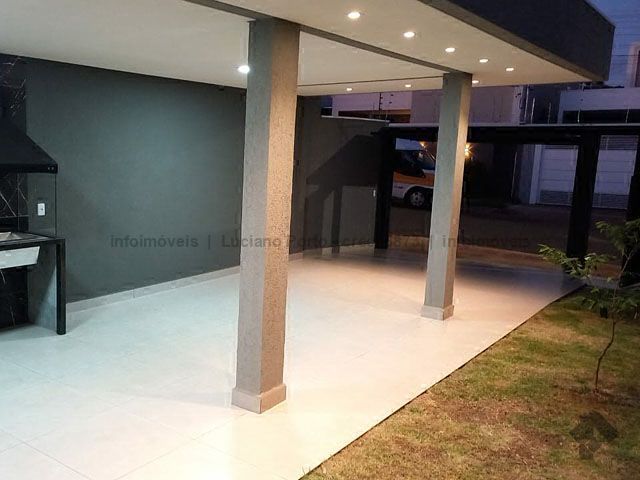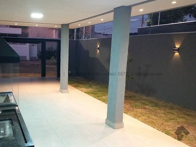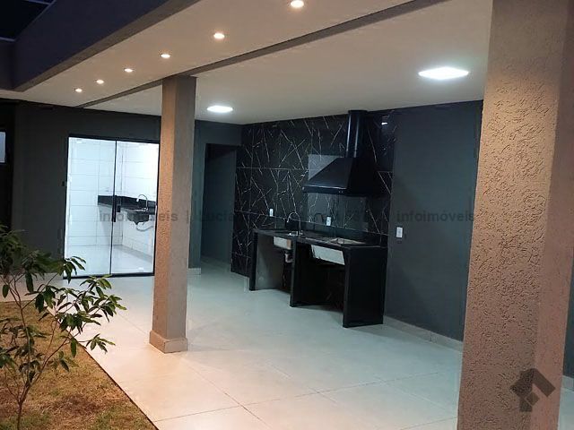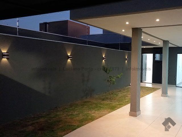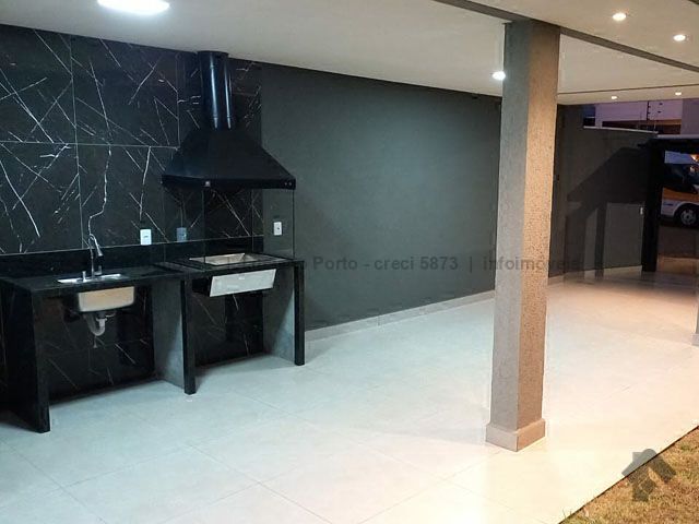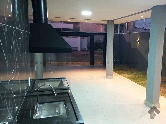 Casa de alto padrão com sala dois ambientes com pé direito duplo, cozinha e área gourmet integradas, uma suíte master, dois quartos, banheiros com cubas esculpidas em mármore, blindex e revestimento até o teto, churrasqueira com grill, área de serviço, jardim, quintal e garagem para dois carros. Toda em porcelanato, janelas e revestimentos de primeira linha, rebaixos e detalhes em gesso, iluminação em LED, revestimento externo em grafiato, com captação de águas pluviais.