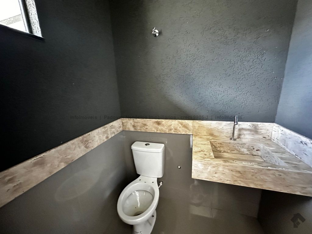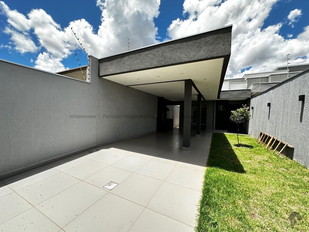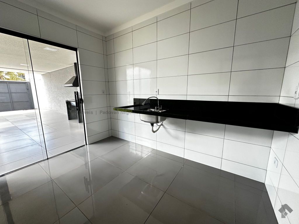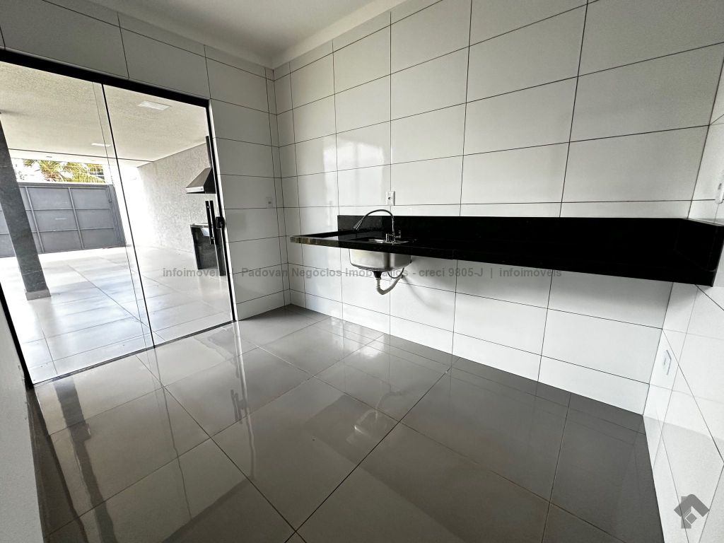 Casa com varanda gourmet, três suítes, sala ampla, cozinha integrada.