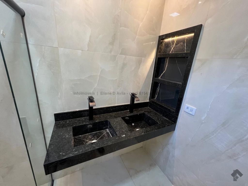 Quatro suítes, uma com closet, sala de estar, sala de jantar, cozinha, cozinha gourmet, lavabo, área de serviço, garagem coberta para quatro carros e quatro descobertos, cerca elétrica, concertina, interfone, água quente, aquecedor solar, box nos banheiros. 210 m² construídos em 361 m² de terreno.
