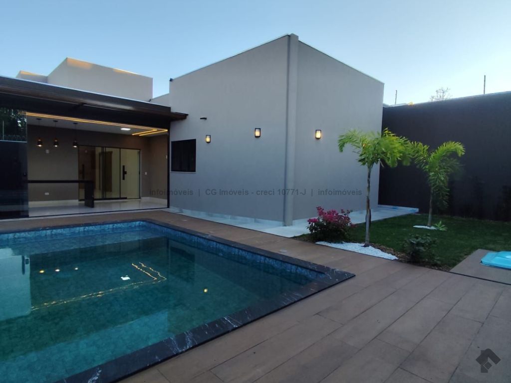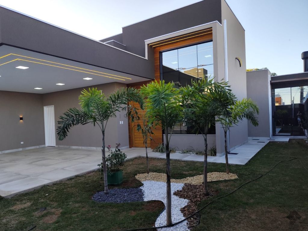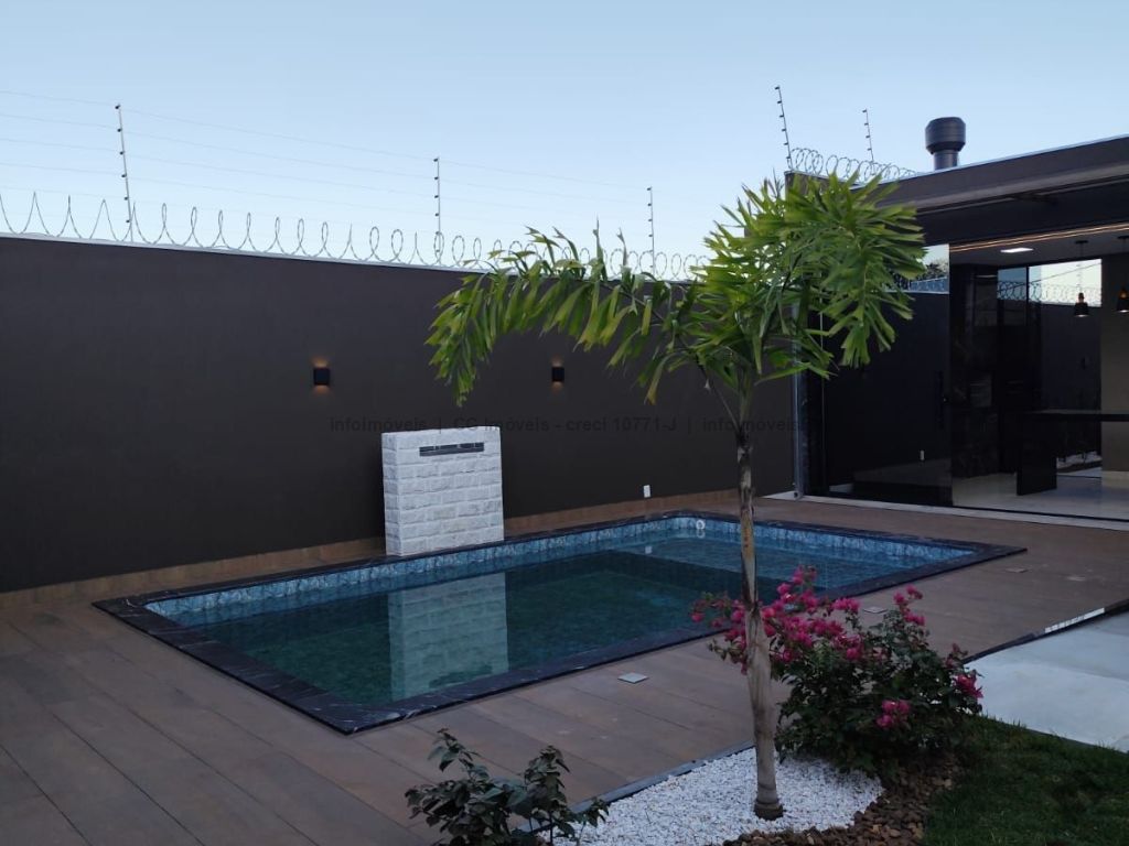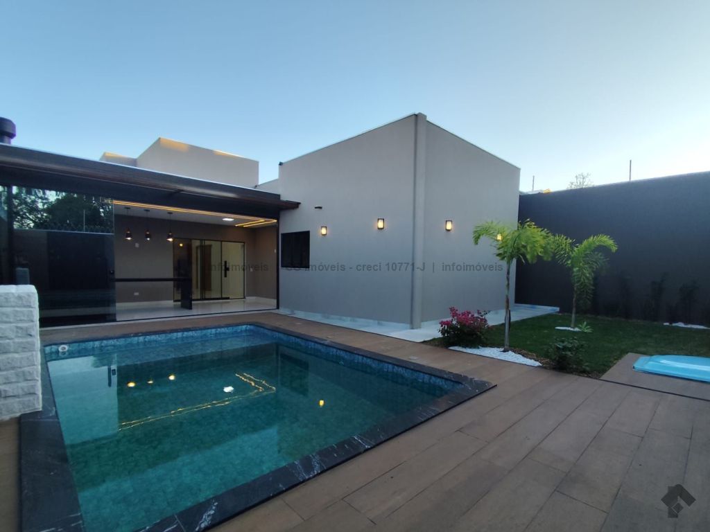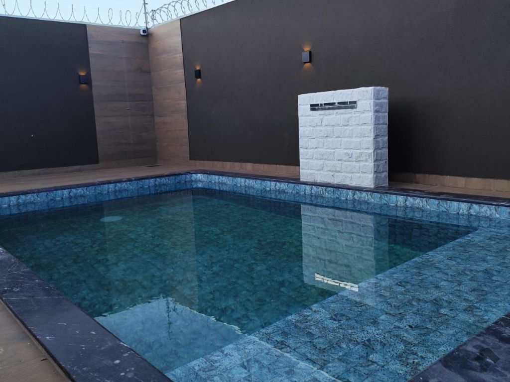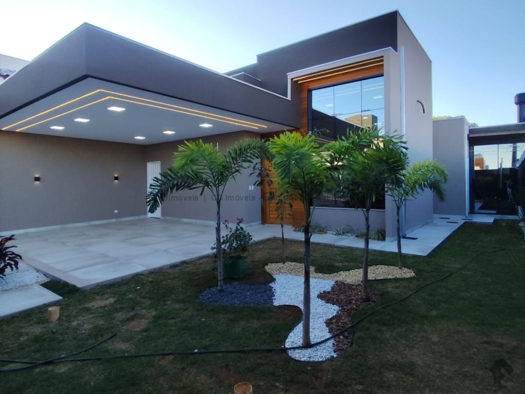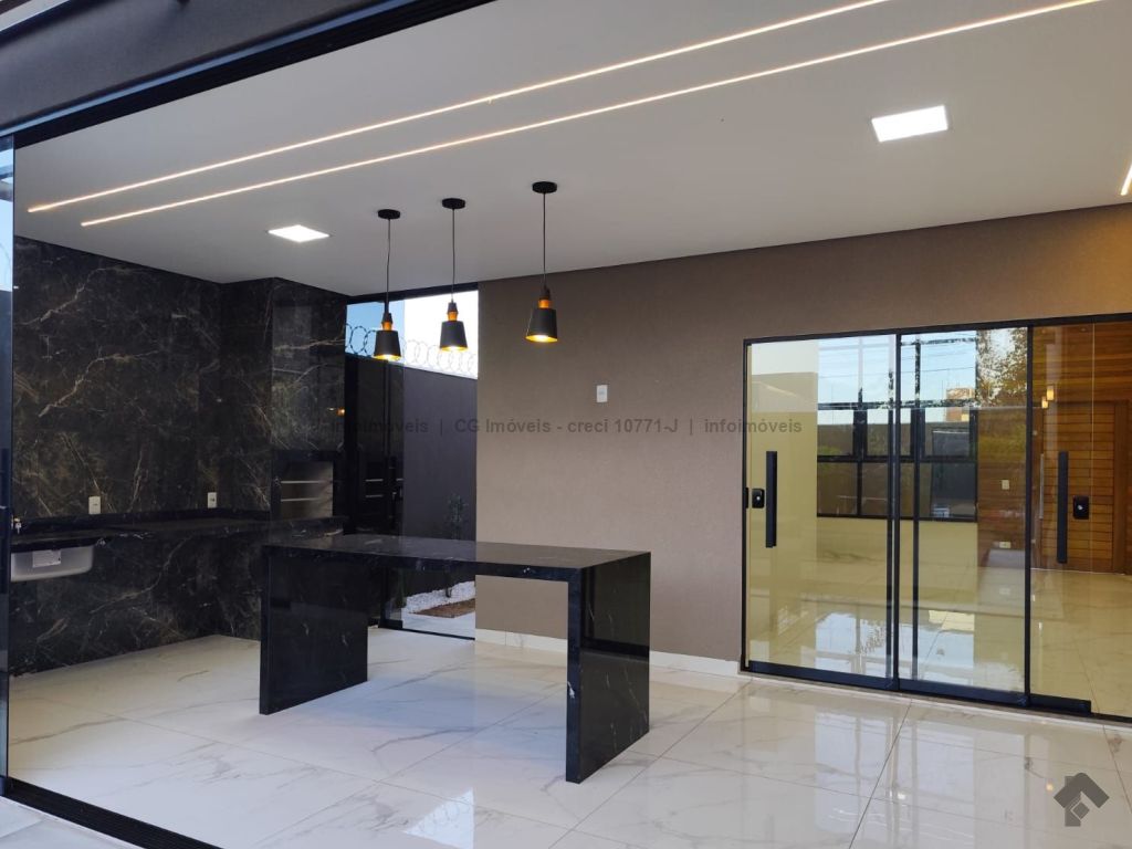 Projeto luminotécnico, paisagismo, três quartos sendo uma suíte master com closet, sala ampla com dois ambientes, pé direito alto, cozinha individualizada com pia e bancada em mármore, banheiro social com box blindex, nicho embutido e pia esculpida em quartzo, garagem coberta para quatro veículos, área de serviço coberta, área gourmet com ilha central em mármore, churrasqueira quadrada revestida, pia e bancada em mármore, fechada com blindex, piscina com hidromassagem, cascata e aquecida, lavabo, ducha externa.
