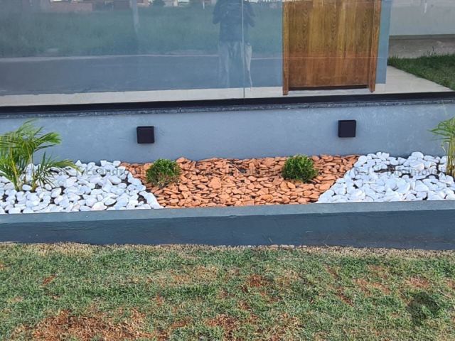 Terreno: 100 m² (de esquina). Área construída: 98 m². Design moderno com pé direito alto de 3,30 m. Cerca elétrica para sua segurança. Portão de elevação com motor e portão social. 2 quartos, sendo 1 suíte do casal, super aconchegante. Banheiros com pias em mármore de alta qualidade. Porcelanato de 1ª linha em toda a casa. Terreno calçado, gramado e com granelli. Marquise que traz conforto e proteção.