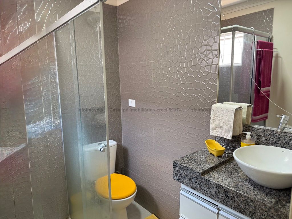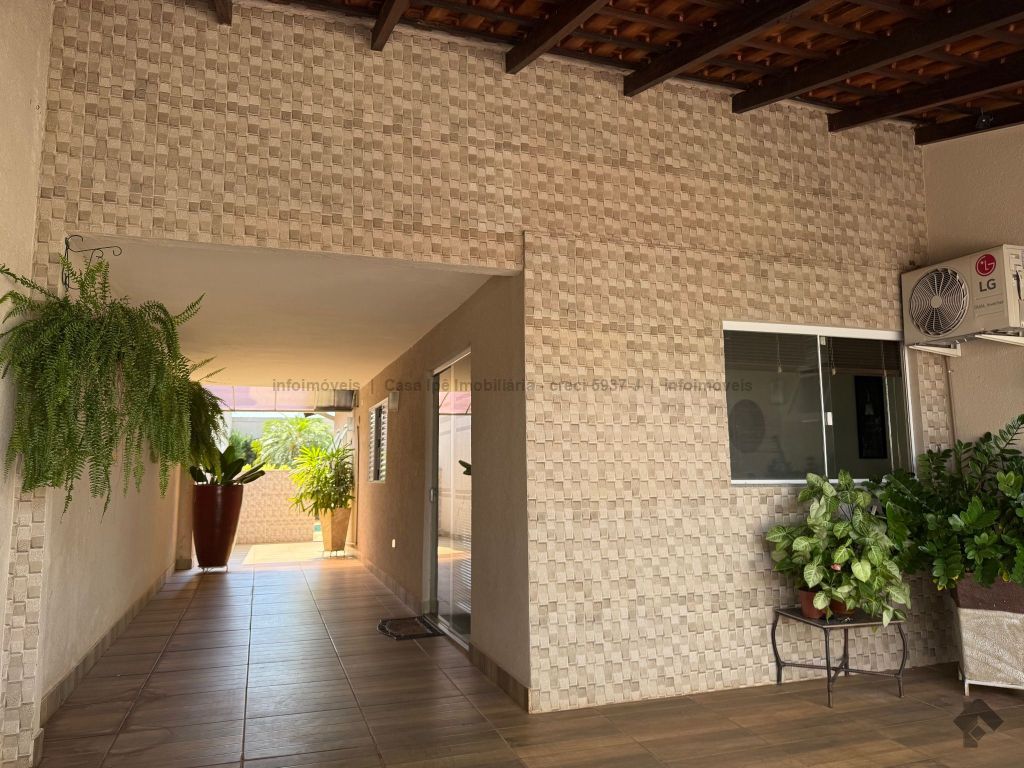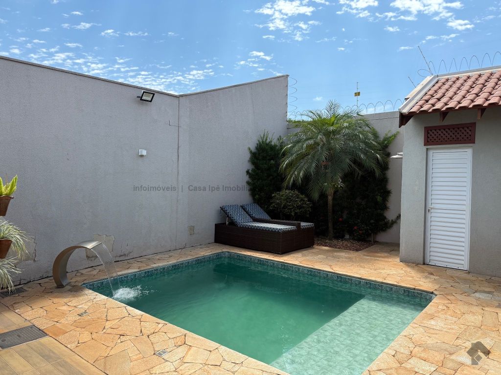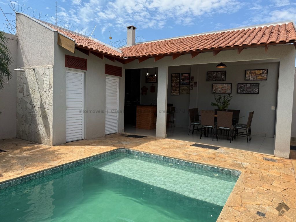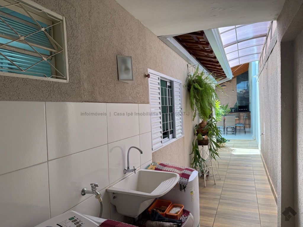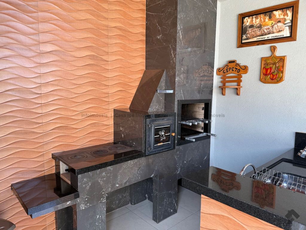 Casa térrea com três suítes, toda de laje, com sala de estar integrada à sala de jantar e televisão. Varanda gourmet espaçosa com churrasqueira, forno e fogão a lenha, integrada com piscina com hidromassagem e jardim, além de depósito e banheiro para a área externa.