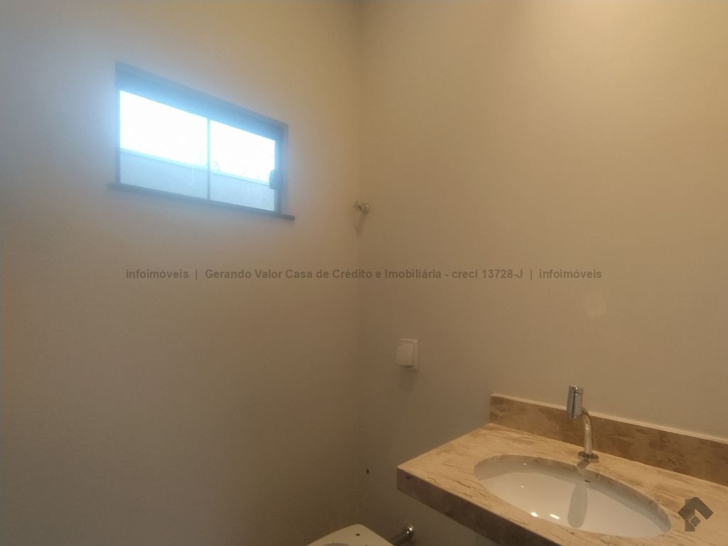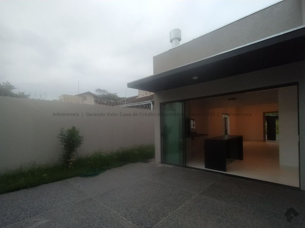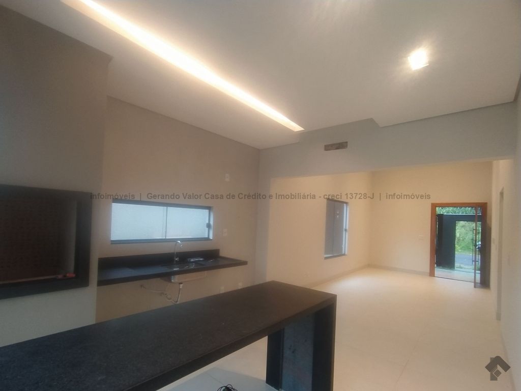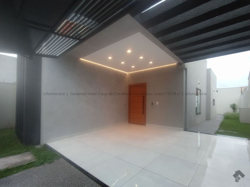 Casa de alto padrão contendo sala com pé direito alto, cozinha gourmet com bancada em mármore preto, três quartos, sendo uma suíte, um banheiro social, um lavabo, lavanderia coberta. Calçadas revestidas em fulget, portão de elevação grande com motor, concertina, cerca elétrica, porcelanato, pergolado, iluminação em LED, garagem para dois carros, sendo uma vaga coberta.