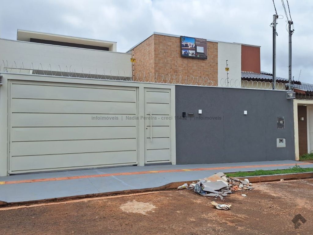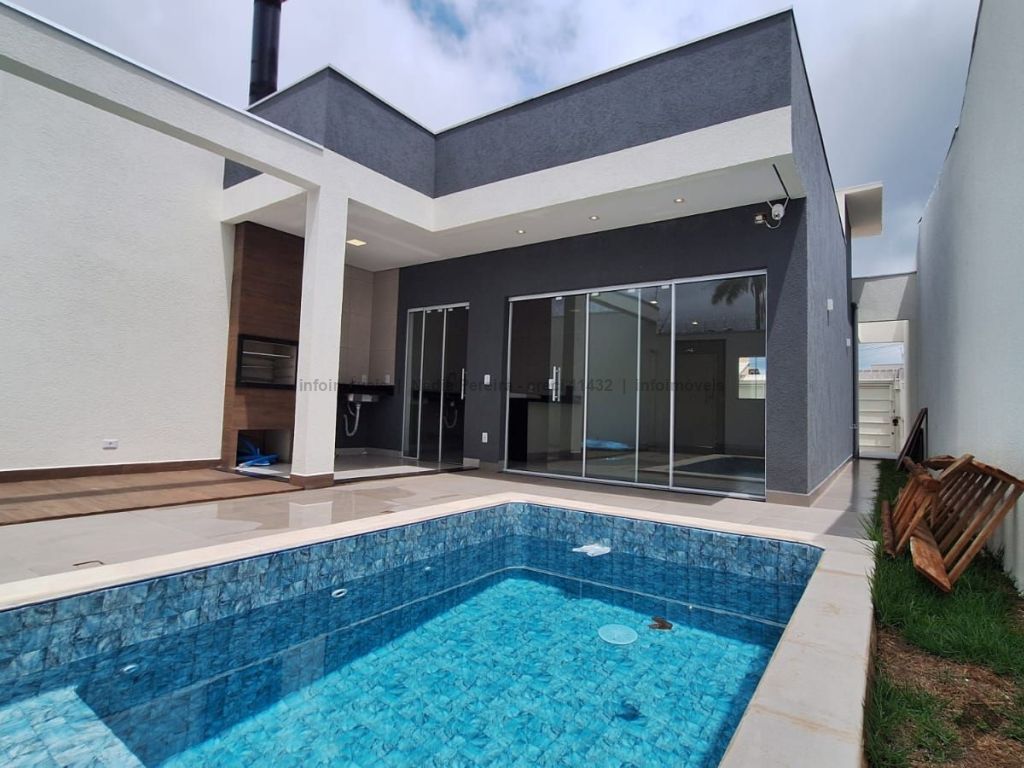 Casa nova, com 200 m² contendo 3 quartos, sendo uma suíte com closet, banheiro social, sala ampla, área de serviço, espaço gourmet com churrasqueira, mini cozinha, piscina com iluminação, sistema de câmeras IP com detecção de movimento, cerca elétrica, concertina, portas laqueadas, saída para ar condicionado. Casa bem luxuosa, com granitos e acabamento de qualidade. Garagem para 2 carros.