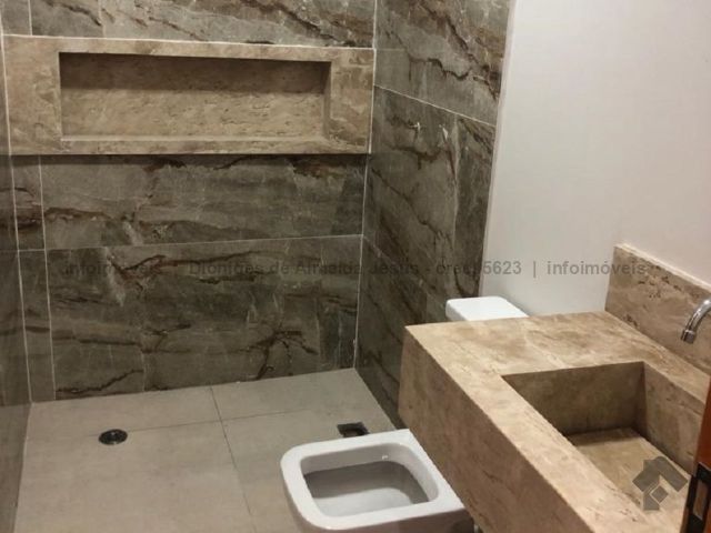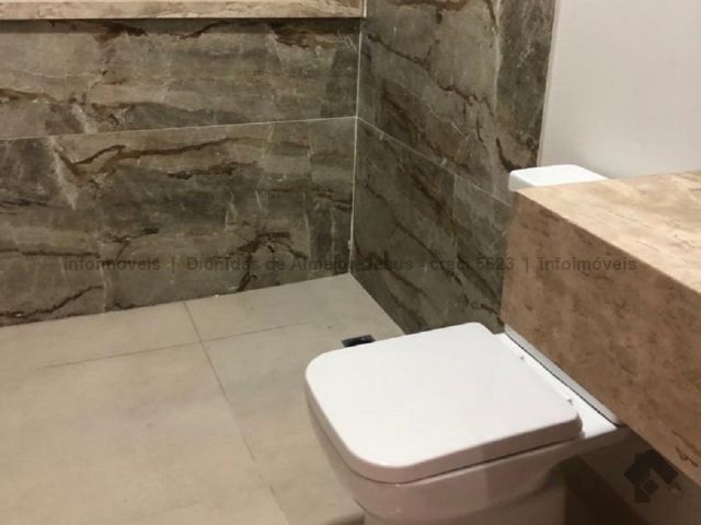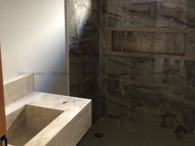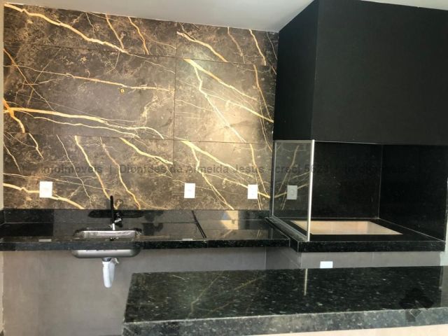 Toda de laje com rebaixo de gesso na sala e pé direito alto, pias da cozinha, área gourmet e balcão em granito, dos banheiros, nichos e pia do lavabo em mármore travertino, janelas em vidro temperado, piso e revestimento em porcelanato, rodapé embutido, corredor lateral e quintal, parte permeável gramada.
