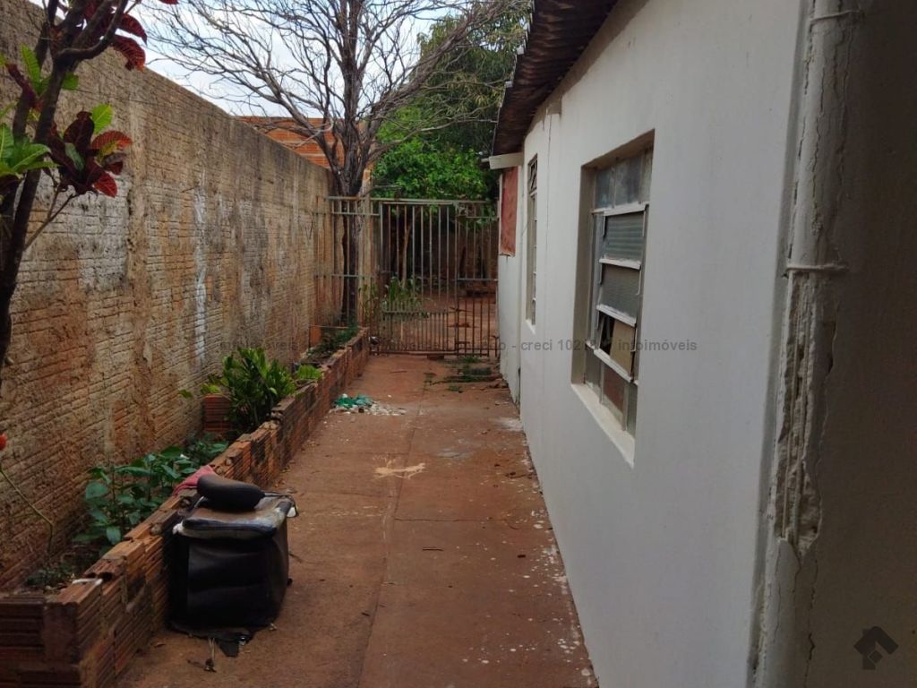 Terreno com casa coberta com eternit sem forro, rua sem asfalto com uma construção no fundo.