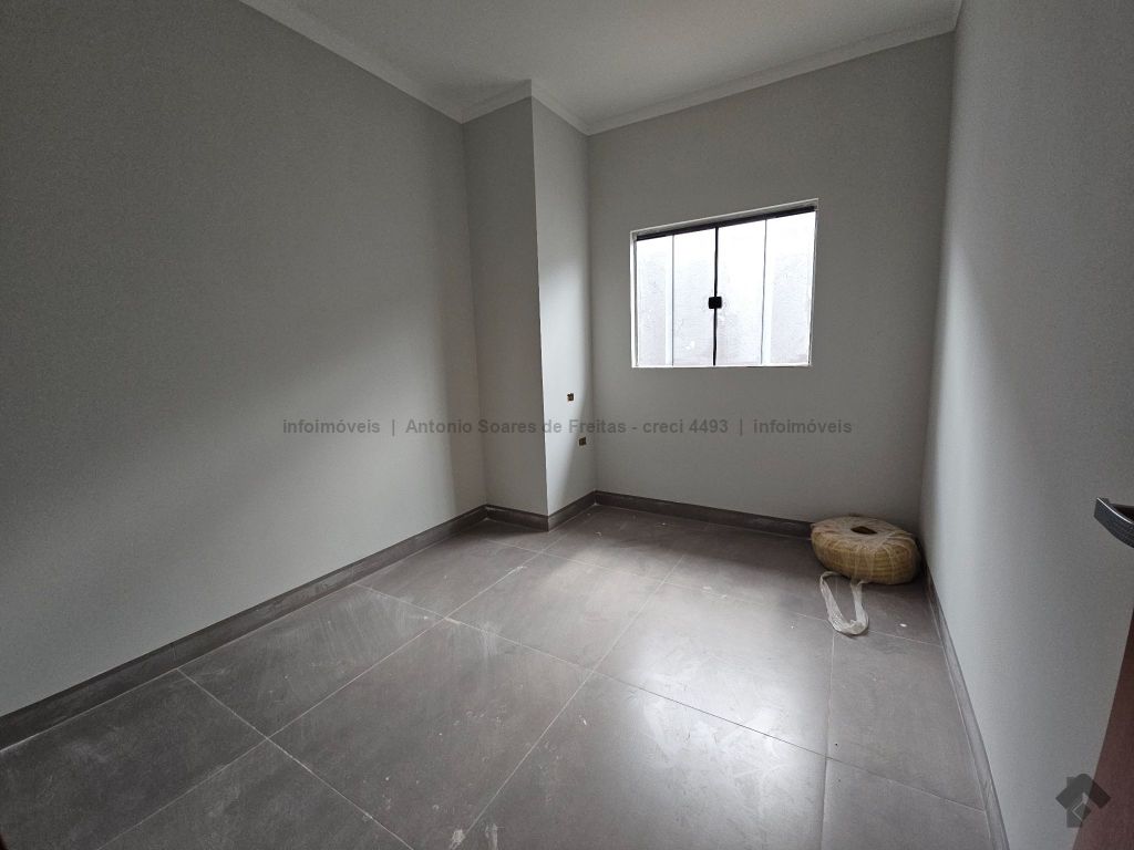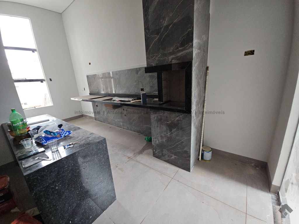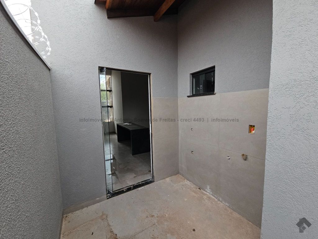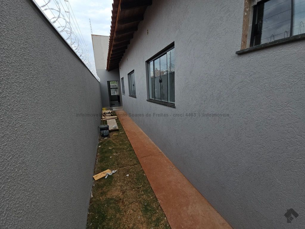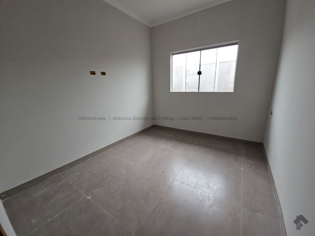 3 quartos, sendo 1 suíte, sala, cozinha acoplada com churrasqueira, área de serviço coberta, banheiro social, garagem coberta, terreno aos fundos.