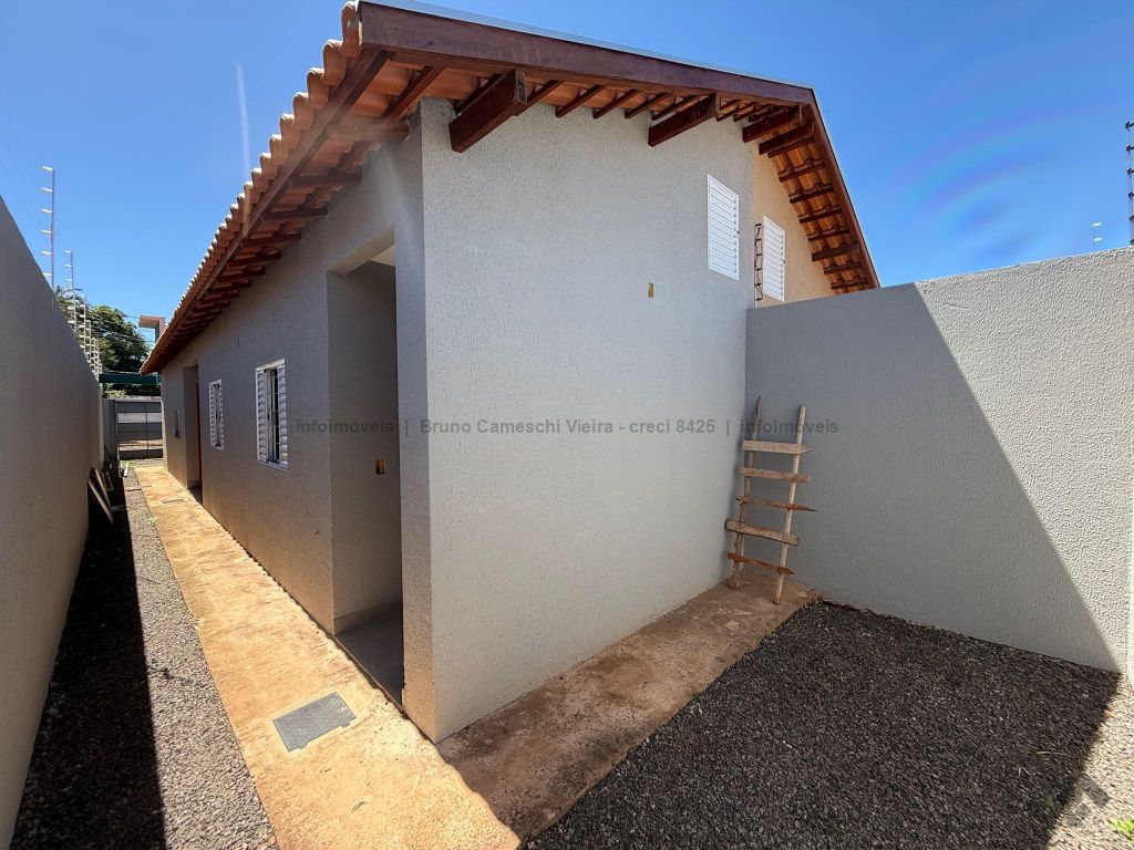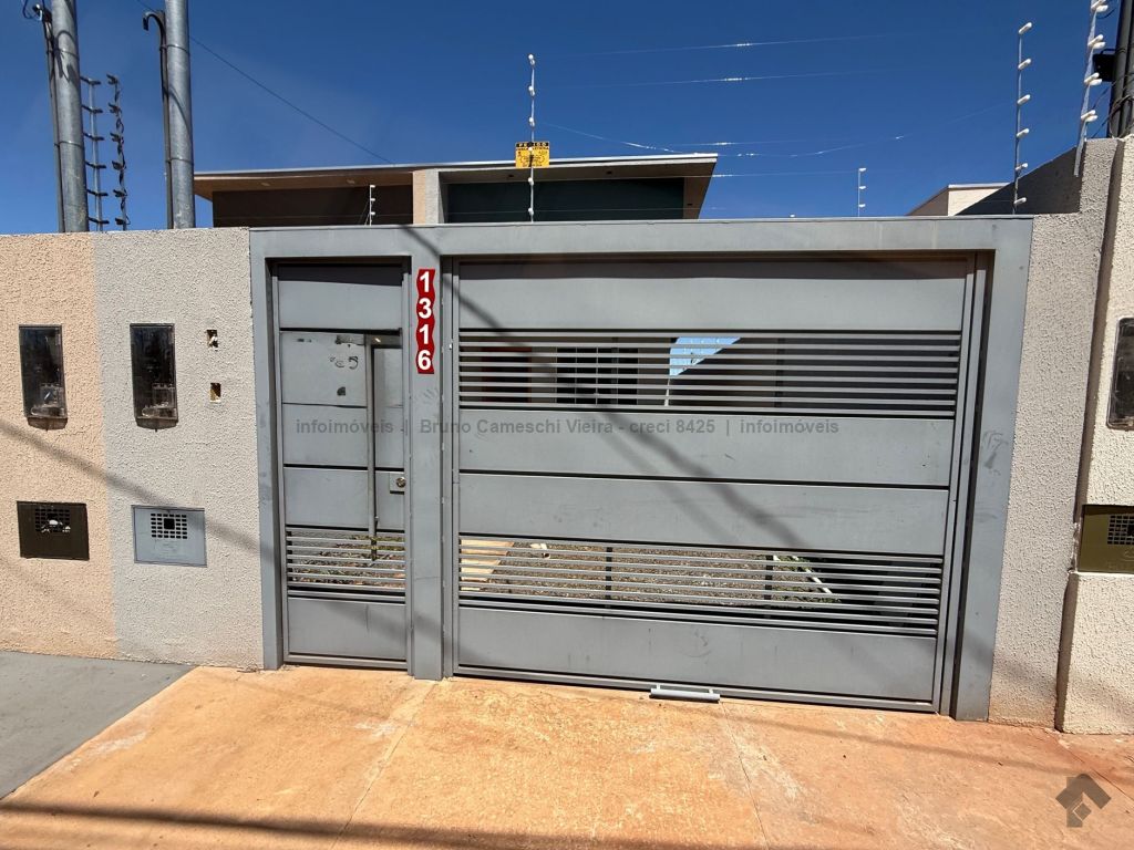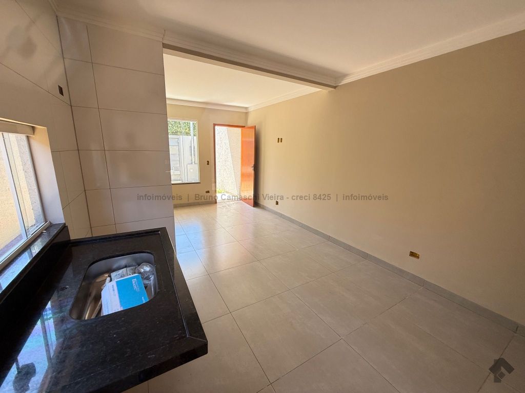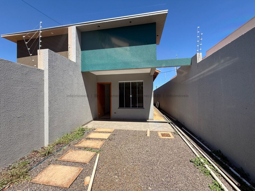 A casa possui dois quartos, sendo um suíte, uma sala e cozinha, um banheiro social, área de serviço e garagem para dois carros.