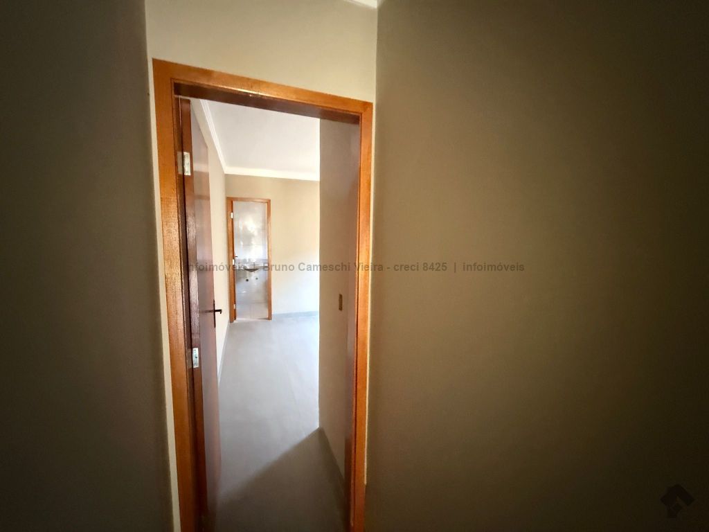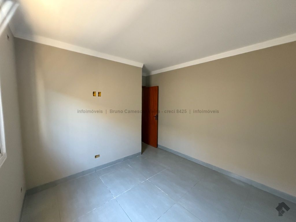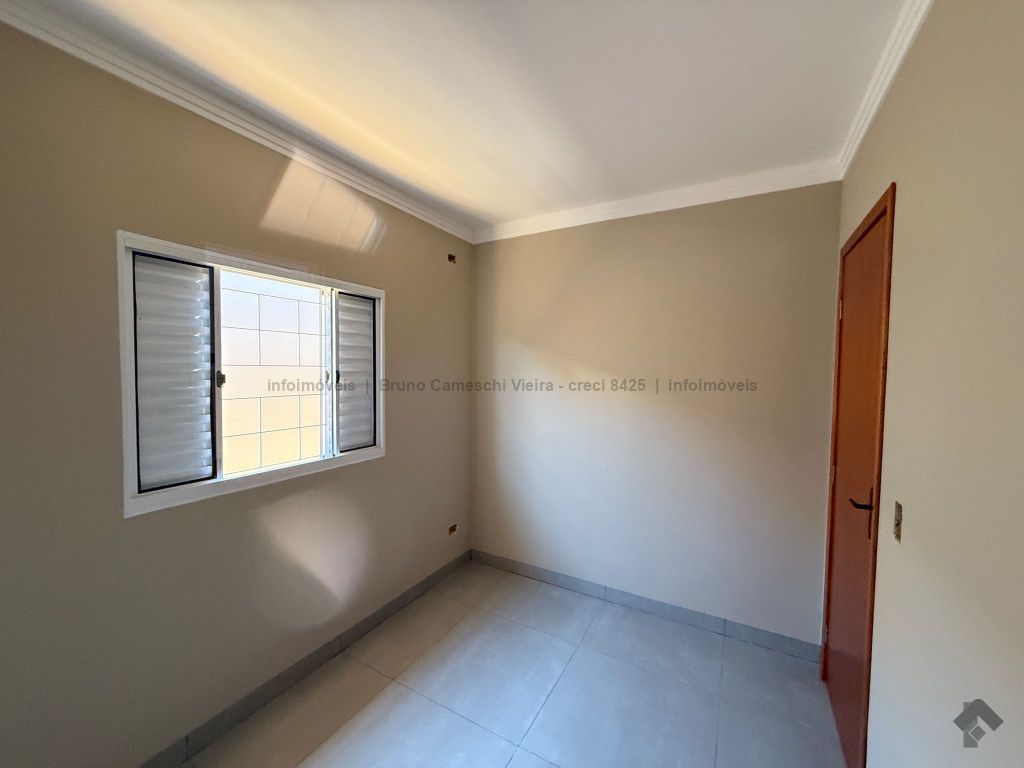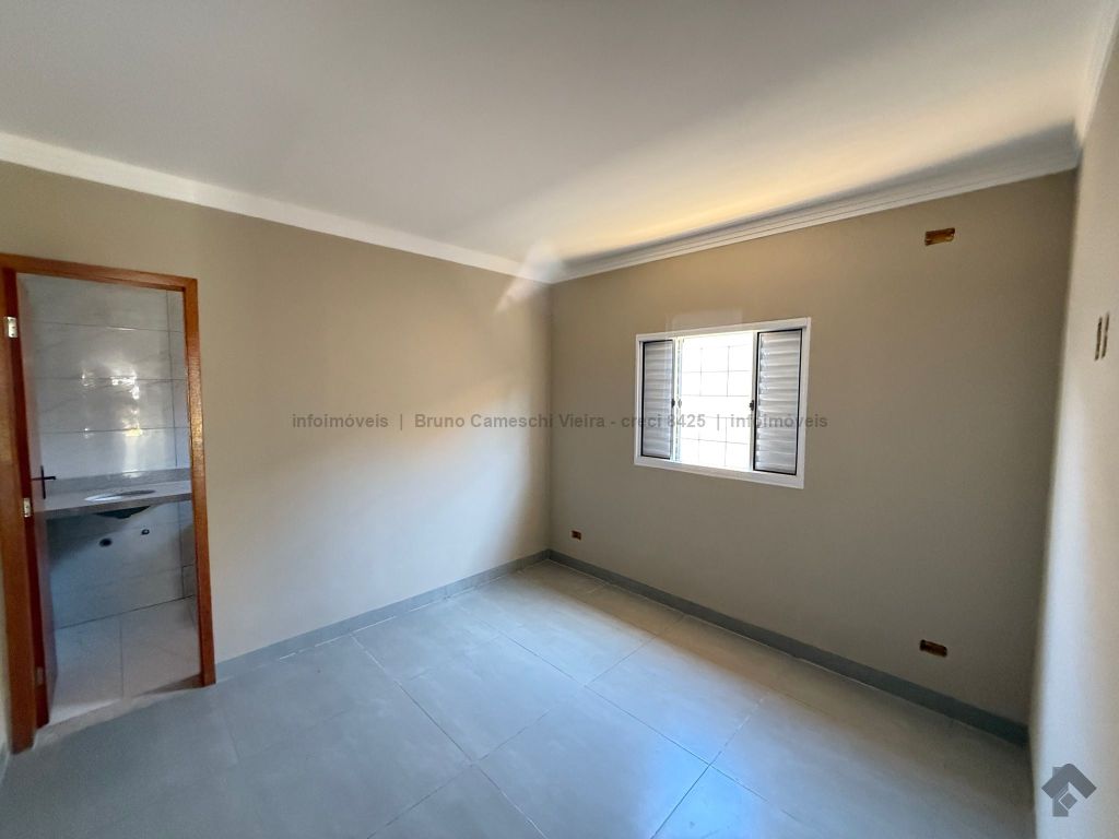 A casa possui dois quartos, sendo um suíte, uma sala e cozinha, um banheiro social, área de serviço e garagem para dois carros.