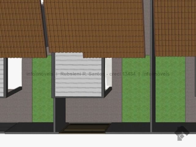 Tem 55 m² construídos, dois quartos, sala, cozinha, WC social e garagem coberta. O terreno varia um pouco, mas fica na faixa dos 110 m², com bastante espaço de quintal.