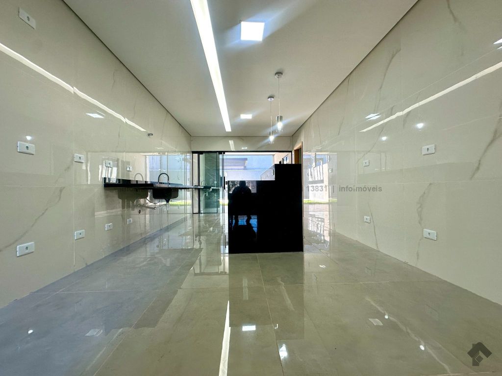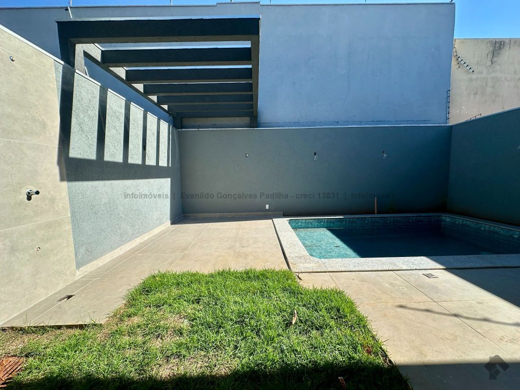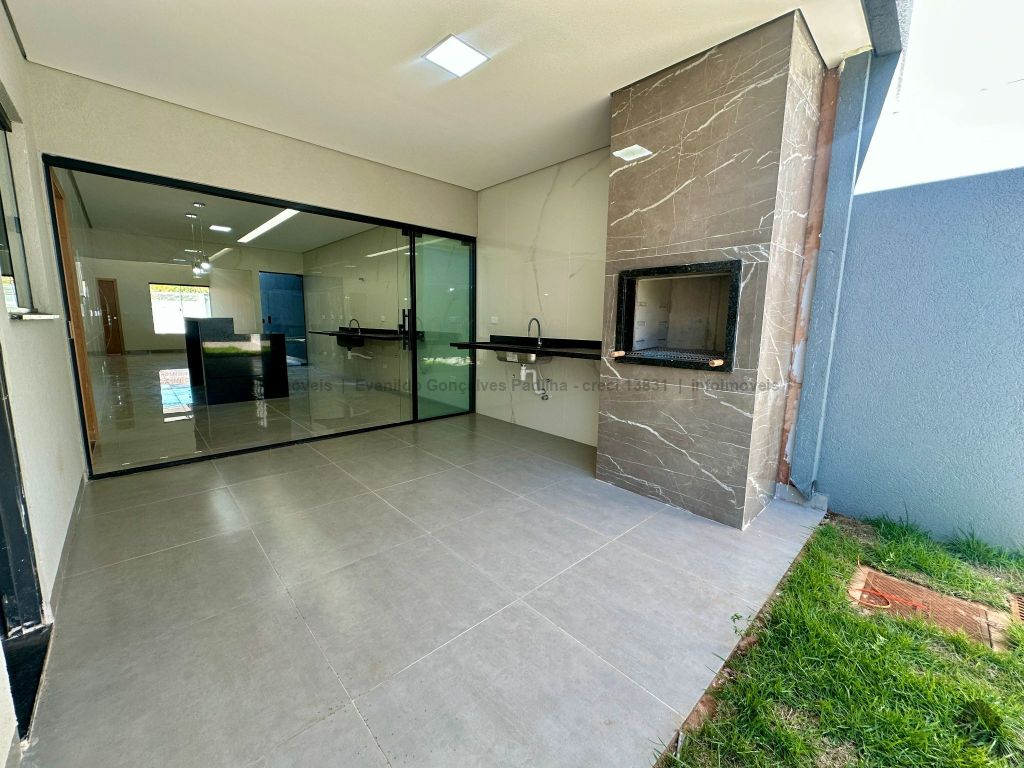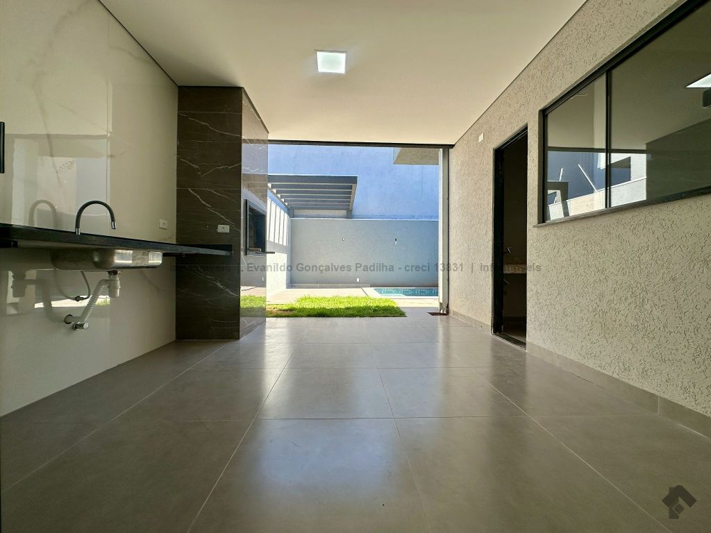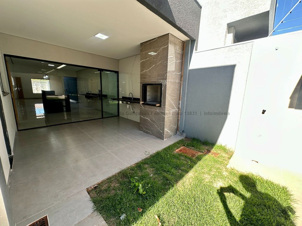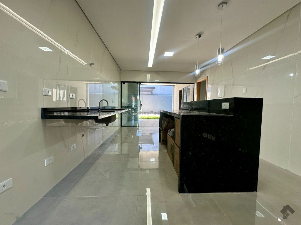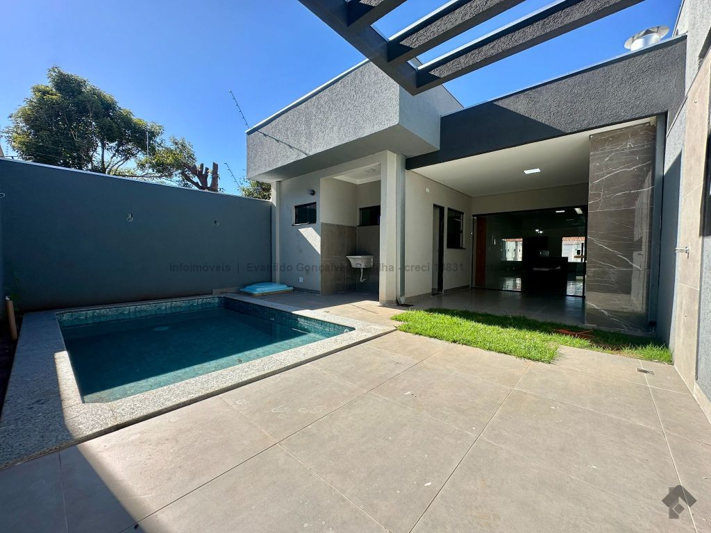 Belíssima casa térrea nova no bairro Rita Vieira 1. Com 3 suítes, 225 m² de área total e 140 m² de área construída. 3 suítes, sendo uma com closet e duas cubas, WC social, lavabo, até 4 vagas de garagem, corredor lateral, sala ampla com pé direito duplo e rebaixamento em gesso, jardim de inverno, cozinha fechada e toda azulejada, espaço gourmet amplo com pia e bancada em mármore e lavabo, lavanderia coberta e isolada, sobra de quintal nos fundos para piscina.
