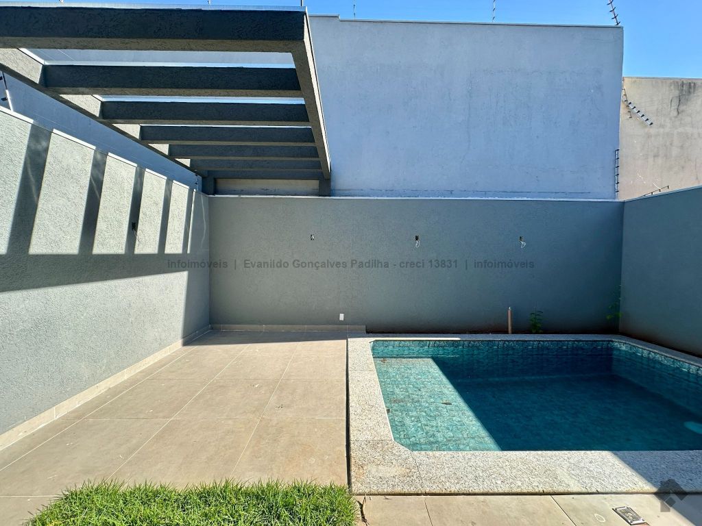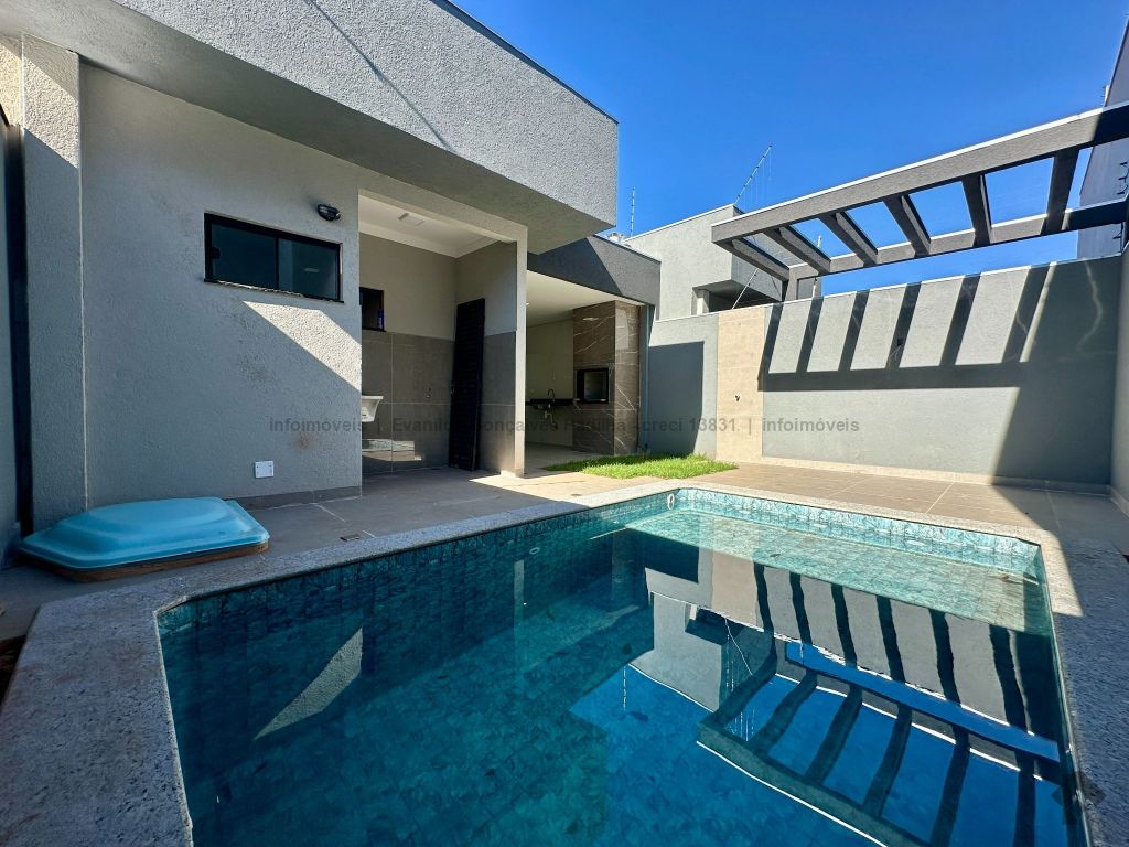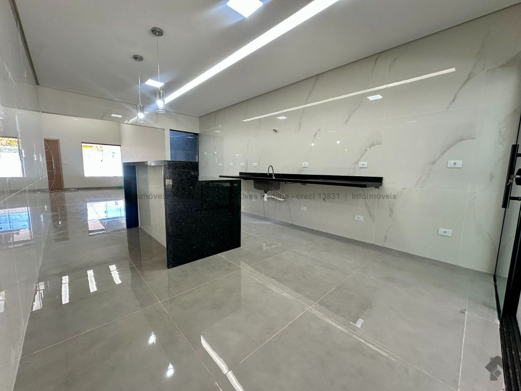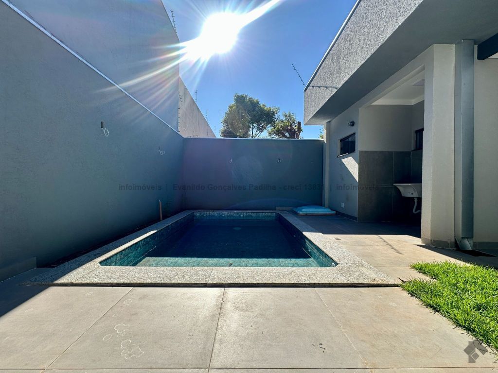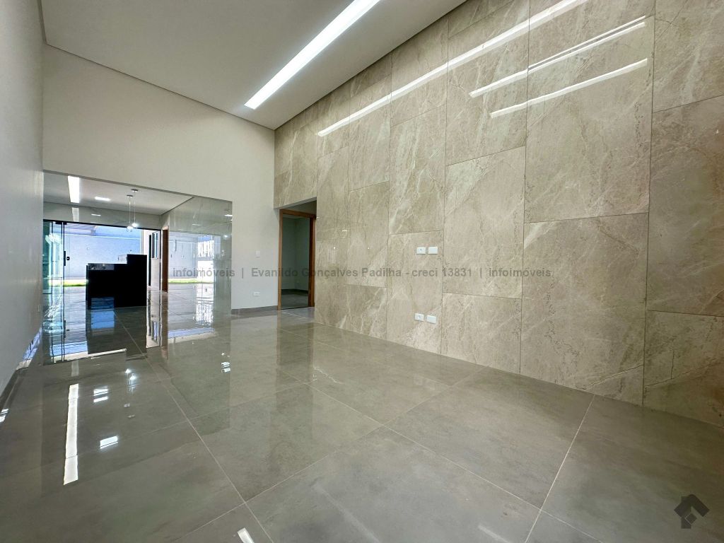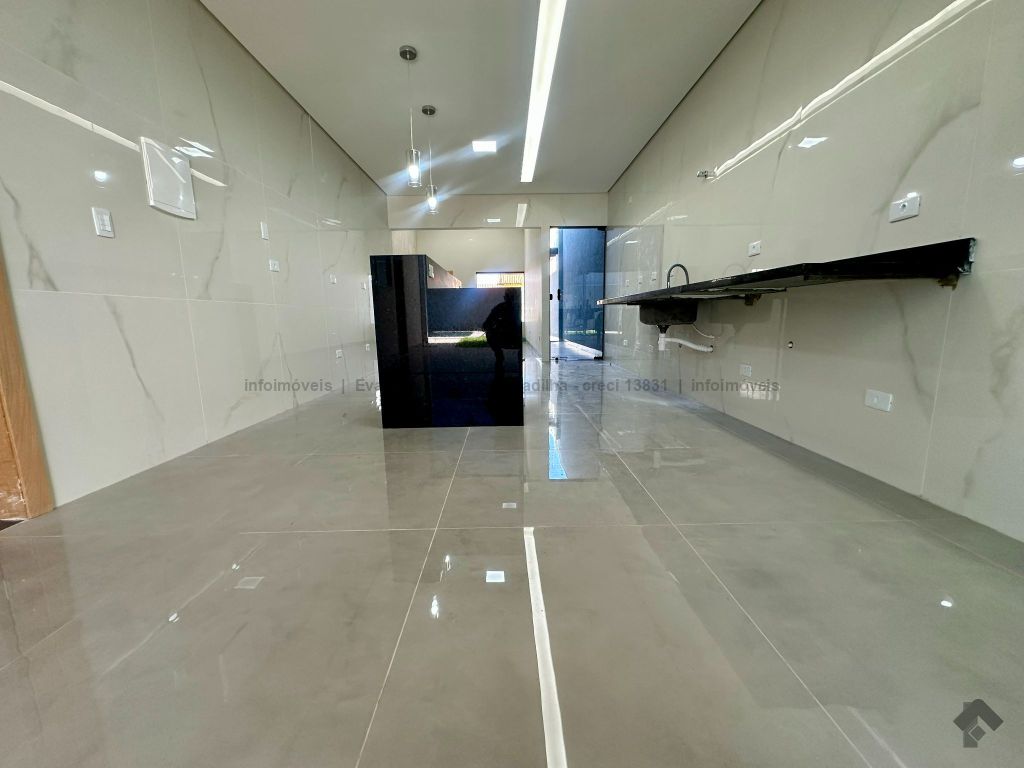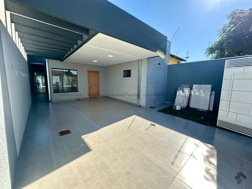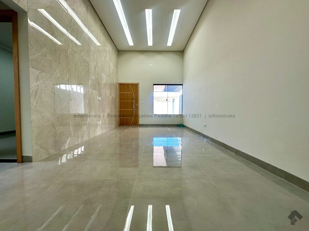 Belíssima casa térrea nova no bairro Rita Vieira 1. Com 3 suítes, 225 m² de área total e 140 m² de área construída. 3 suítes, sendo uma com closet e duas cubas, WC social, lavabo, até 4 vagas de garagem, corredor lateral, sala ampla com pé direito duplo e rebaixamento em gesso, jardim de inverno, cozinha fechada e toda azulejada, espaço gourmet amplo com pia e bancada em mármore e lavabo, lavanderia coberta e isolada, sobra de quintal nos fundos para piscina.