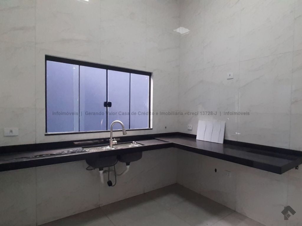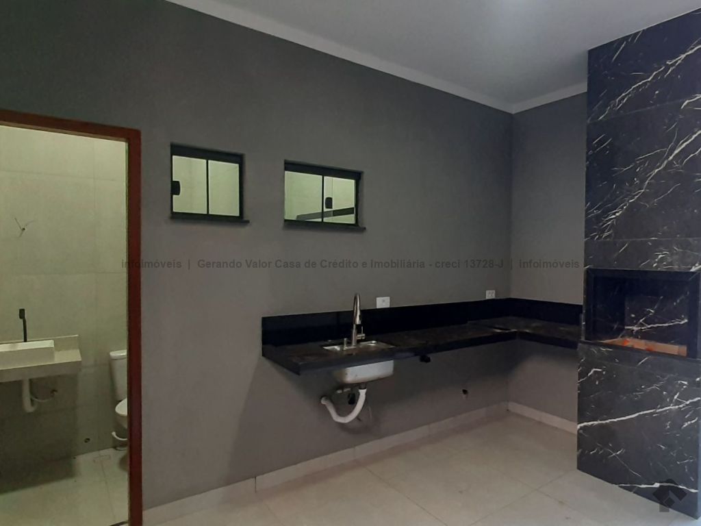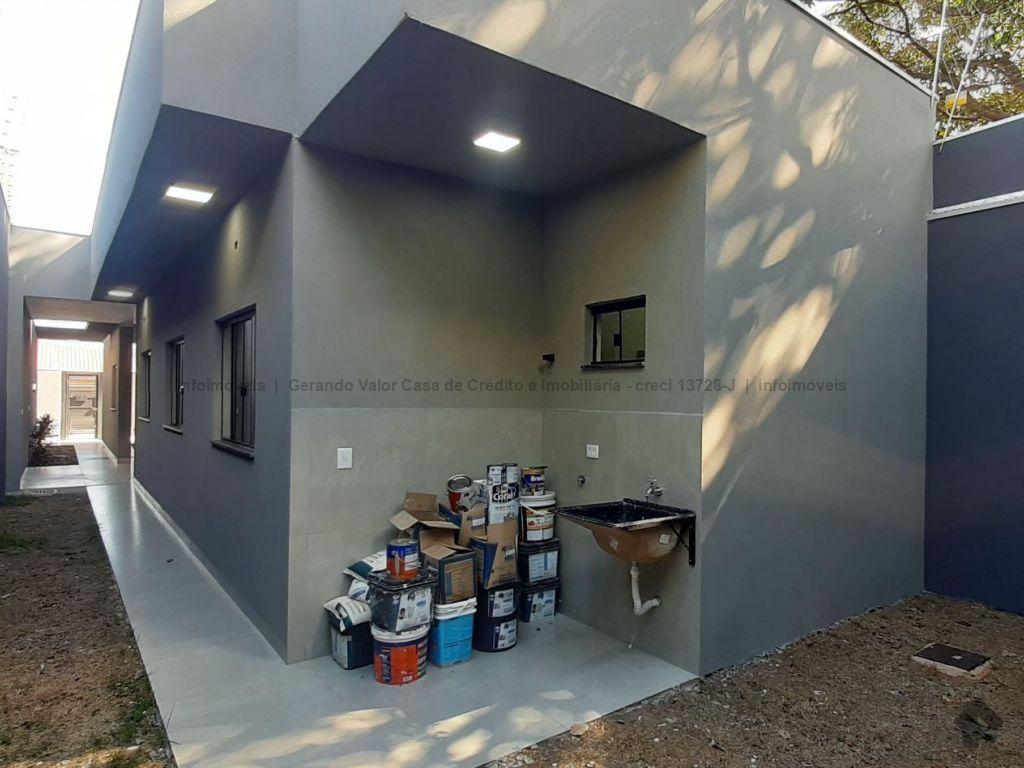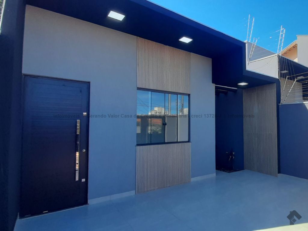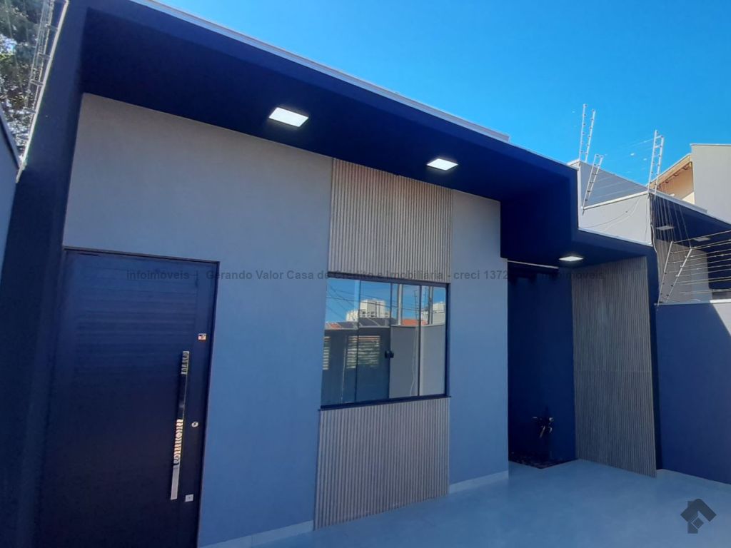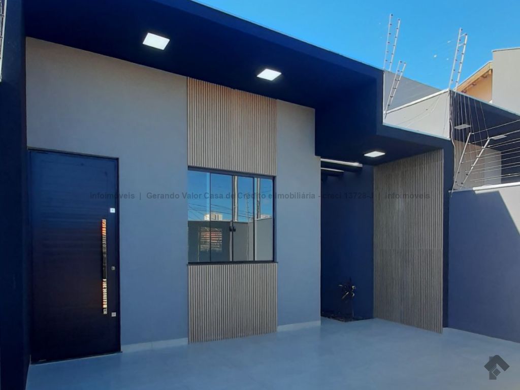 Casa pronta no bairro Rita Vieira. Área construída de 101 m², área total de 180 m², sala com pé direito alto, cozinha com pé direito alto, banheiro social, dois quartos, uma suíte, área gourmet com churrasqueira e pia, coberta, lavabo, área de serviço coberta, garagem para dois carros.