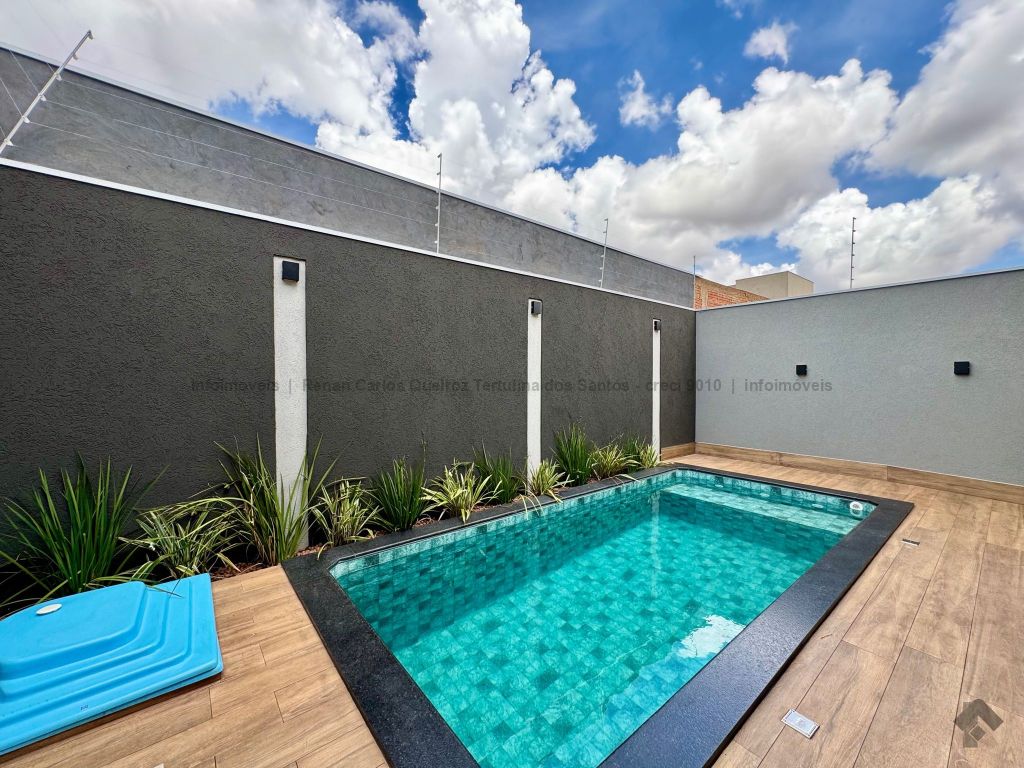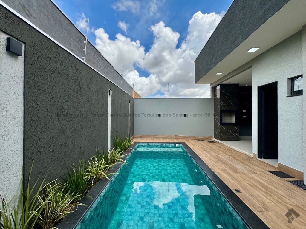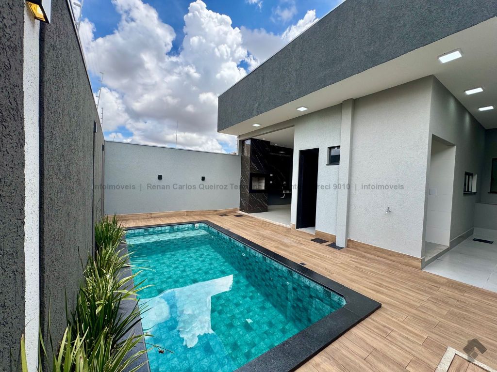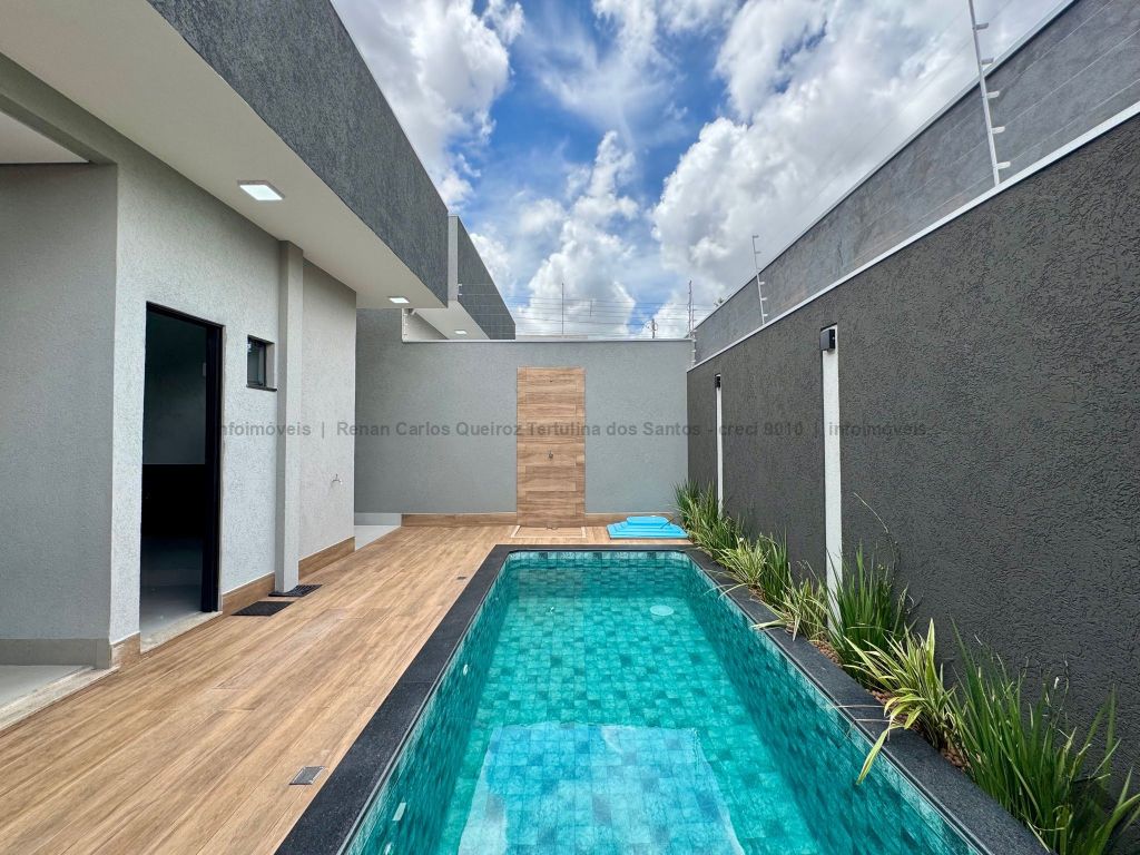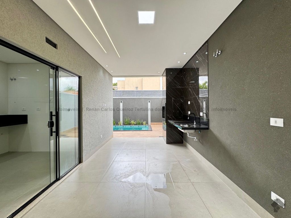 Casa moderna e sofisticada, fachada imponente com volumetria alta. Sala para dois ambientes com pé direito elevado, cozinha integrada com varanda gourmet, lavabo e área de serviço. Três suítes, uma com espaço para closet. Projeto de iluminação e paisagismo, piscina com prainha e hidromassagem. Garagem coberta.