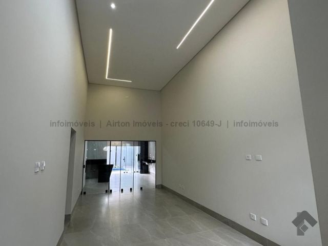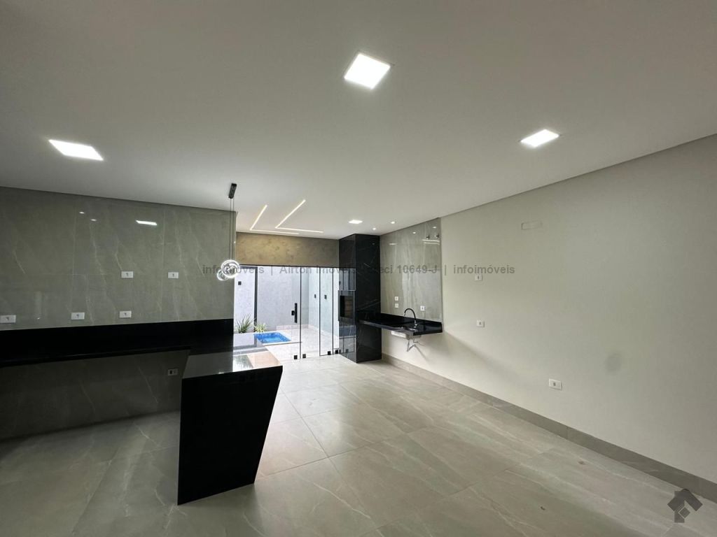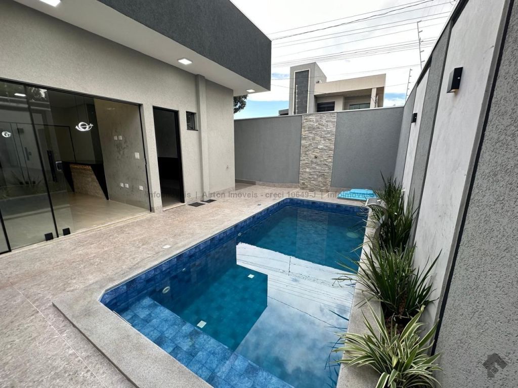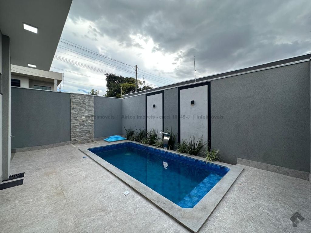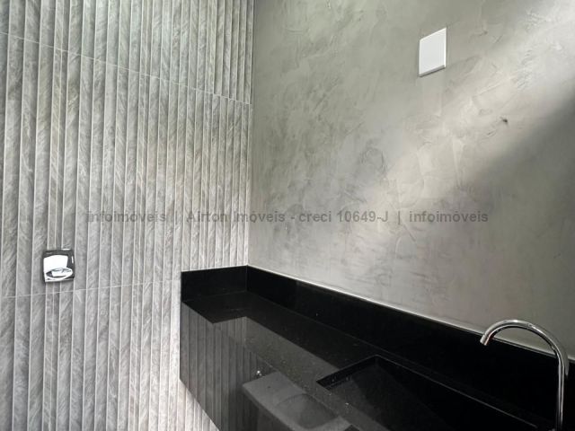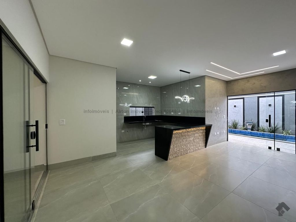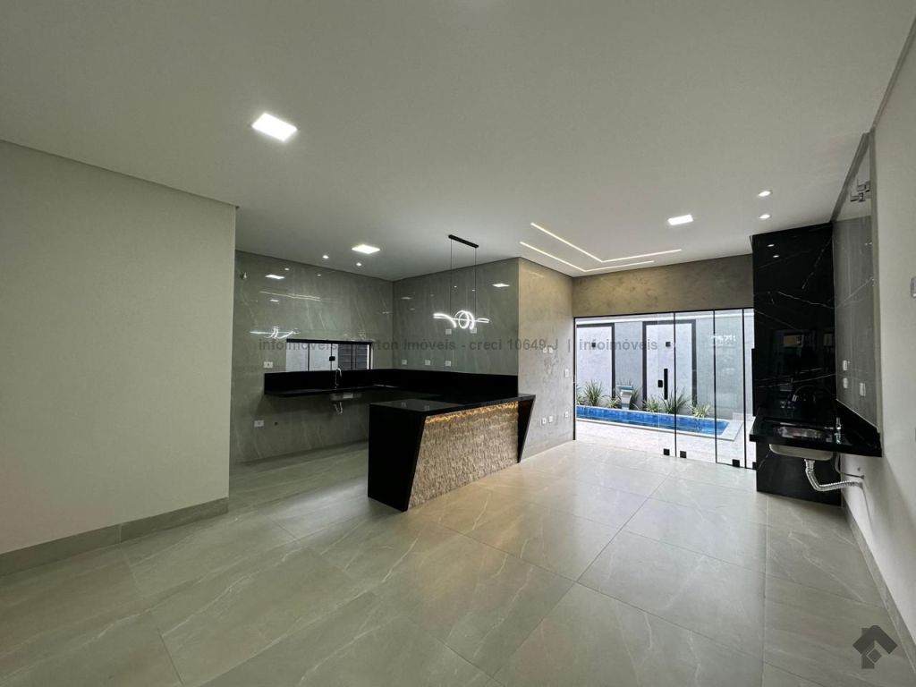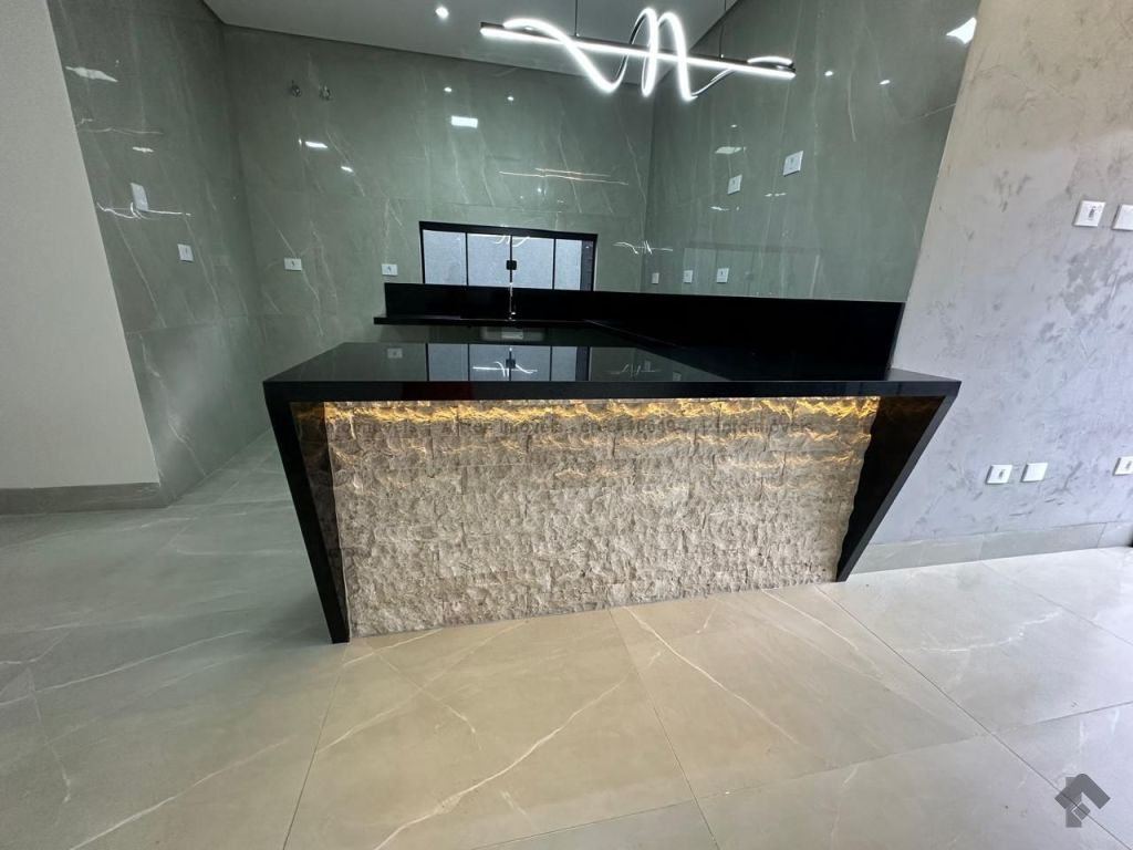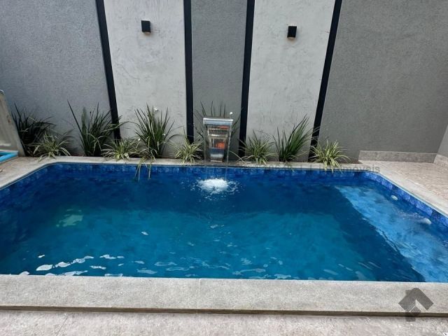 Sala dois ambientes integrada, cozinha, três suítes, área de serviço, espaço gourmet com fachada de vidro, balcão de mármore, lustre sofisticado e acabamento em pedra na ducha, churrasqueira, piscina com cascata e duas vagas de garagem coberta.
