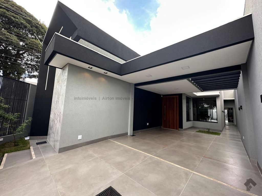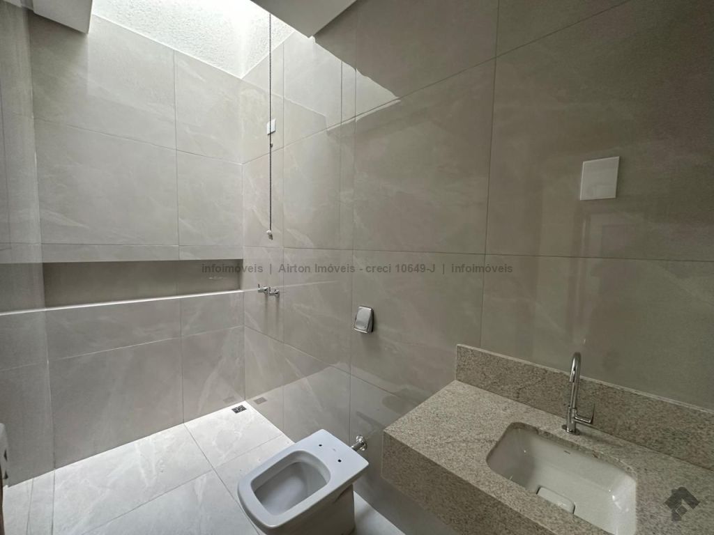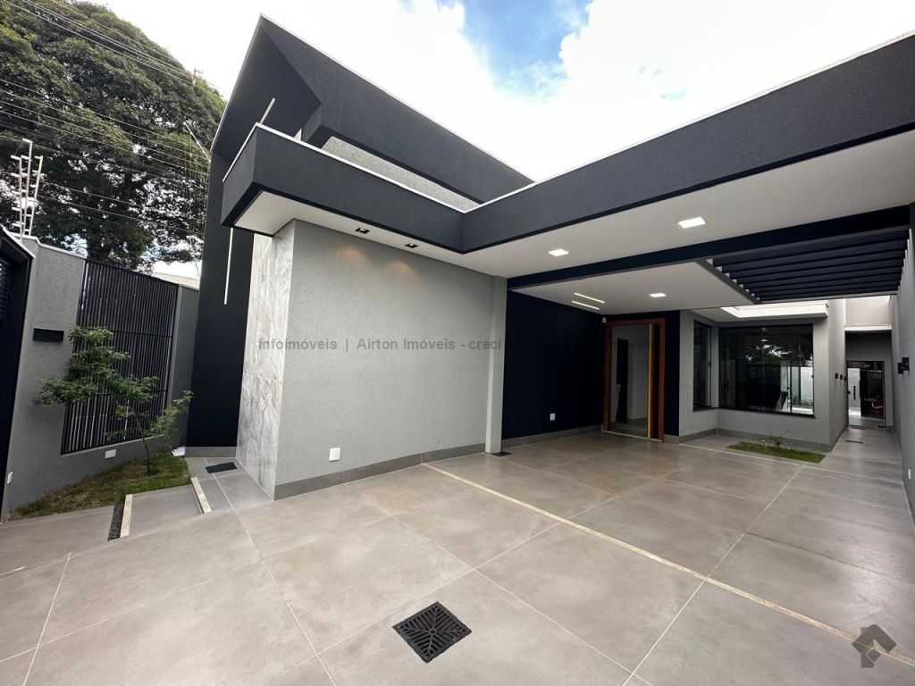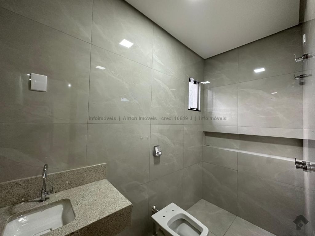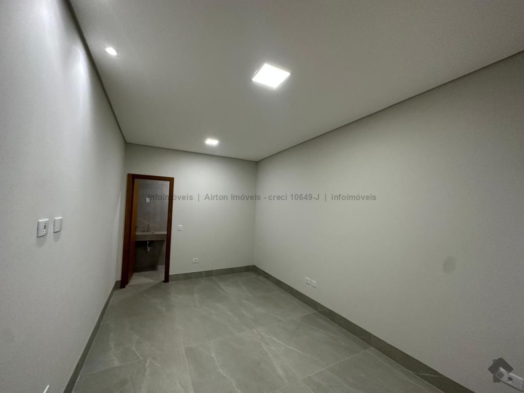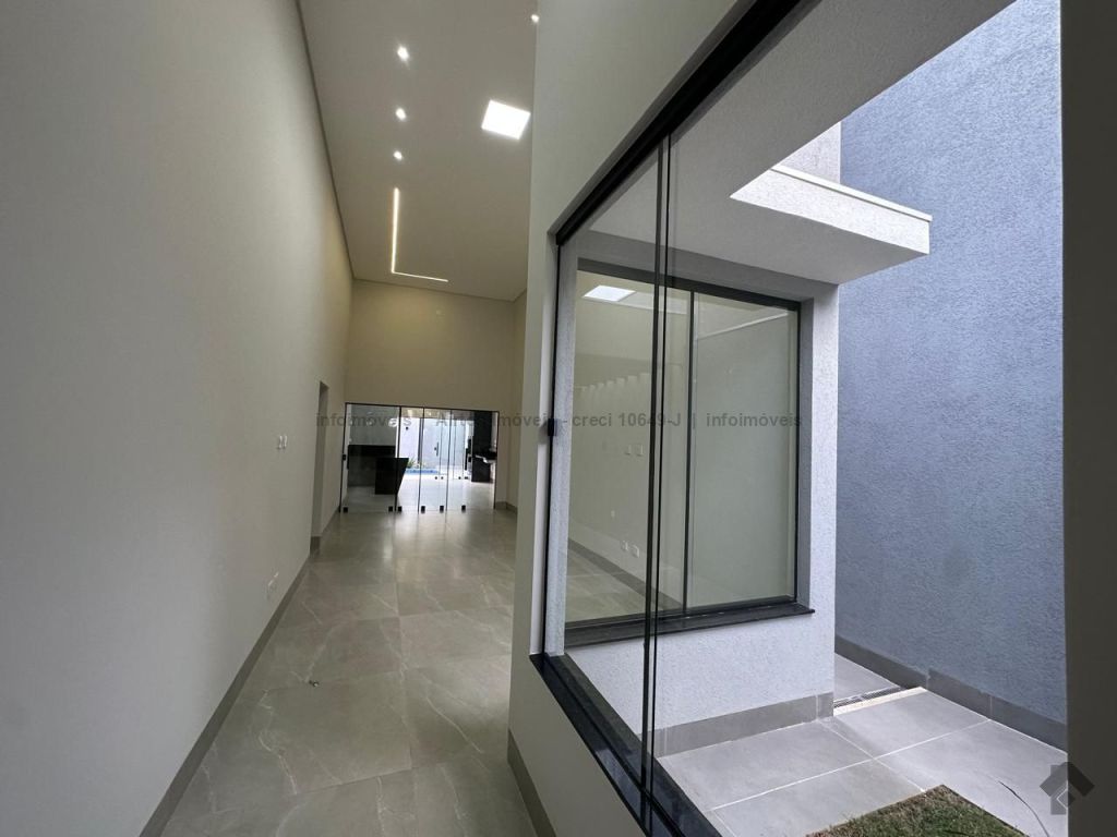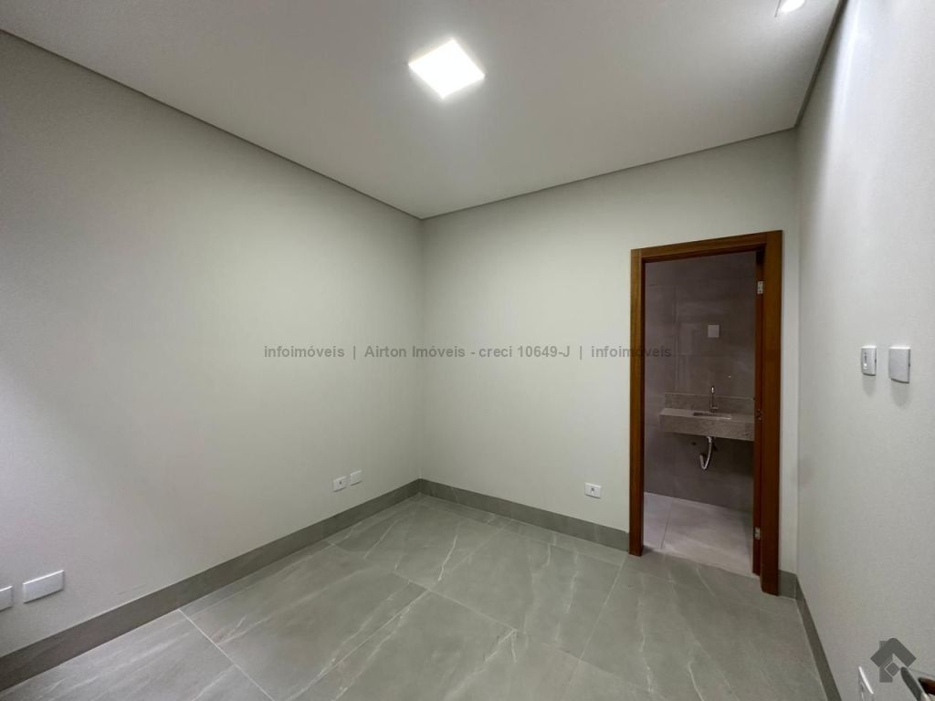 Sala dois ambientes integrada, cozinha, três suítes, área de serviço, espaço gourmet com fachada de vidro, balcão de mármore, lustre sofisticado e acabamento em pedra na ducha, churrasqueira, piscina com cascata e duas vagas de garagem coberta.
