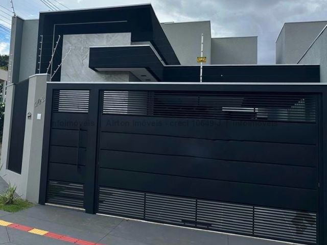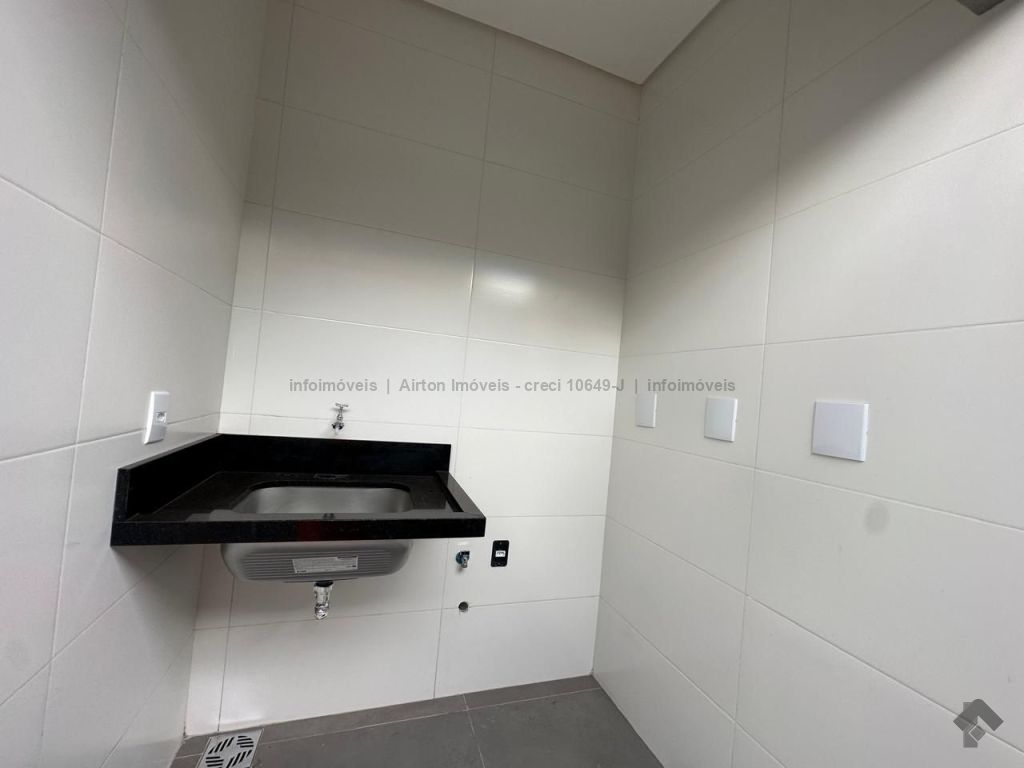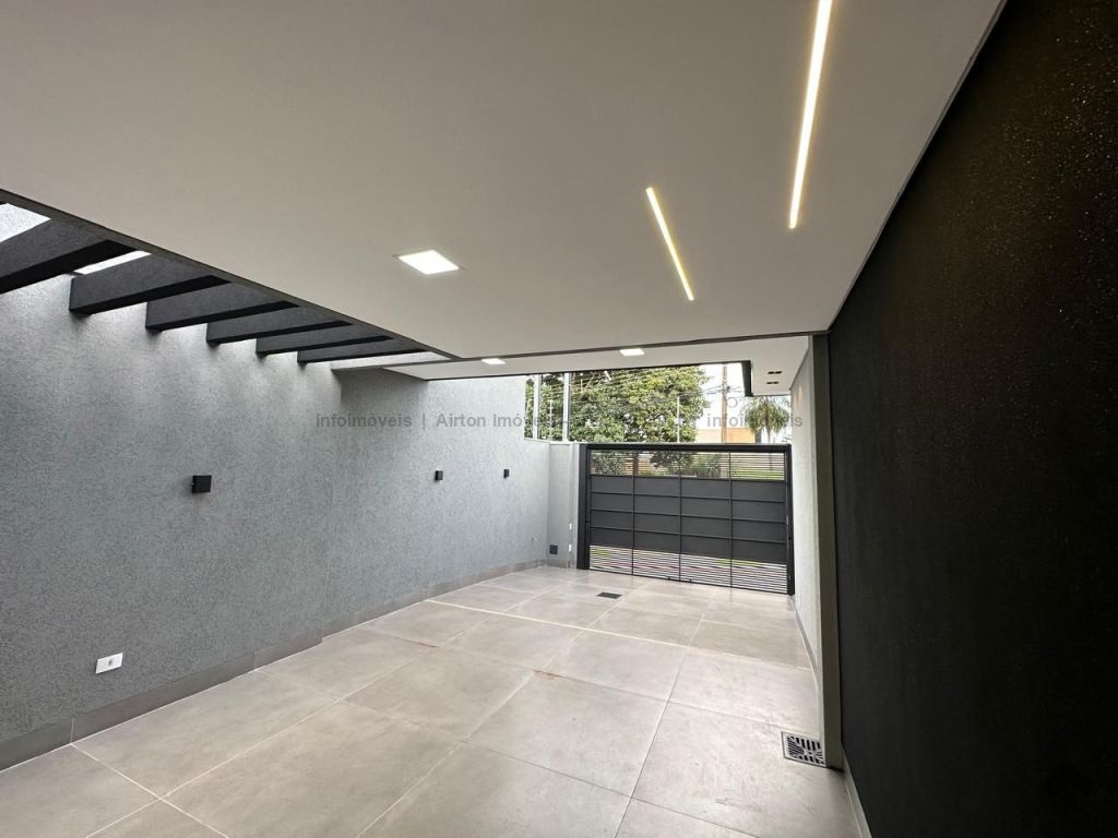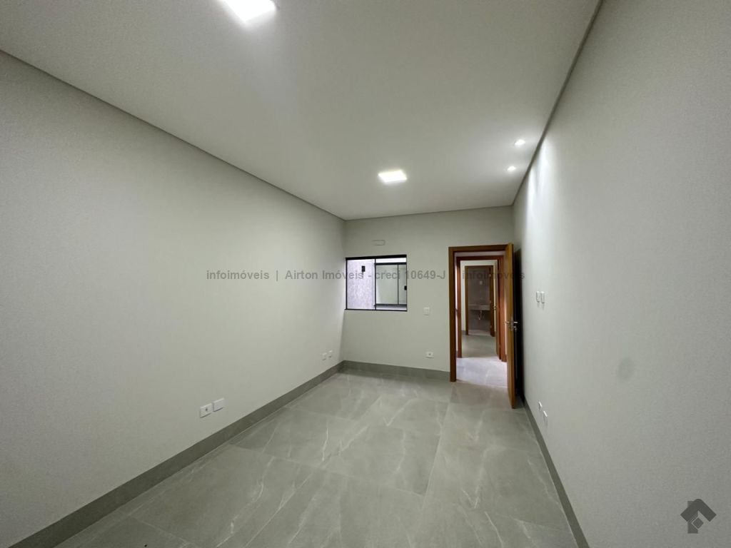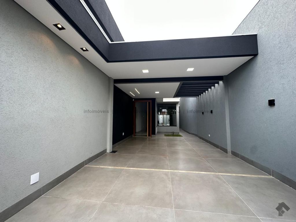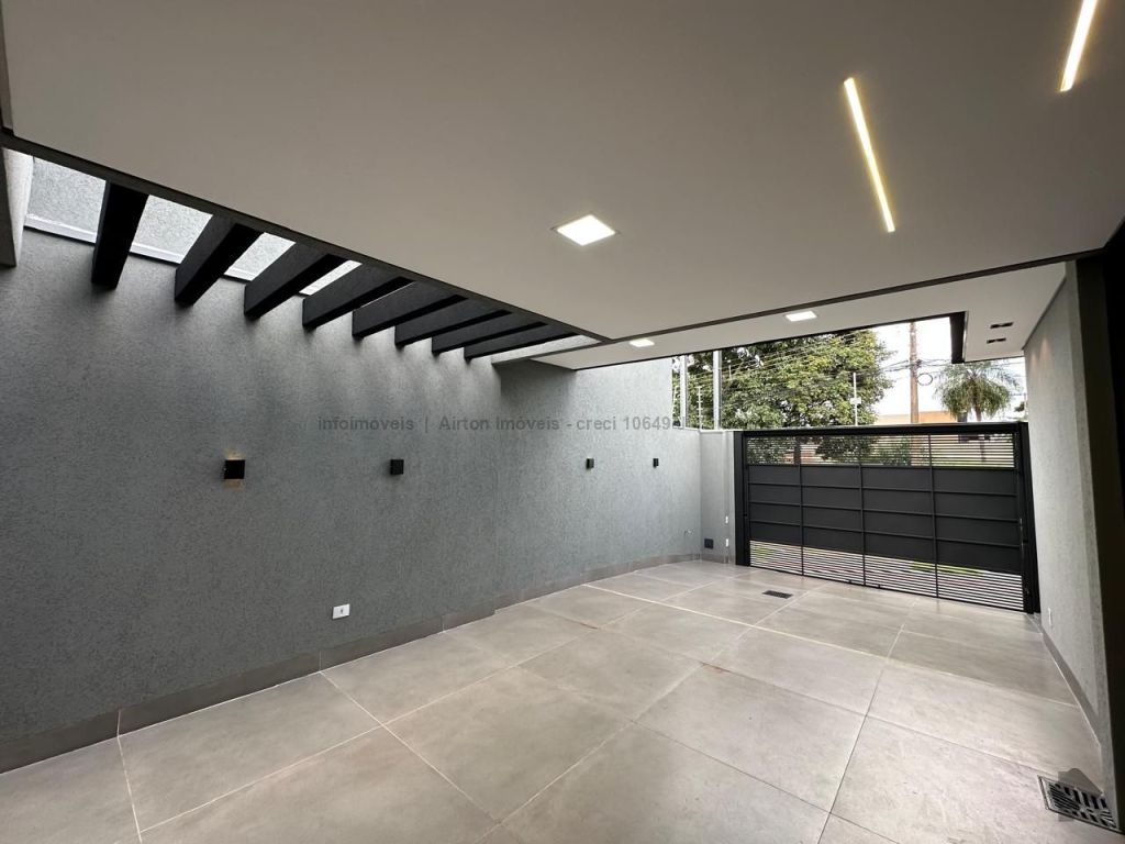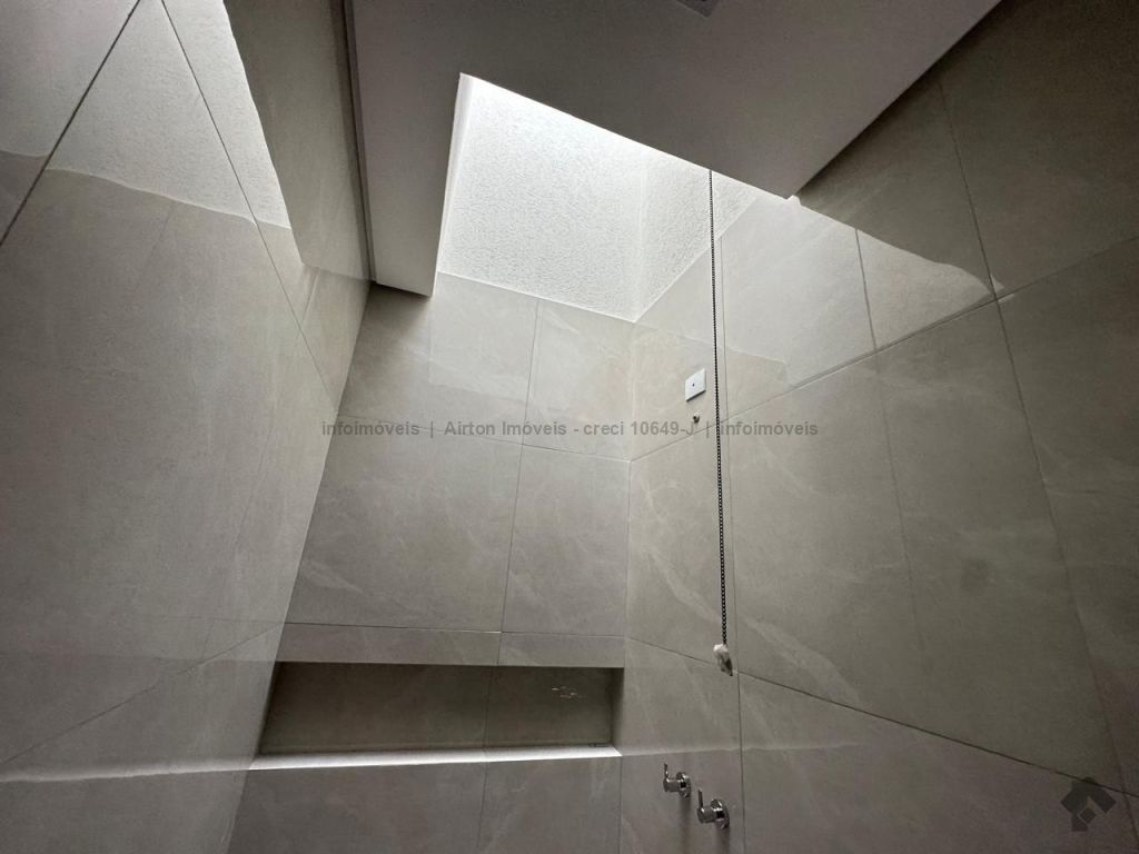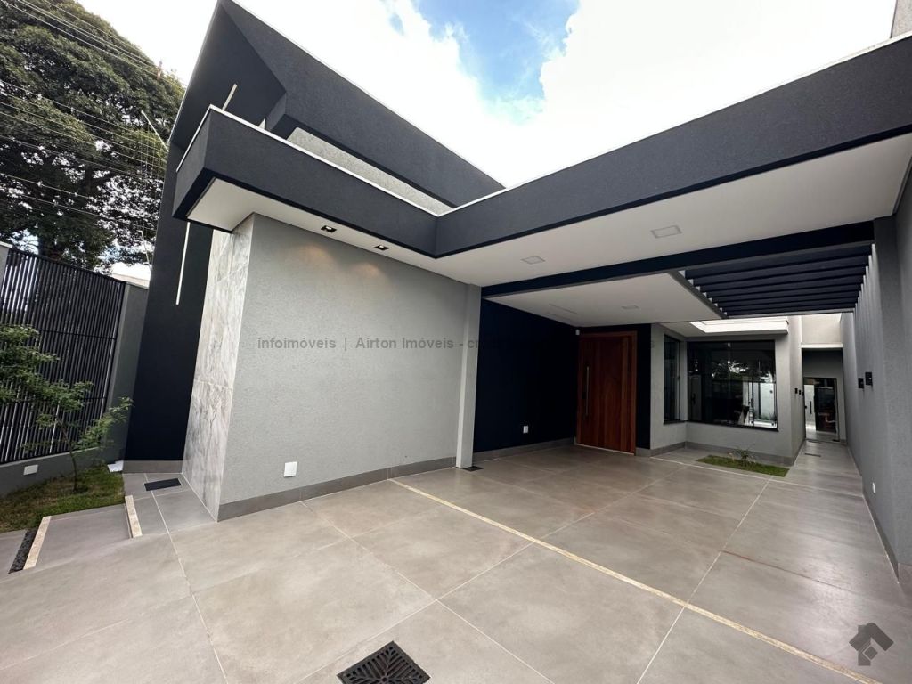 Sala dois ambientes integrada, cozinha, três suítes, área de serviço, espaço gourmet com fachada de vidro, balcão de mármore, lustre sofisticado e acabamento em pedra na ducha, churrasqueira, piscina com cascata e duas vagas de garagem coberta.