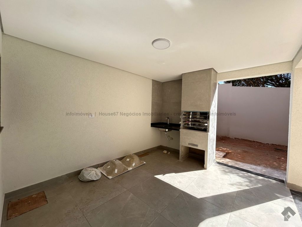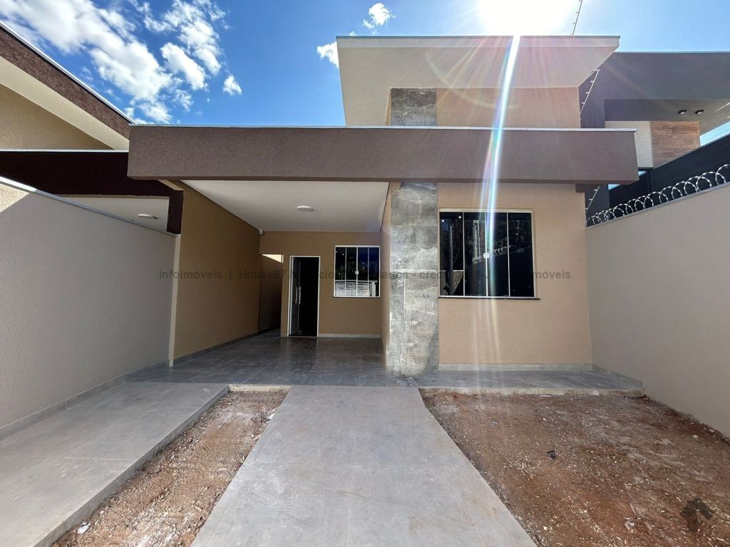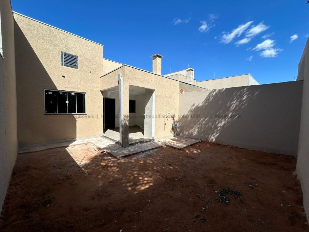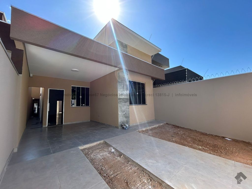 Casa térrea na Rita Vieira, casa com suíte e dois quartos, estar/jantar com pé direito duplo, varanda gourmet, churrasqueira, pia e bancadas em granito, banheiros com pia e nicho em granito, cozinha integrada, área de serviço, duas vagas de garagem, iluminação em LED, quintal, área total de 195 m², área construída de 115 m².