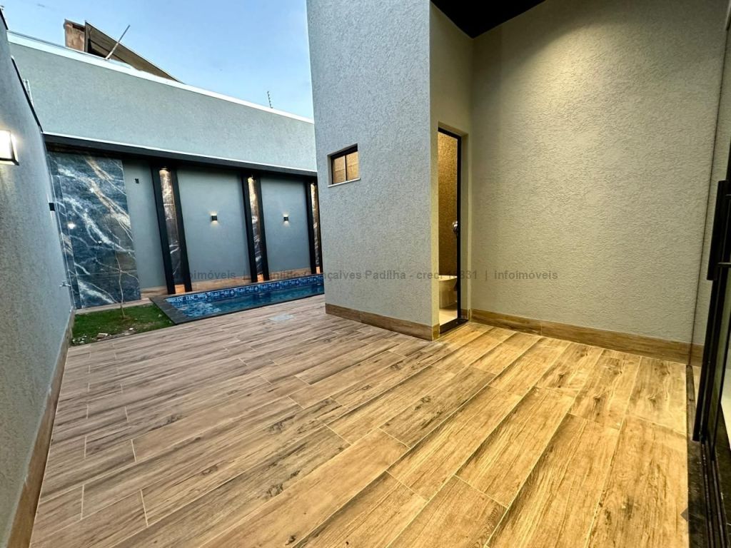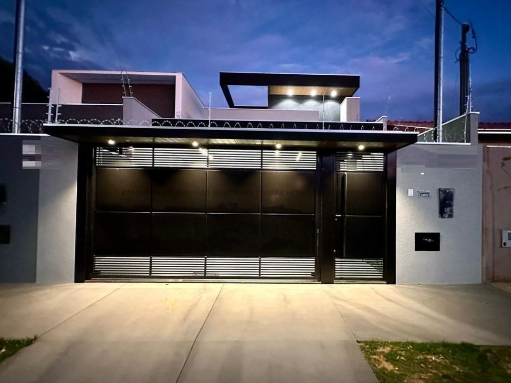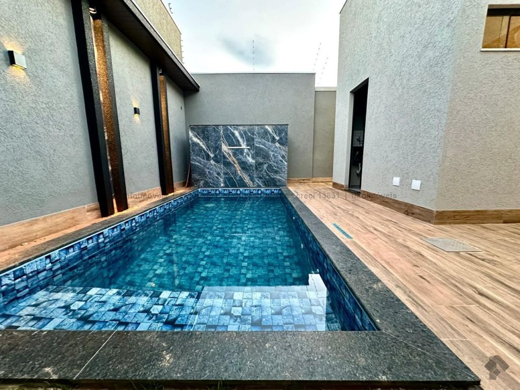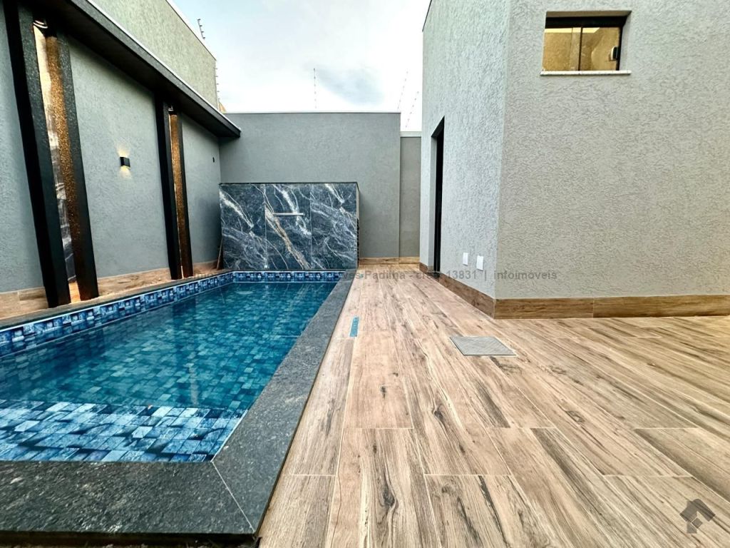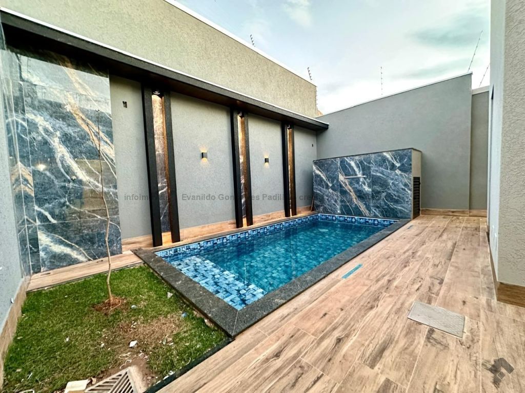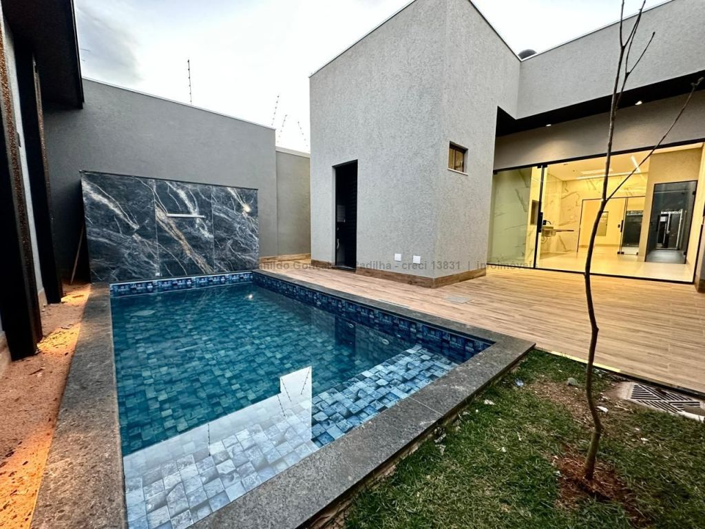 Casa térrea e nova com alto padrão de acabamento no Rita Vieira. 225 m² de área total, 135 m² de área construída, fachada imponente, 3 suítes, sendo a principal bem ampla, jardim de inverno, sala ampla para até 3 ambientes com pé direito alto, cozinha gourmet bem ampla, lavabo para área gourmet, lavanderia ampla, coberta e fechada, piscina ampla de 16 m² em "L", com cascata, jatos de hidro, iluminação e já aquecida, corredor lateral, 3 vagas de garagem cobertas.