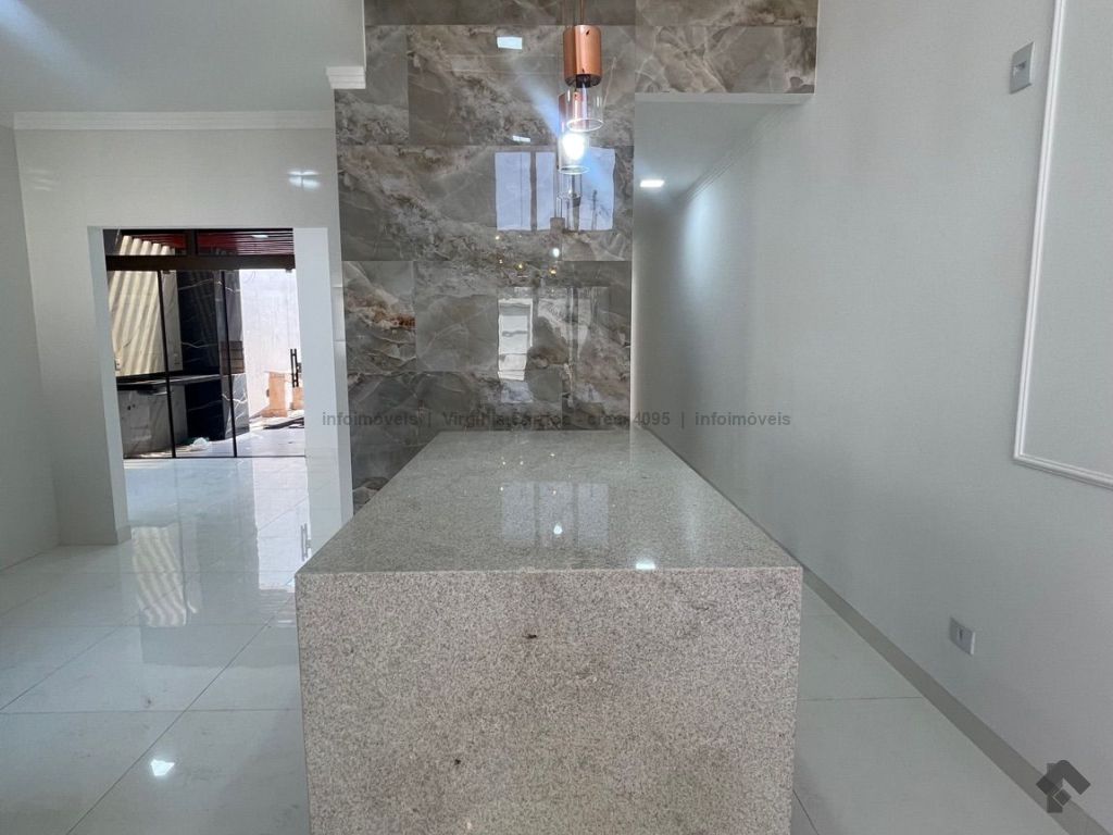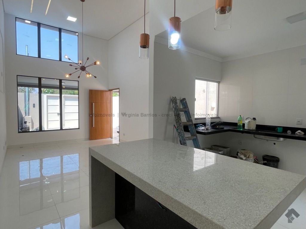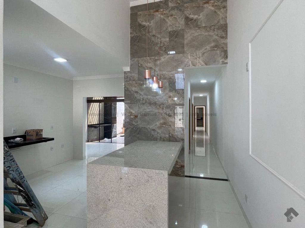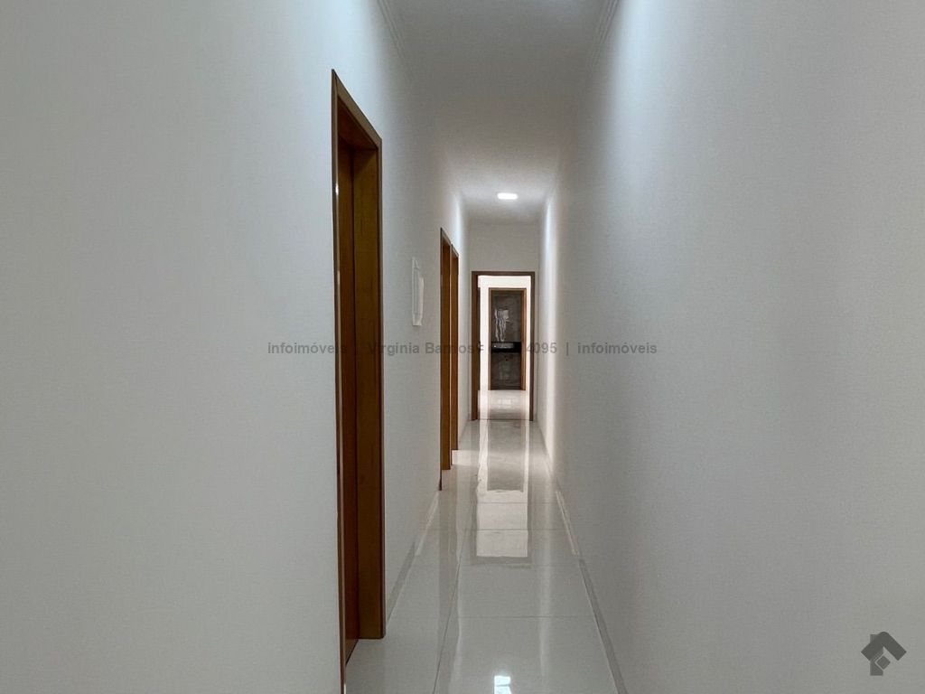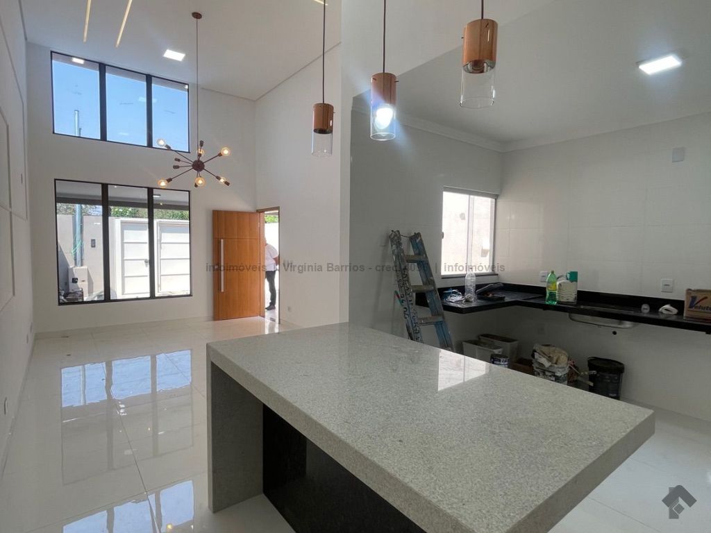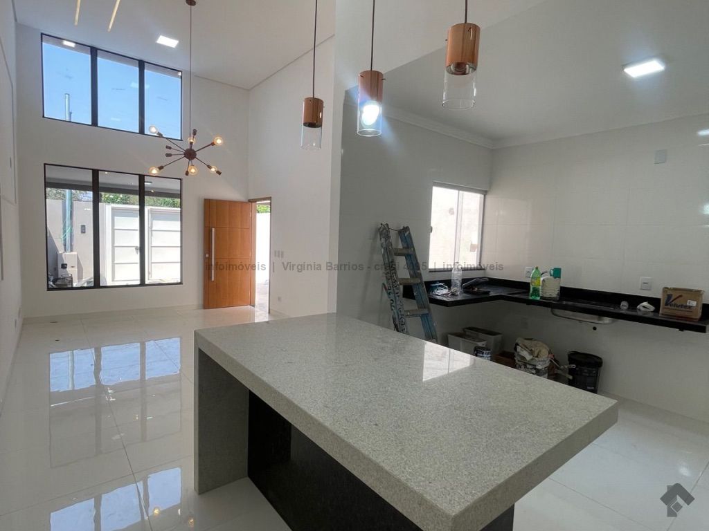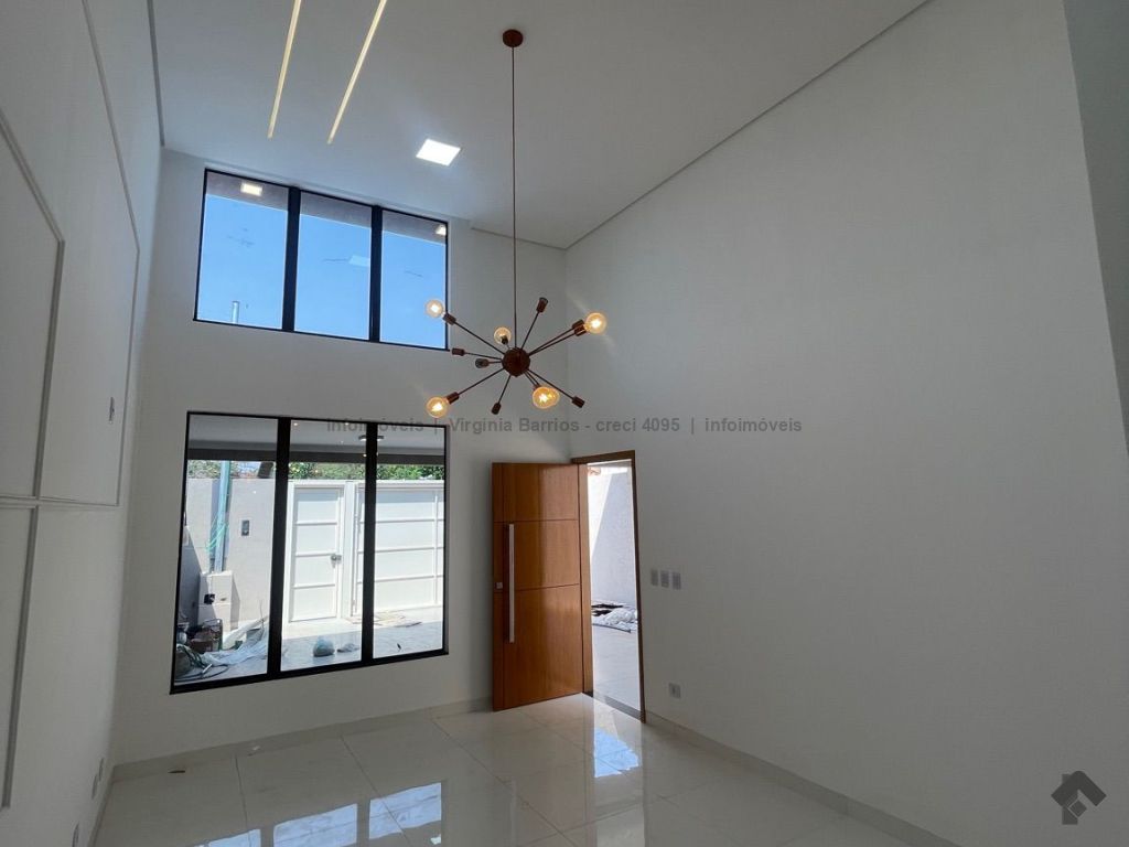 Belíssima casa térrea, com pé direito duplo na sala, ampla cozinha com acesso à churrasqueira, 2 suítes + 1 quarto, banheiro social, área de serviço, garagem para 3 veículos, projeto de iluminação encantador e fachada moderna.