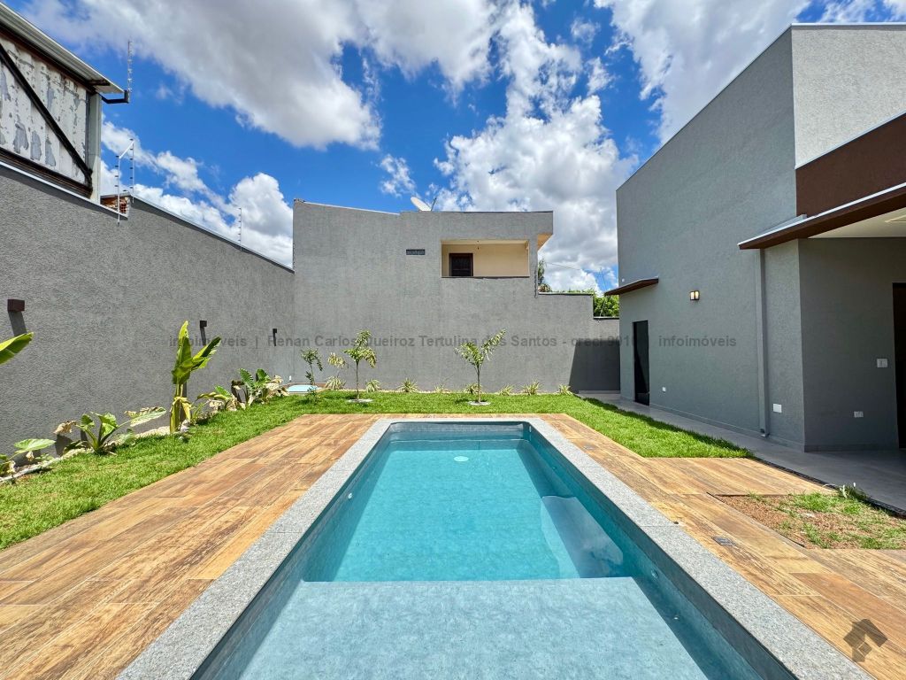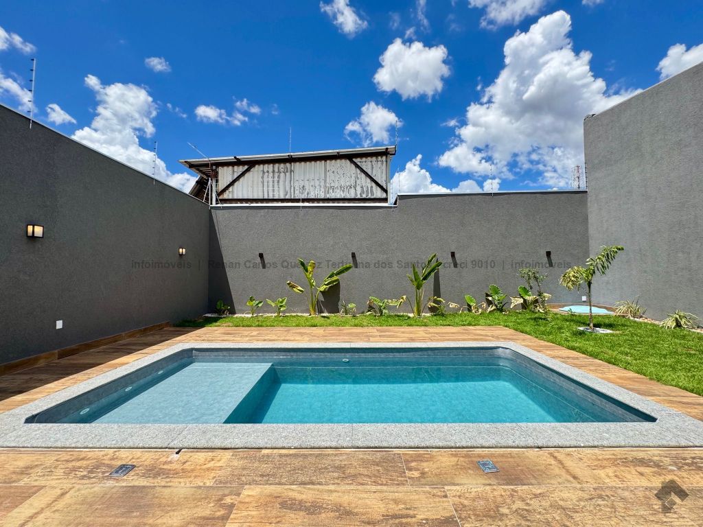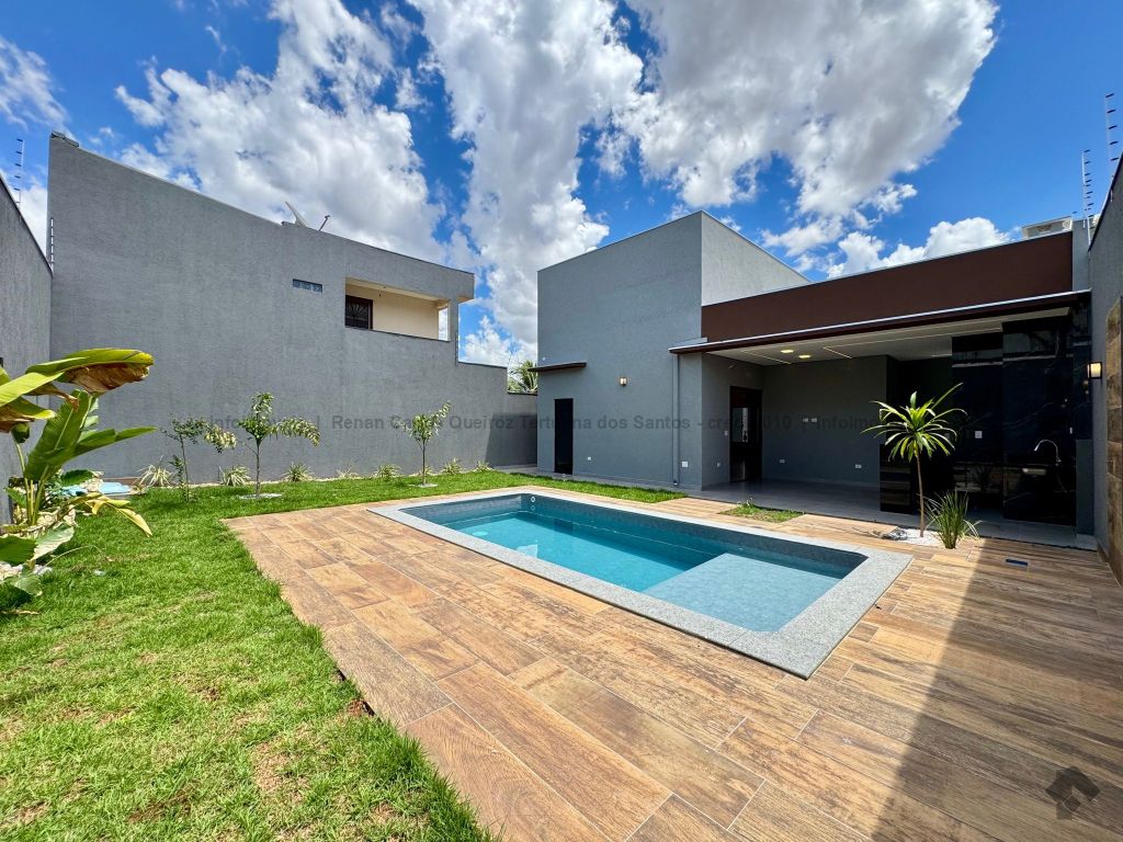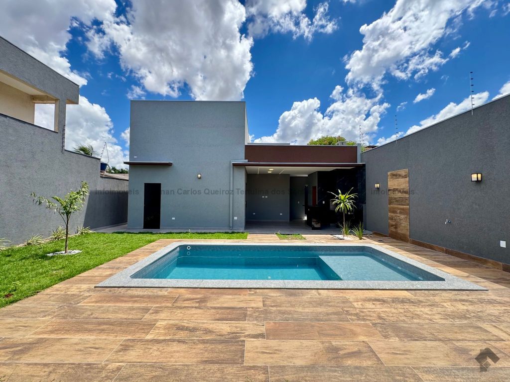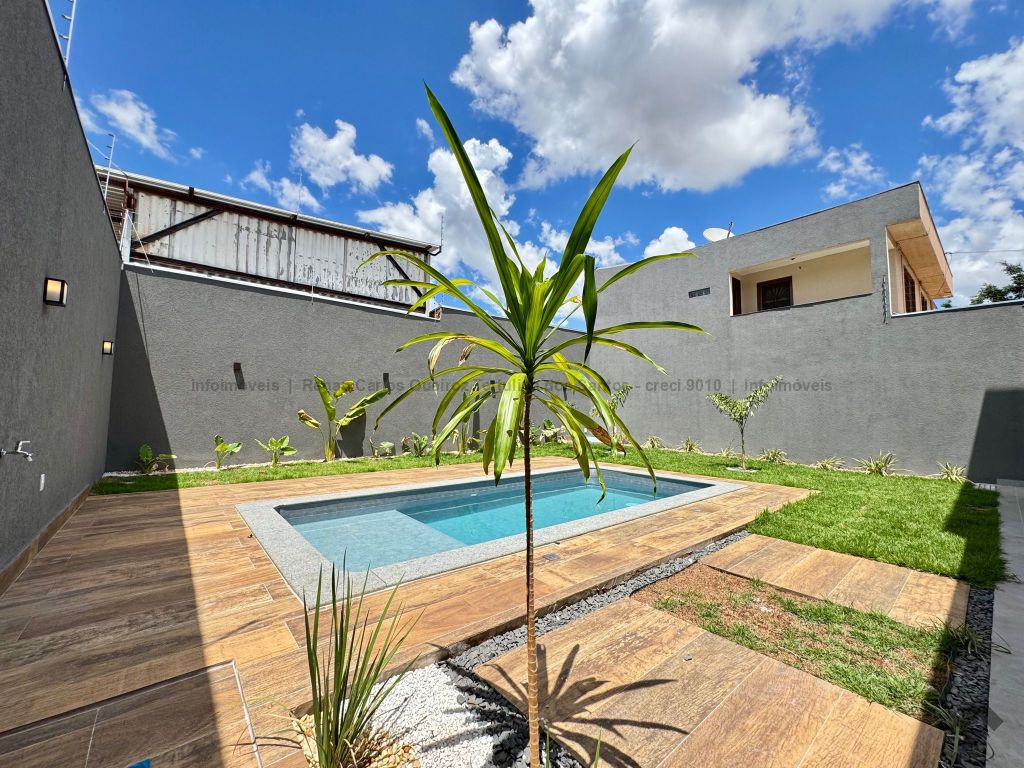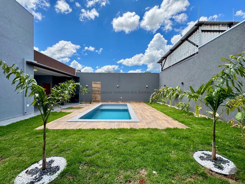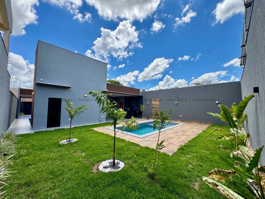 Casa moderna e sofisticada, fachada imponente com volumetria alta. Sala com dois ambientes, pé direito elevado, cozinha, área de serviço. Uma suíte com closet, dois quartos, um banheiro. Varanda gourmet com lavabo. Quintal amplo, piscina com prainha, hidromassagem. Projeto de iluminação e paisagismo, garagem ampla.
