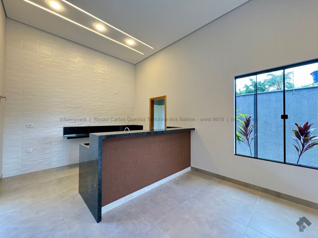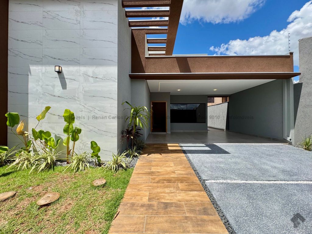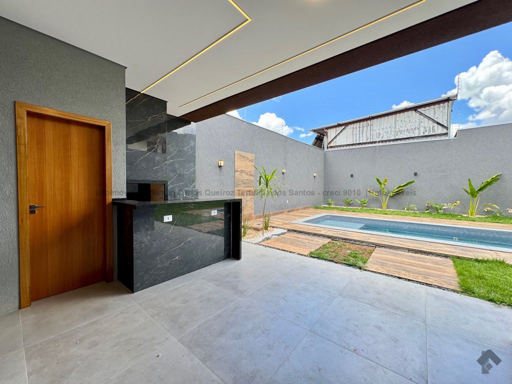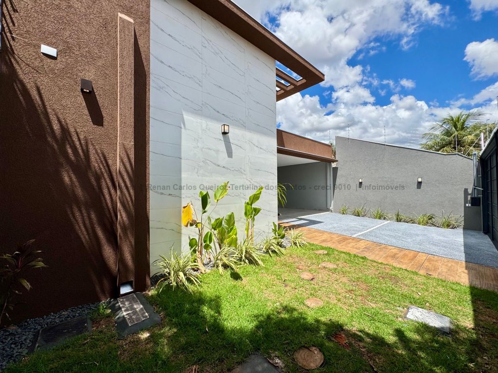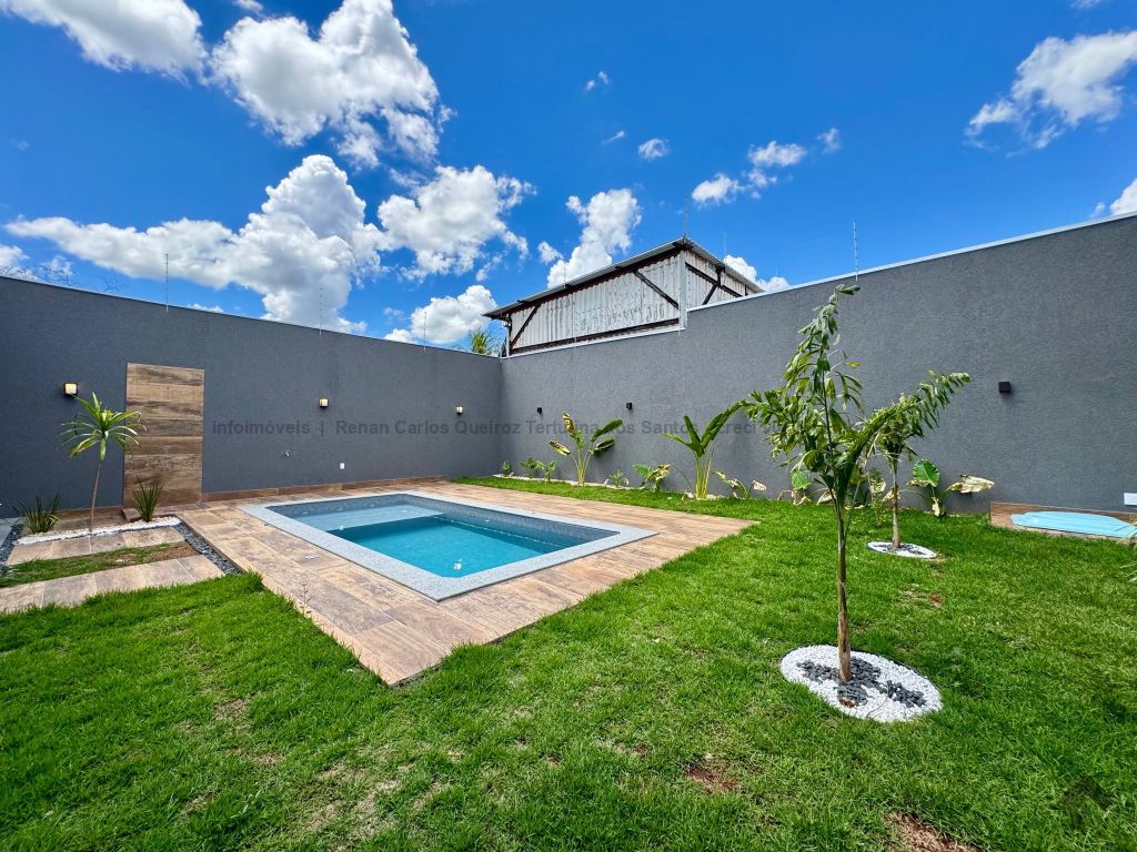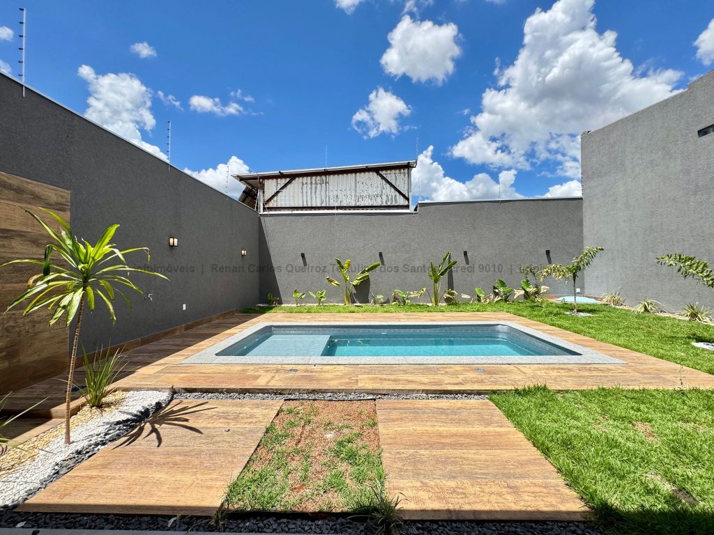 Casa moderna e sofisticada, fachada imponente com volumetria alta. Sala com dois ambientes, pé direito elevado, cozinha, área de serviço. Uma suíte com closet, dois quartos, um banheiro. Varanda gourmet com lavabo. Quintal amplo, piscina com prainha, hidromassagem. Projeto de iluminação e paisagismo, garagem ampla.