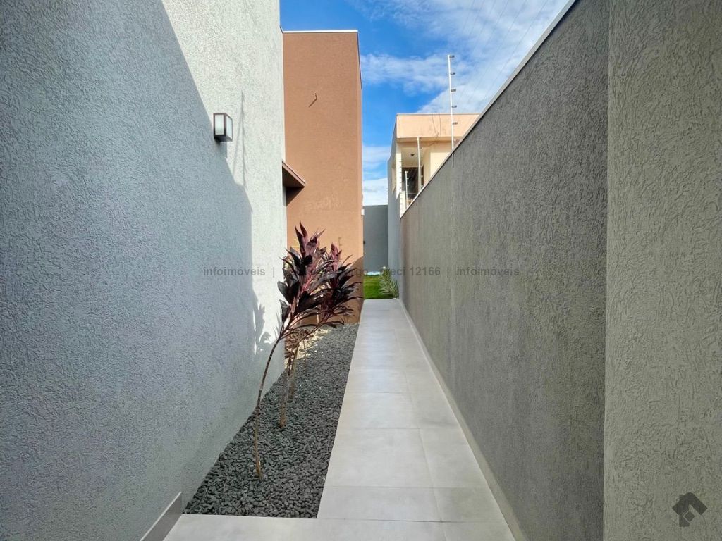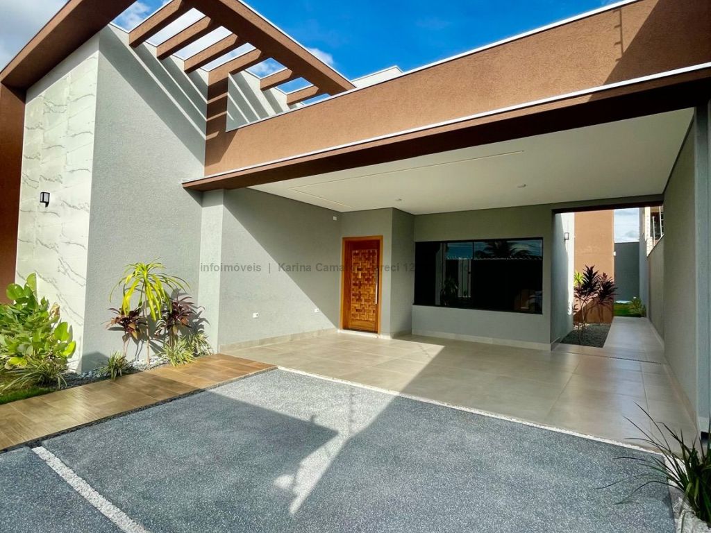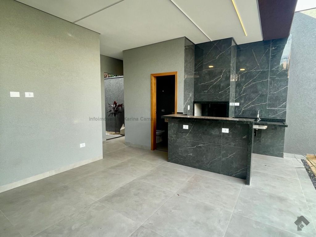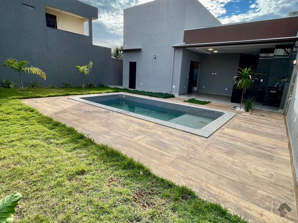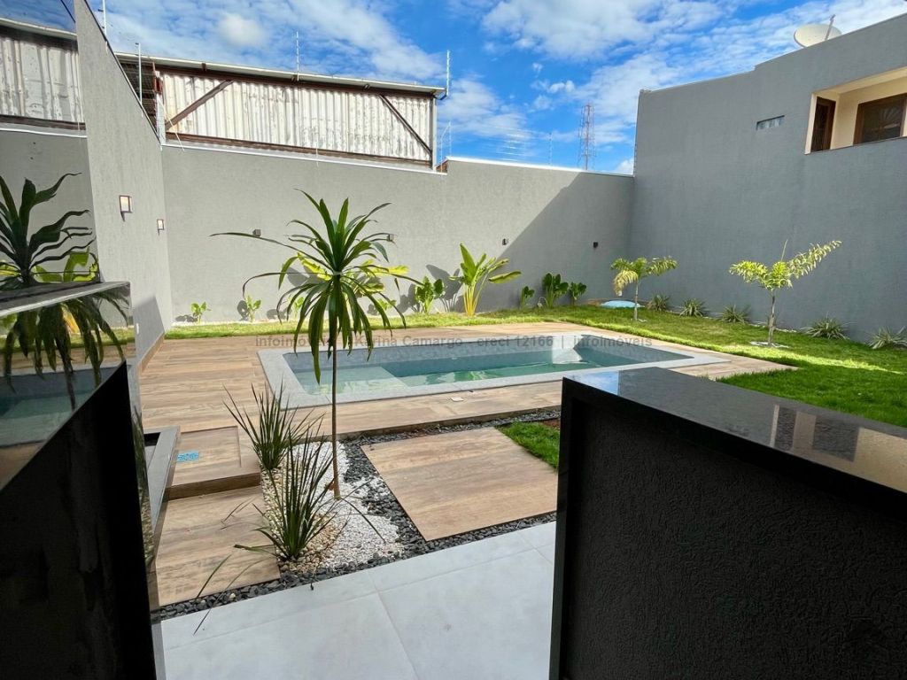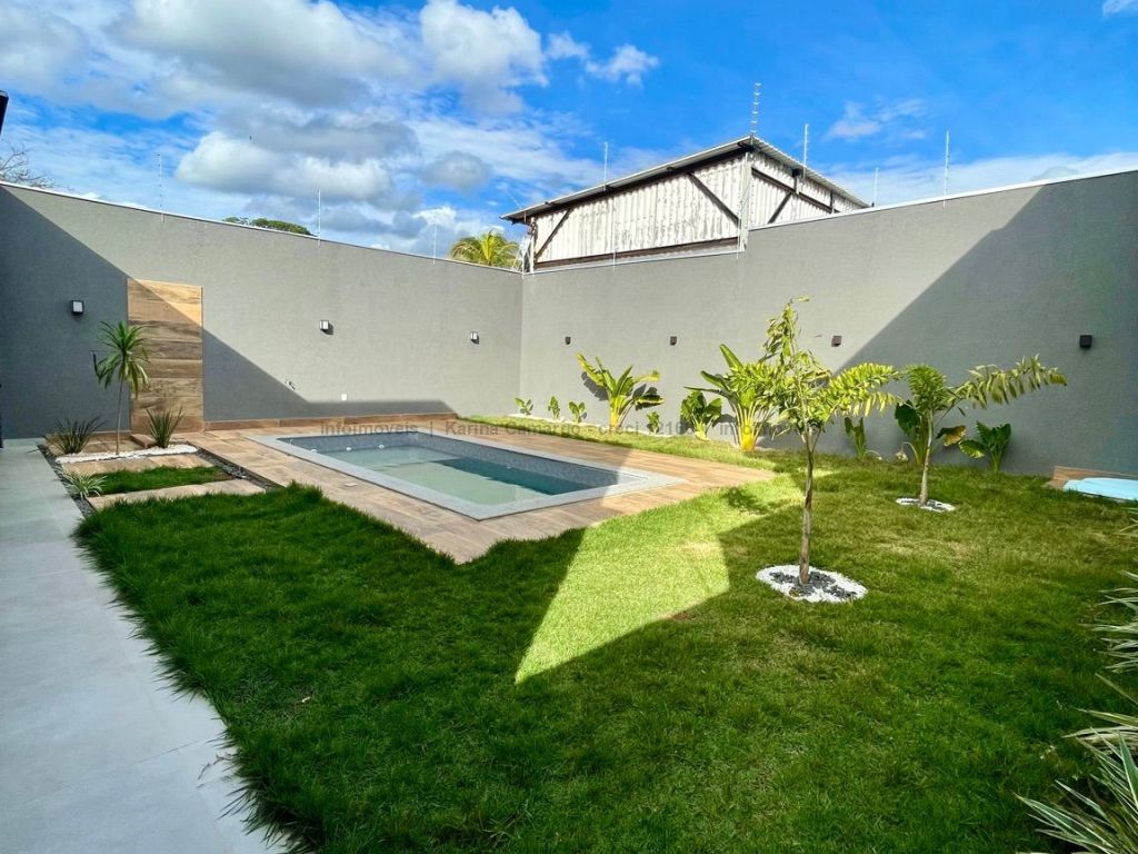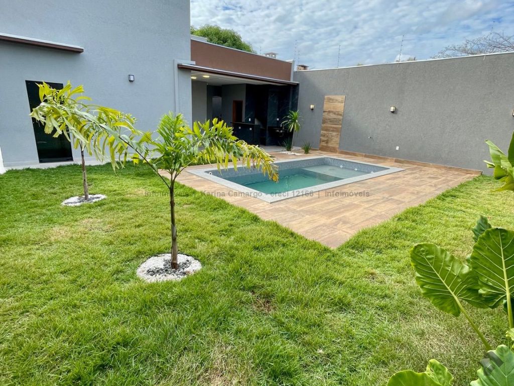 Casa térrea, fachada imponente e acabamento de alto padrão, área total de 360 m², área construída de 155 m², quatro vagas de garagem, três quartos, sendo uma suíte com closet. Sala ampla para dois ambientes com pé direito alto, com sanca e lustre. Banheiro social, cozinha estilo americana com pia e bancada em mármore, lavanderia fechada, espaço gourmet amplo com ilha e projeto de iluminação em LED, lavabo, piscina com prainha e hidromassagem.