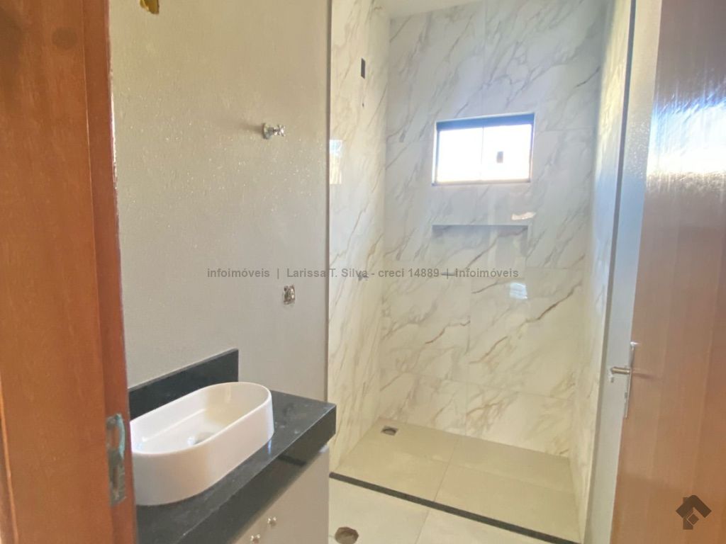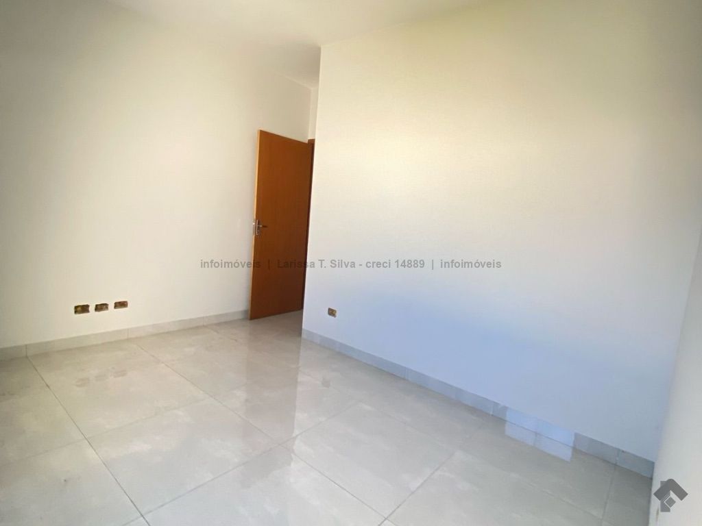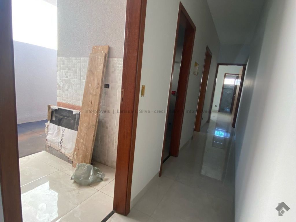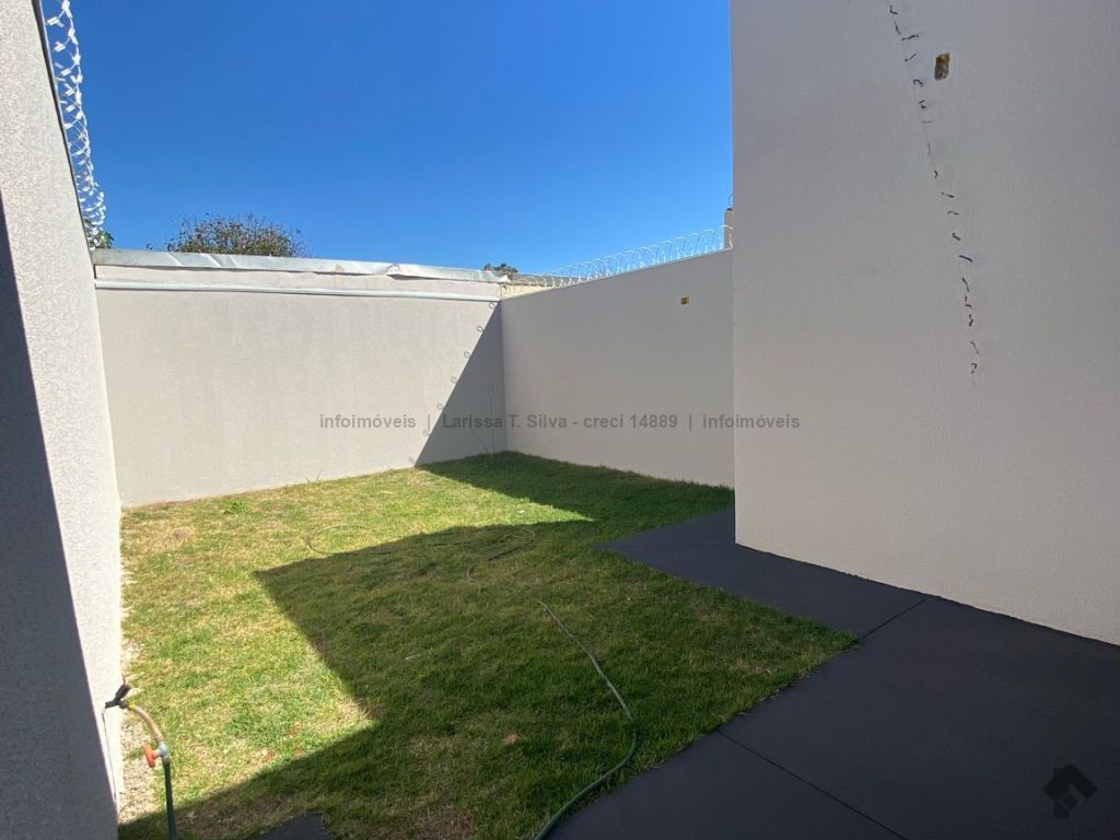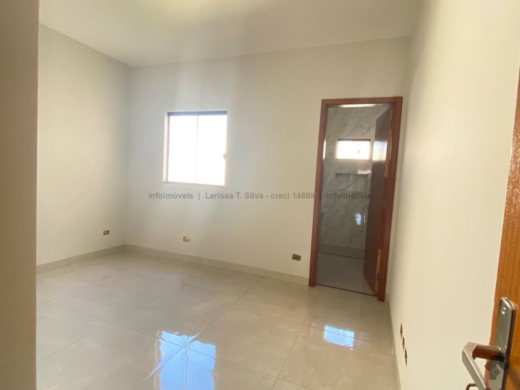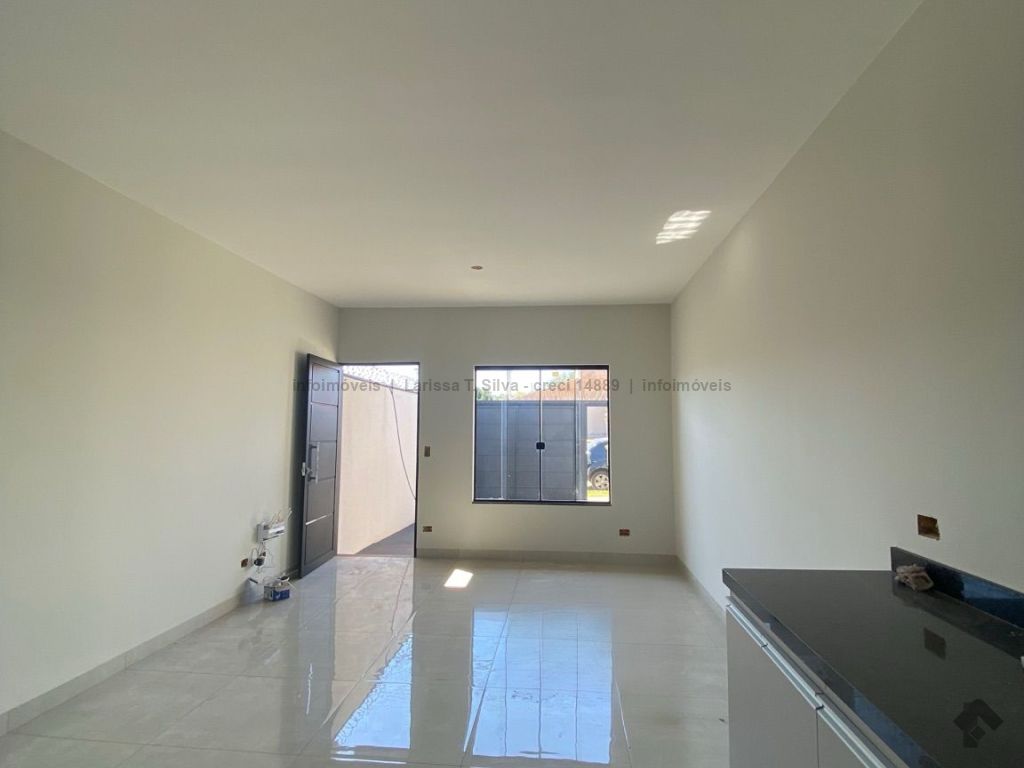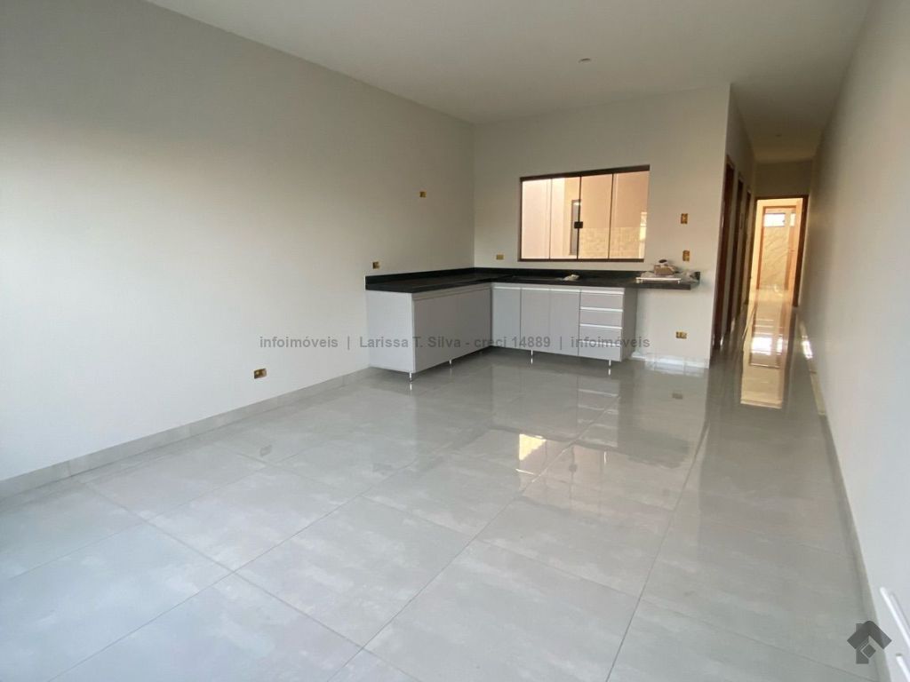 Residência contendo sala e cozinha integradas, área de serviço coberta, banheiro social, quarto e suíte, garagem para até dois carros e espaço ao fundo para possível construção.