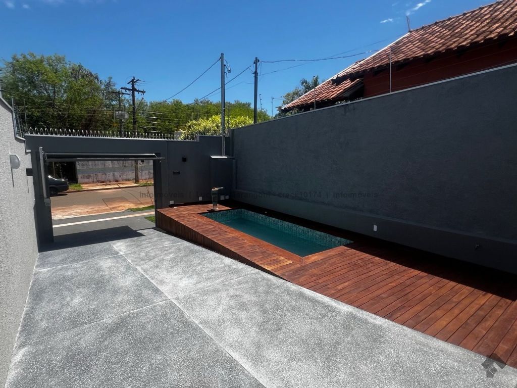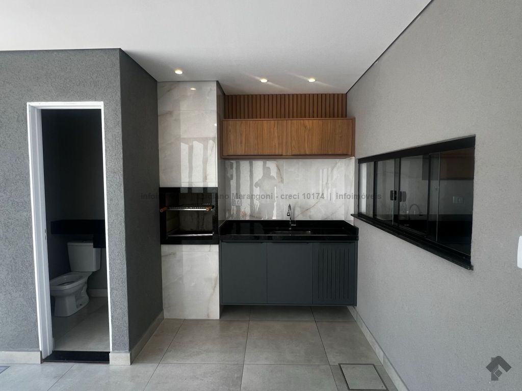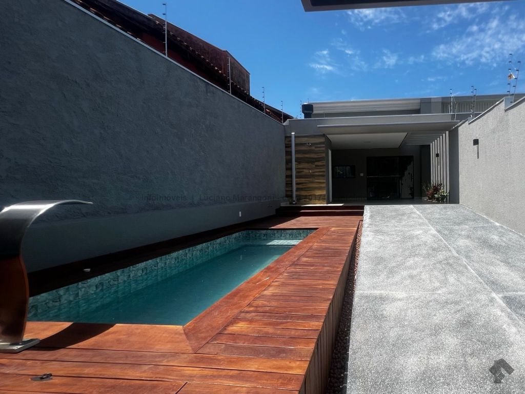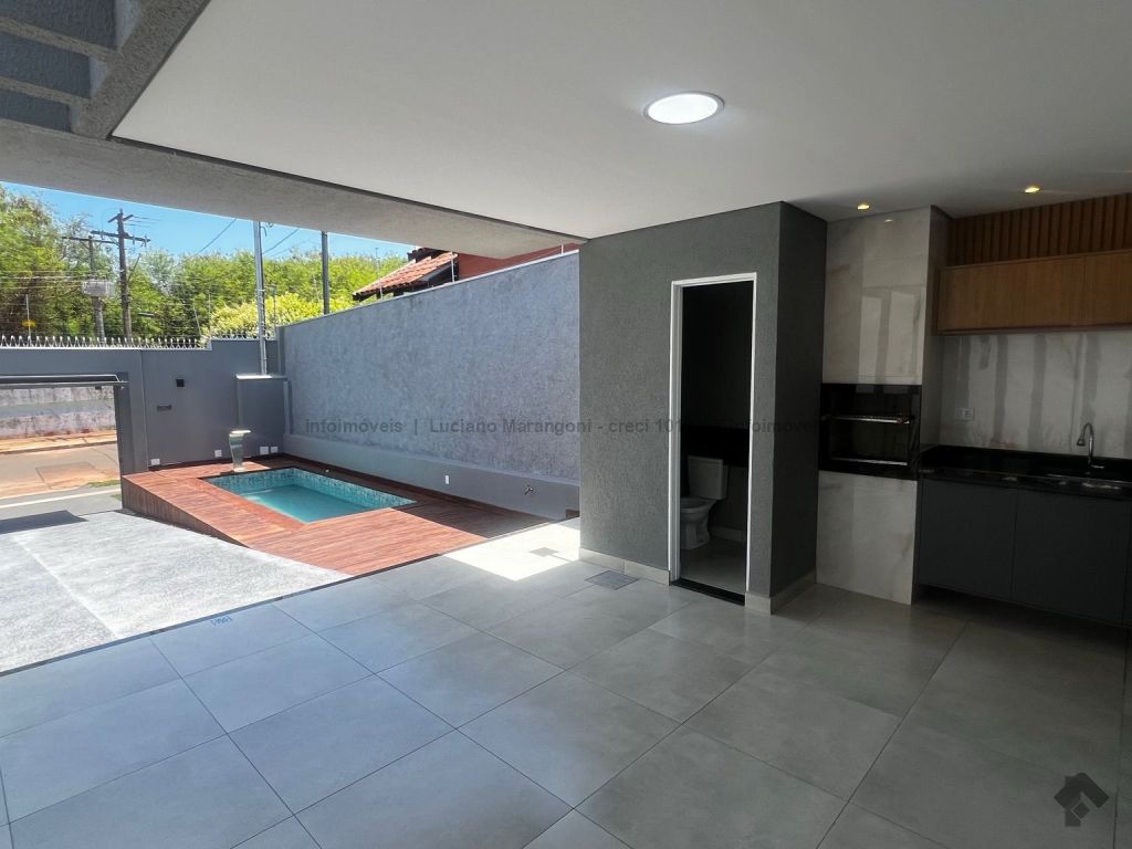Piscina com acabamento em madeira nobre, varanda com pia, churrasqueira e armários, lavabo.